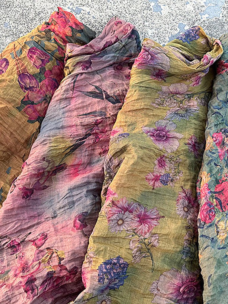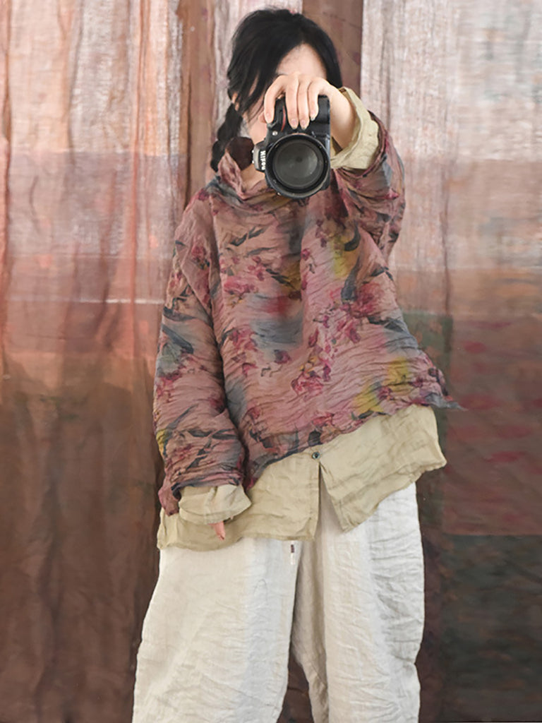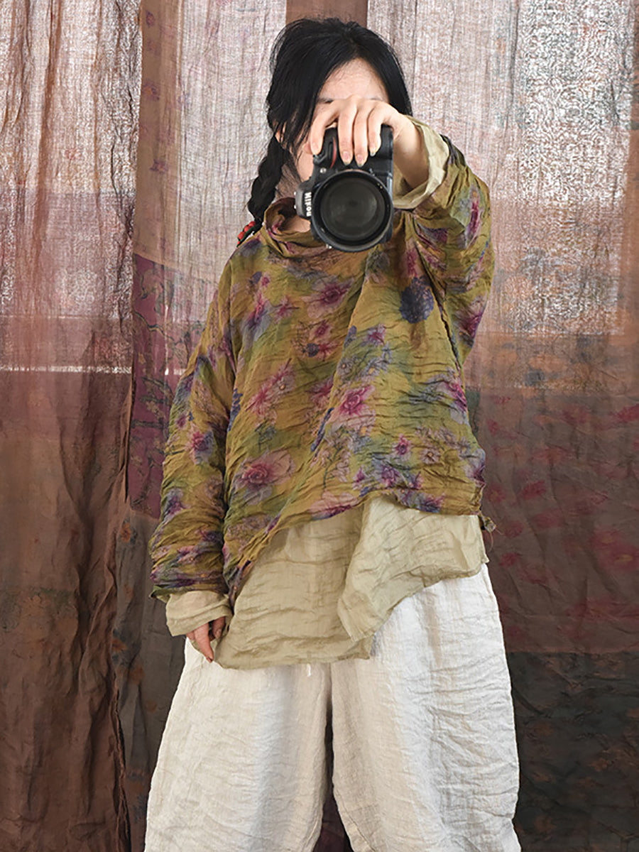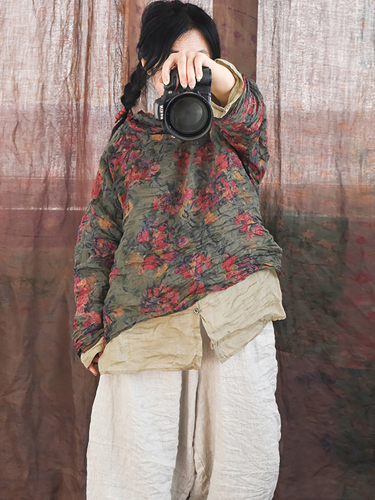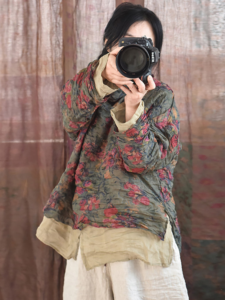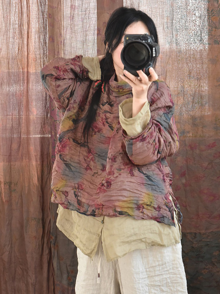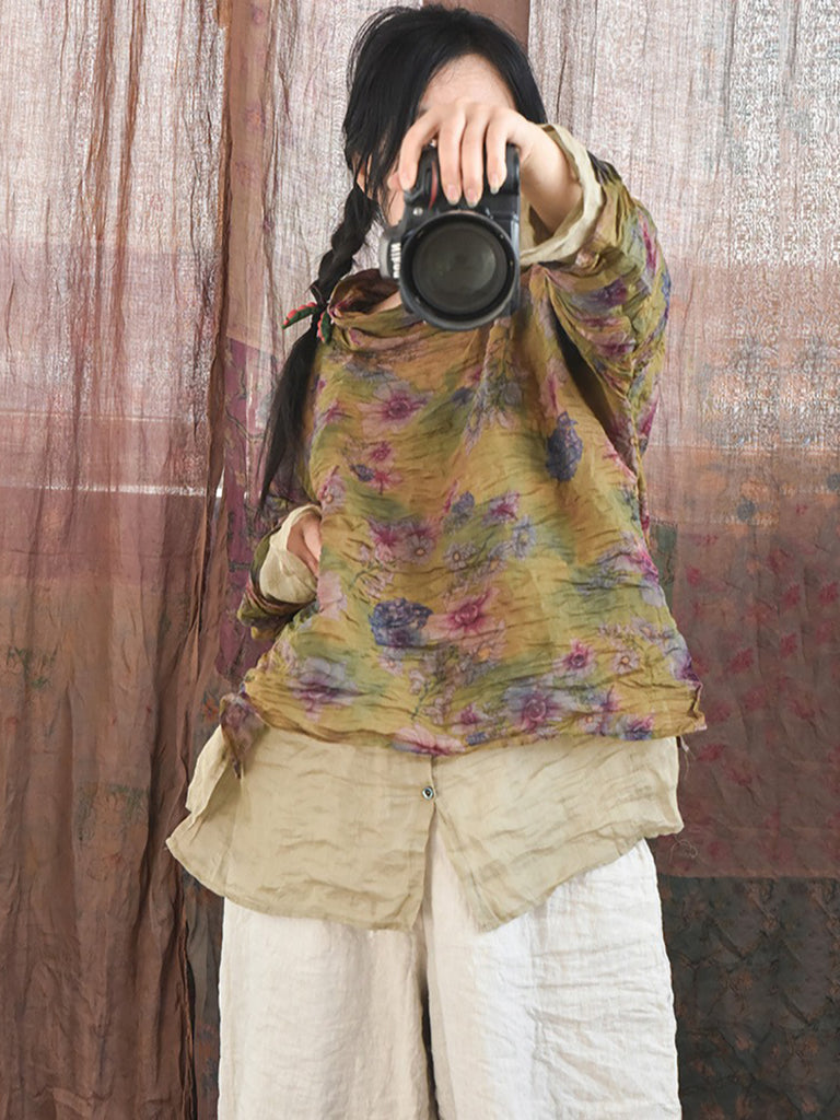 This high-quality shirt is made of ramie fabric and features a classic pie collar and long raglan sleeves for a vintage touch. The timeless floral pattern adds a touch of elegance, making it perfect for wearing in the spring or fall seasons.