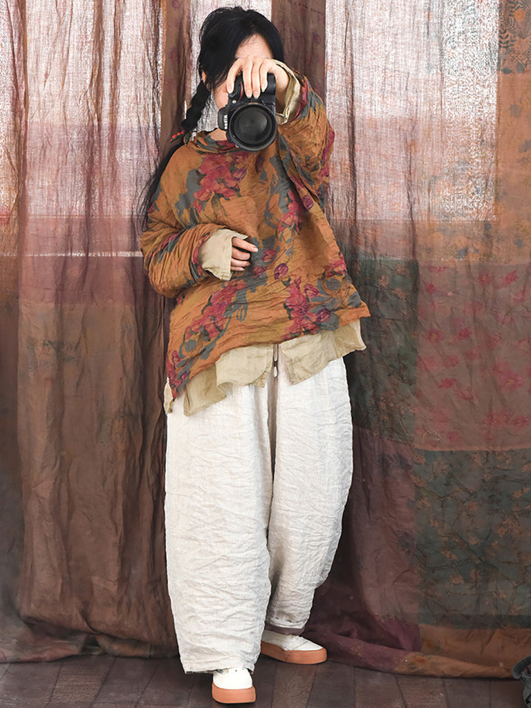 Women Vintage Spring Floral Pie Collar Ramie Shirt