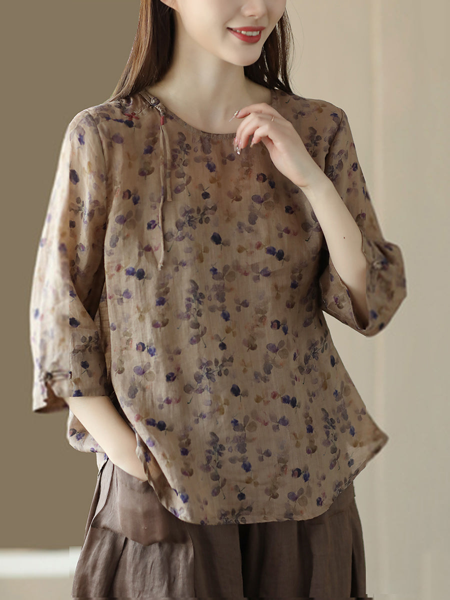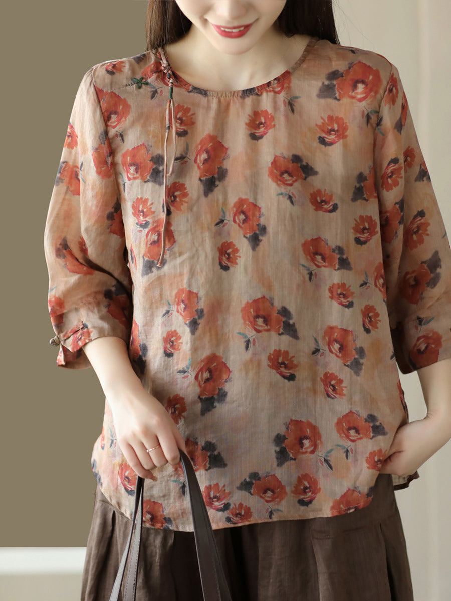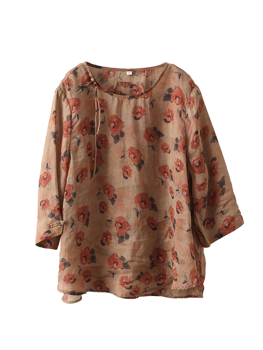 Women Vintage Summer Floral Frog Pullover Linen Shirt