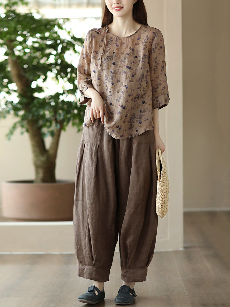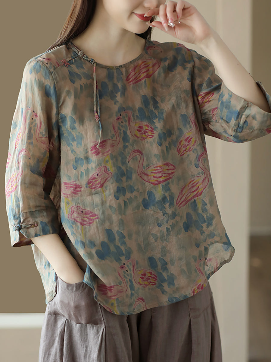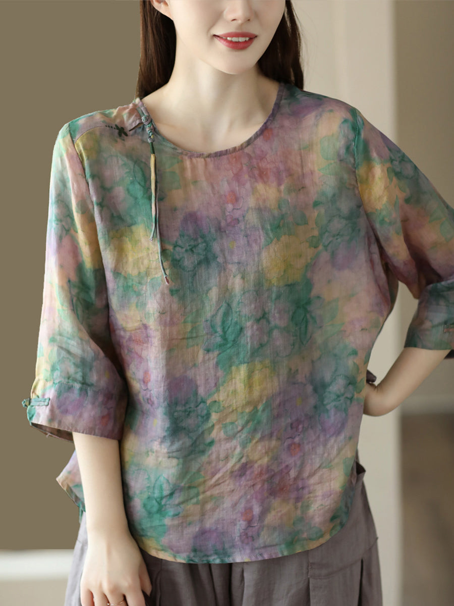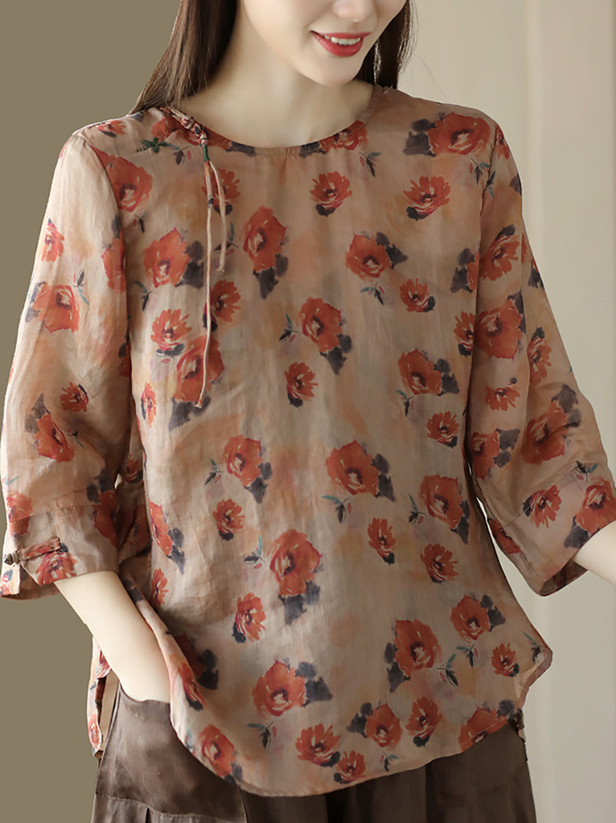 Women Vintage Summer Floral Frog Pullover Linen Shirt
