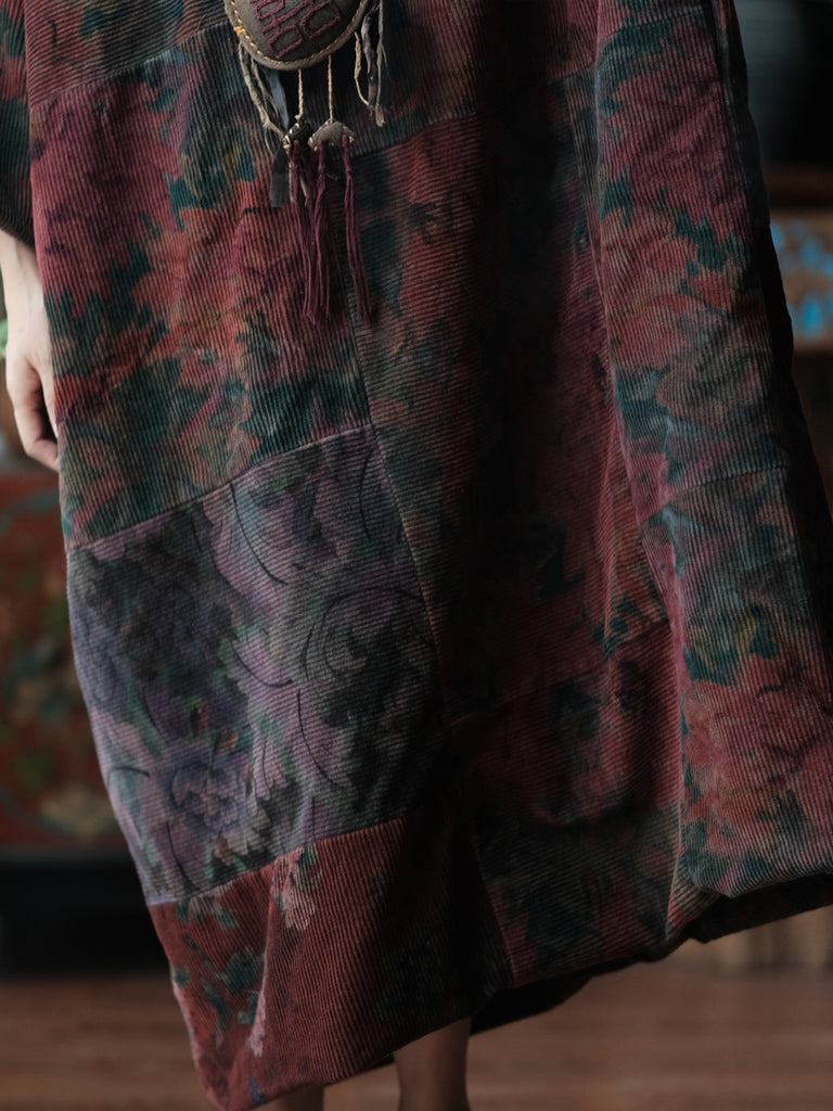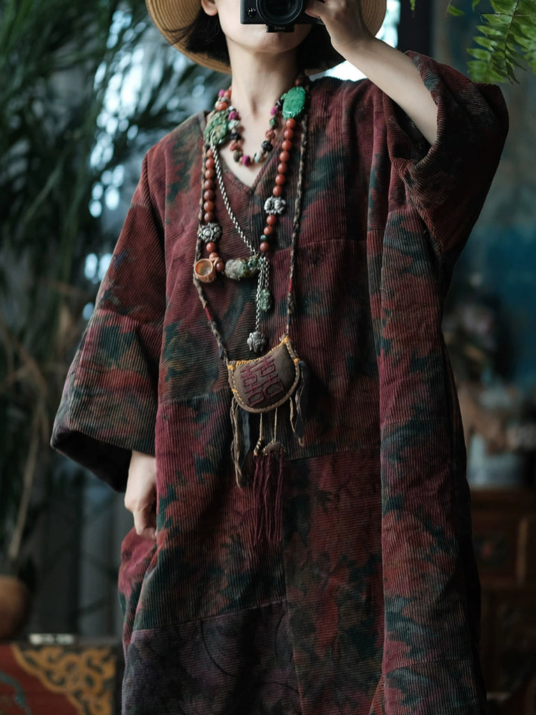 Women Vintage Winter Flower V-Neck Cotton Robe Coat
