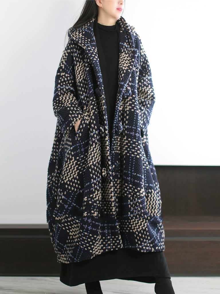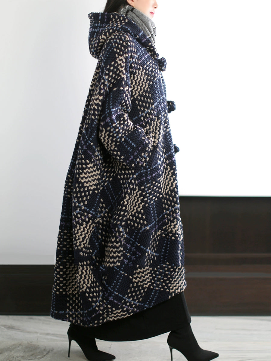 Women Vintage Winter Plaid Hooded Overcoat