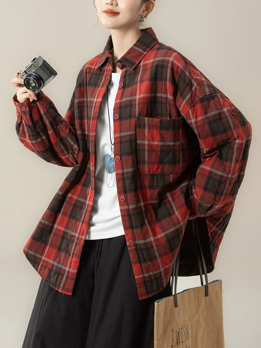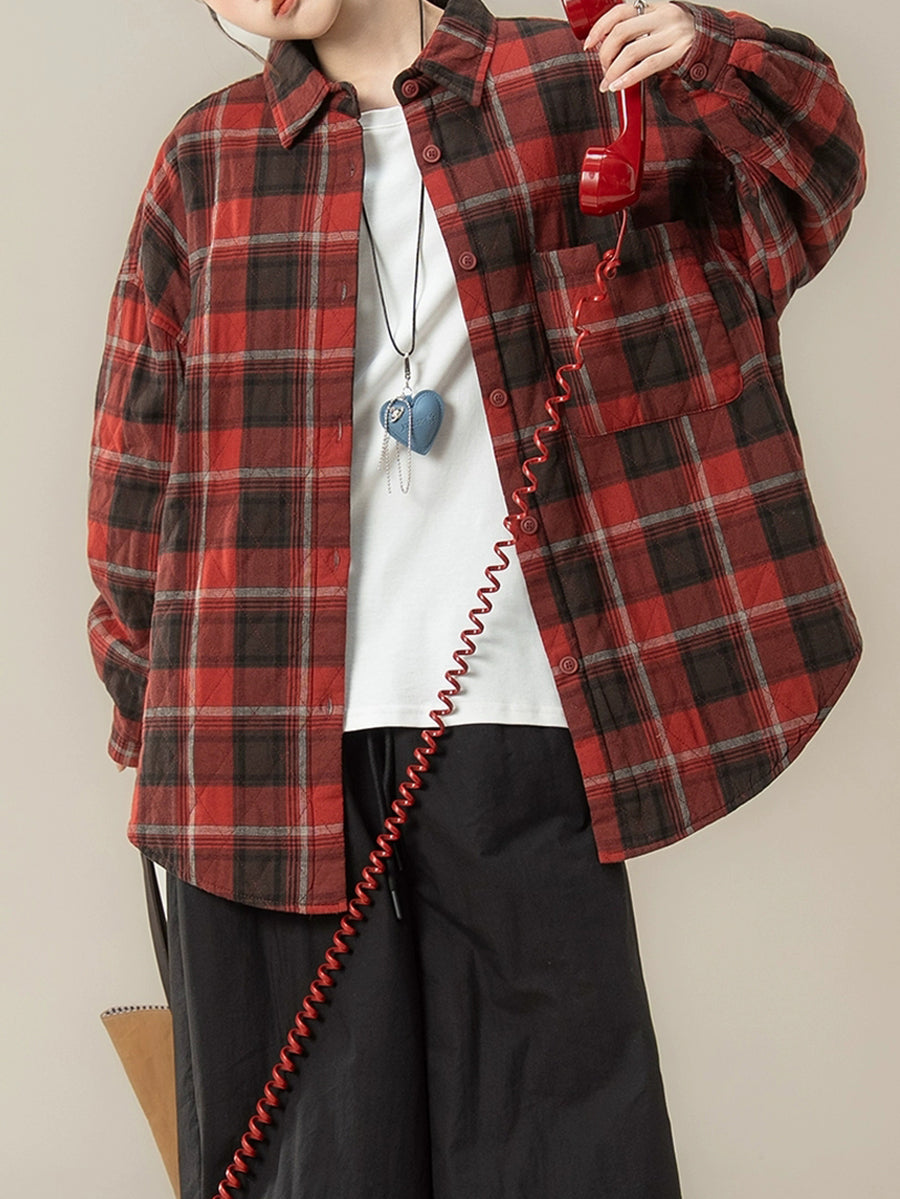 This vintage-inspired women's winter shirt coat features a classic plaid pattern and a turn-down collar. Designed with full raglan sleeves, it combines retro style with practical warmth, making it ideal for autumn and winter wear.