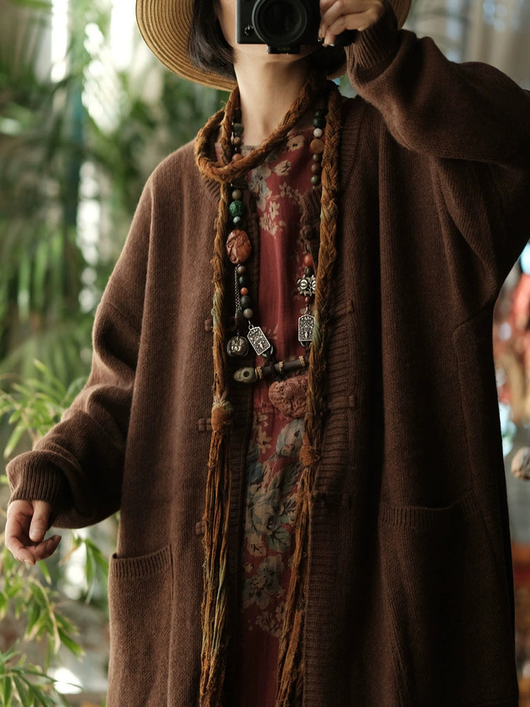 Women Vintage Winter Pure Color O-Neck Wool Knitted Coat