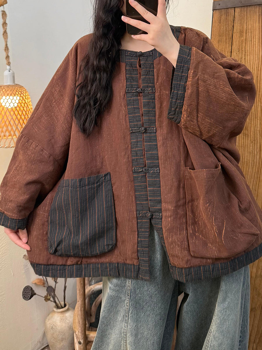 Women Vintage Winter Stripe Spliced O-Neck Padded Coat