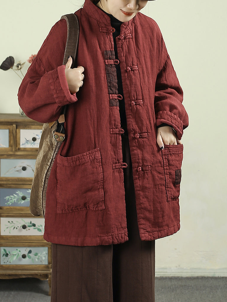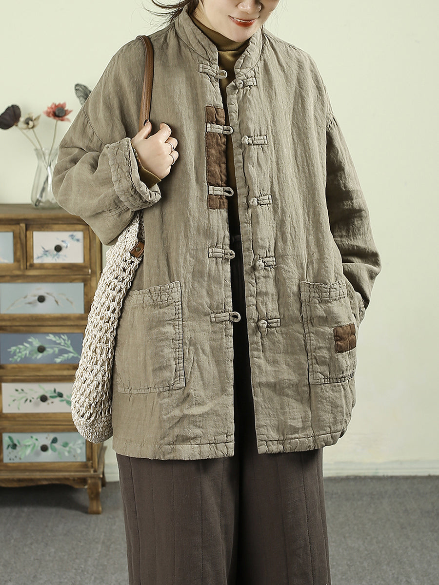 Women Winter Ethnic Patchwork 100%Linen Stand Collar Coat