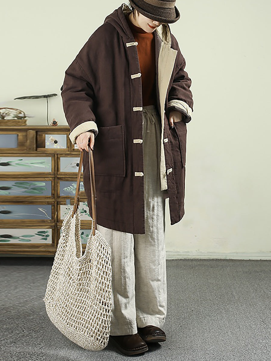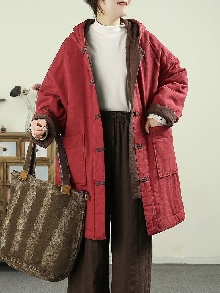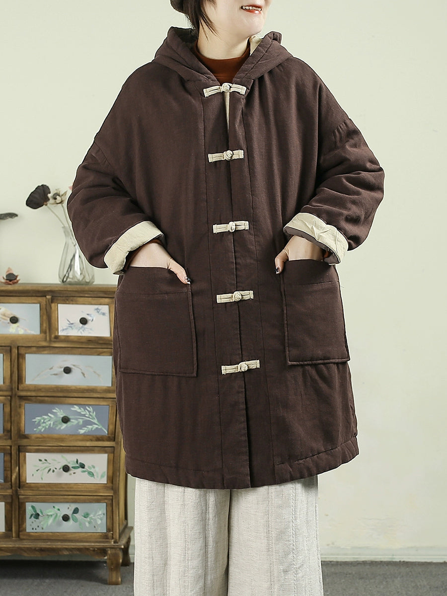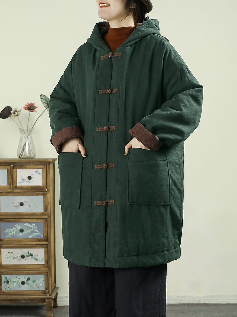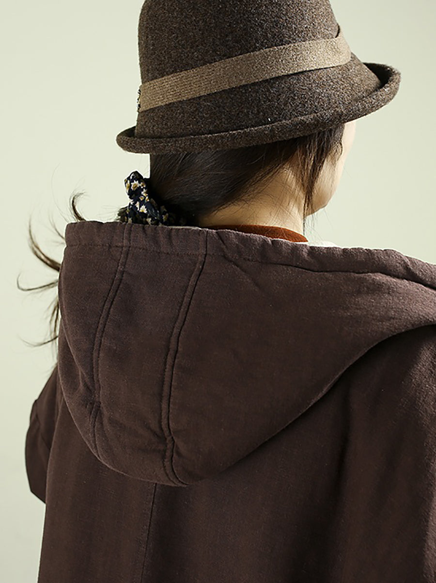 Women Winter Pure Color Hooded 100%Linen Padded Overcoat