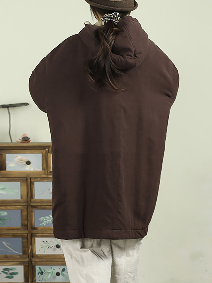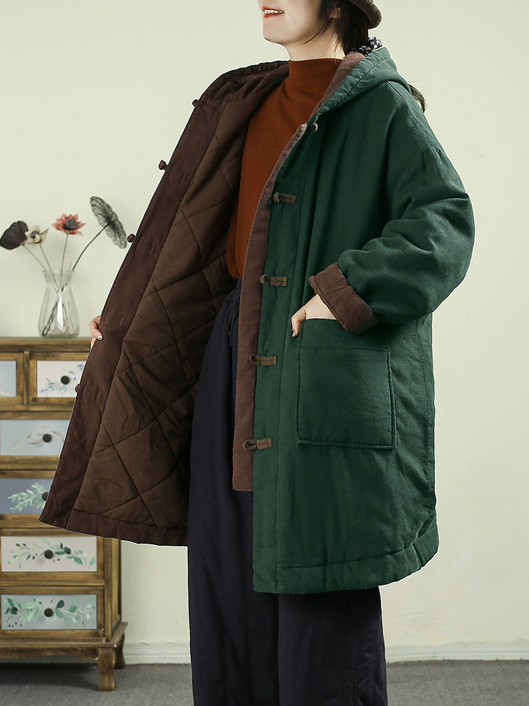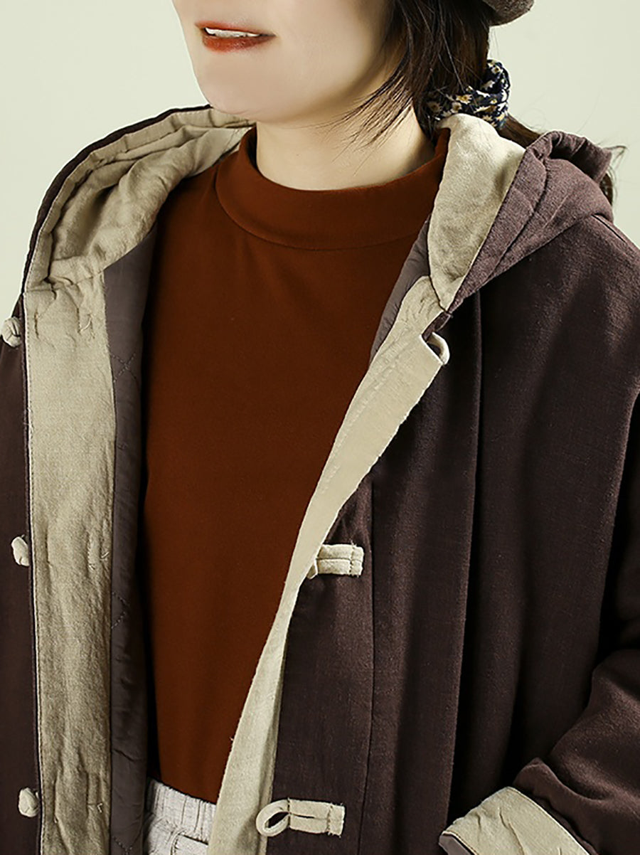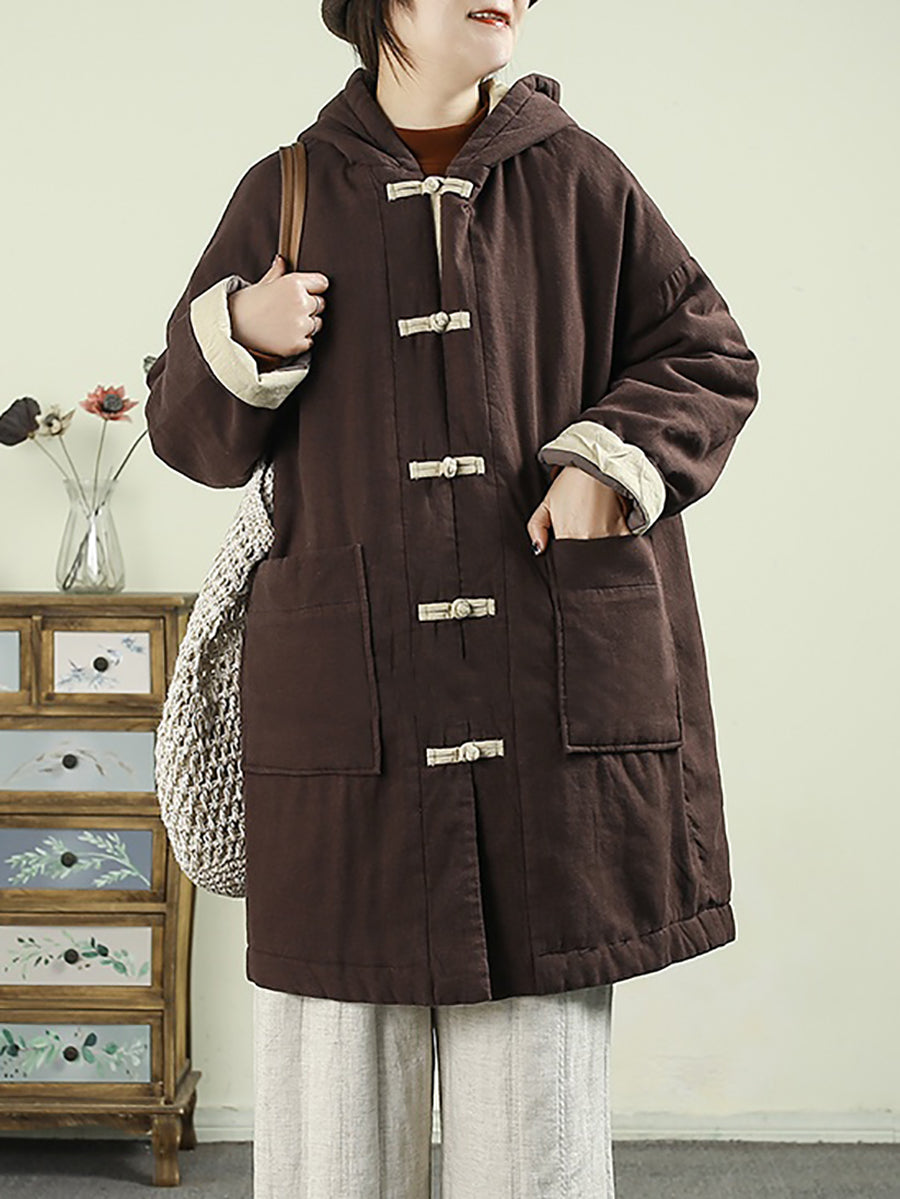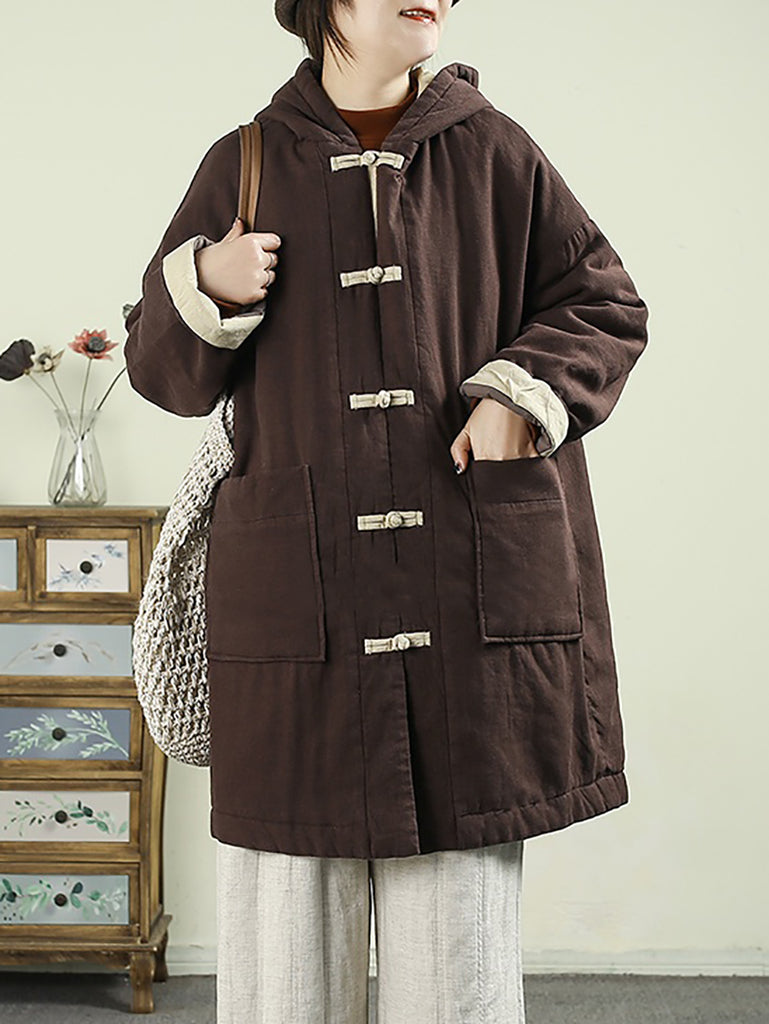 Women Winter Pure Color Hooded 100%Linen Padded Overcoat