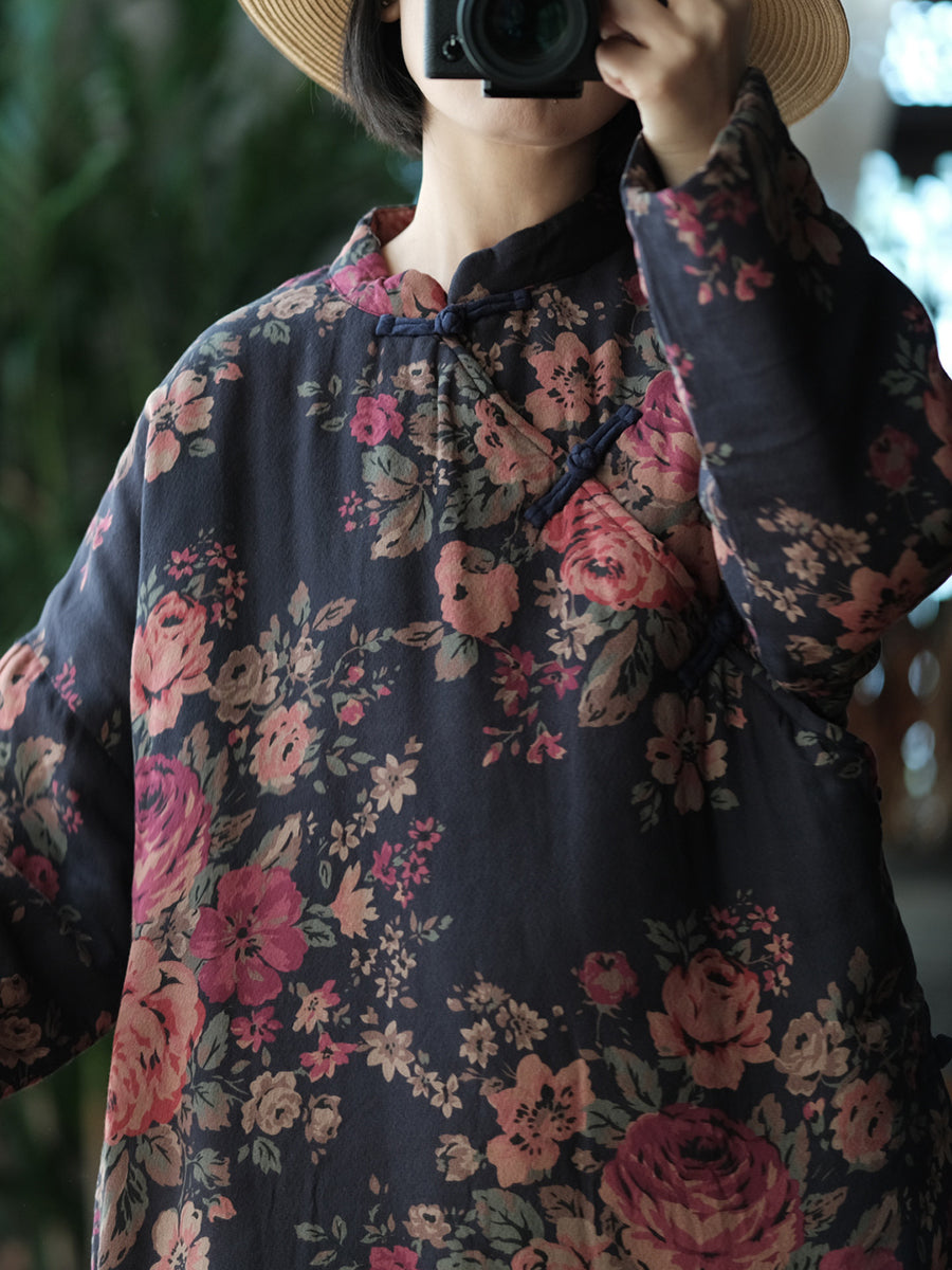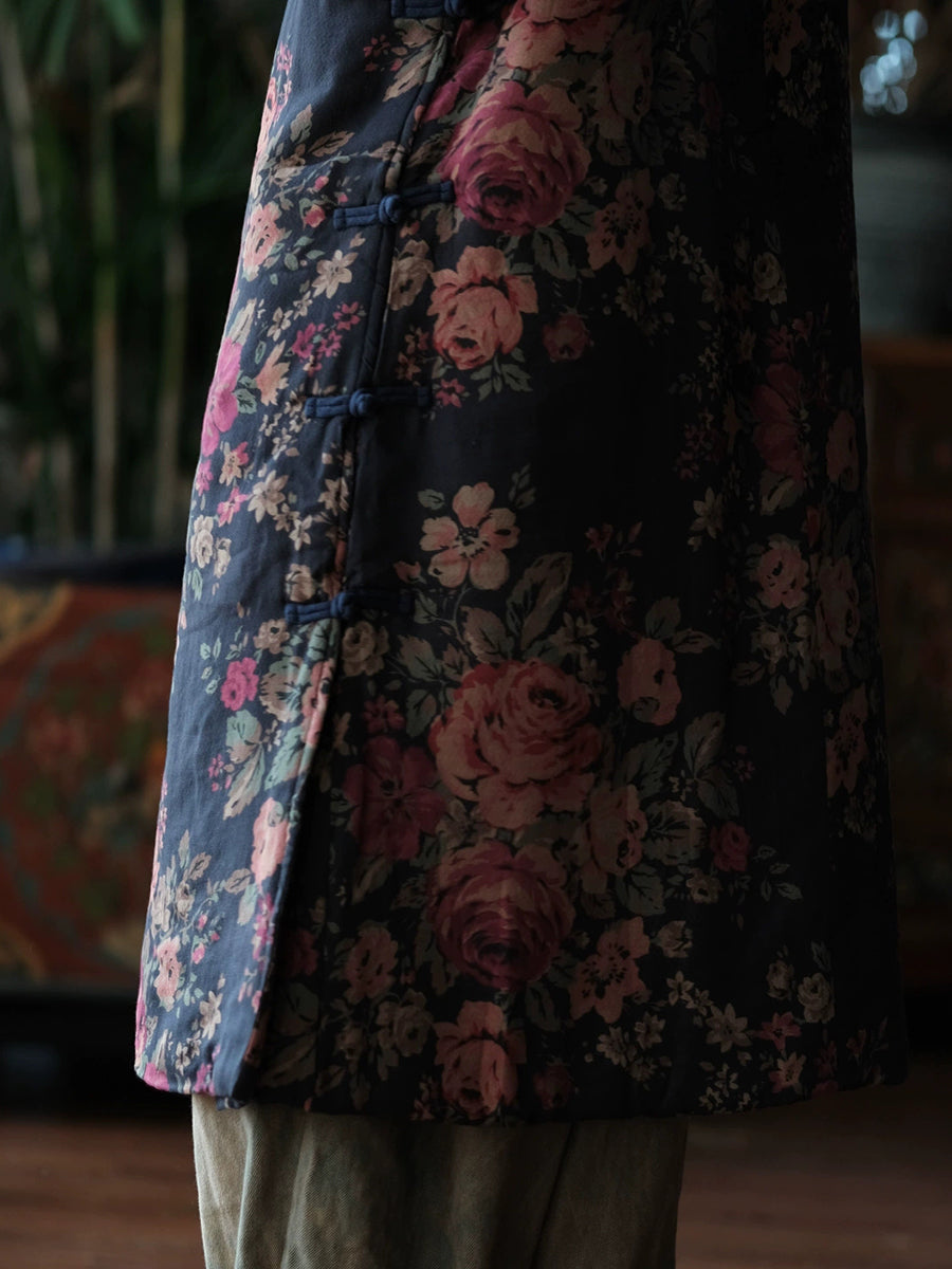 Women Winter Retro Flower Stand Collar Padded Robe Coat