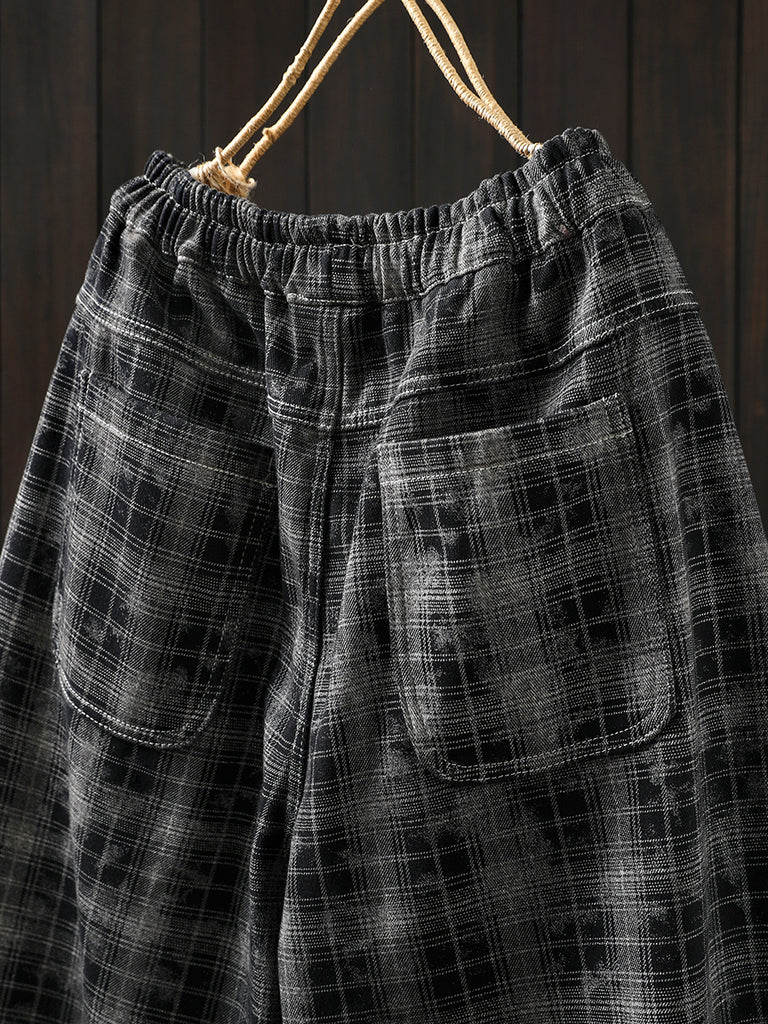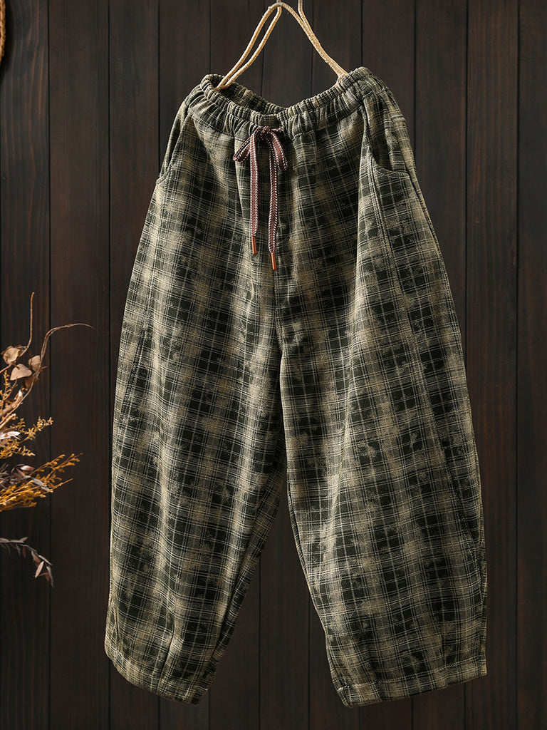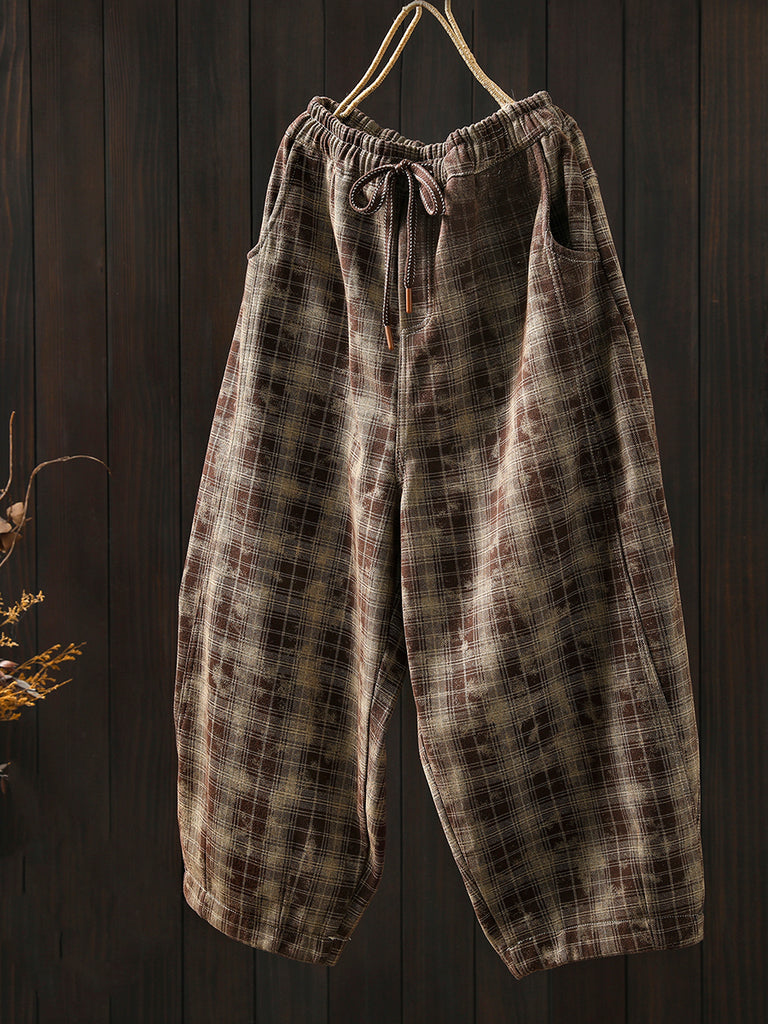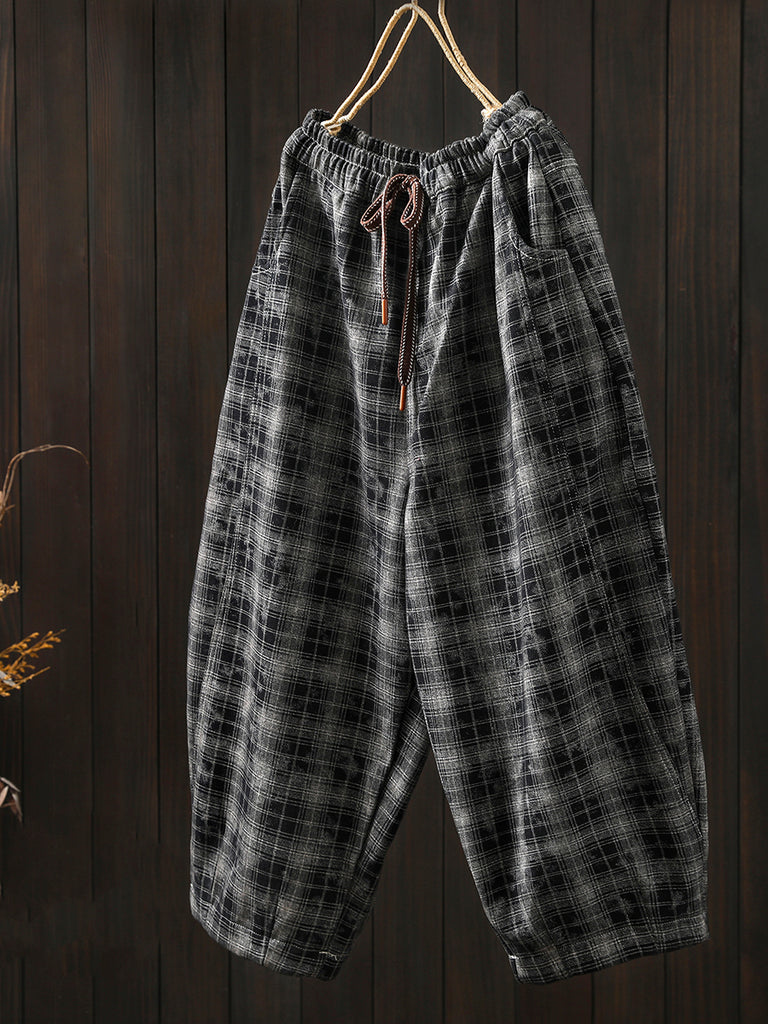 Women Winter Retro Plaid Fleece-lined Harem Pants