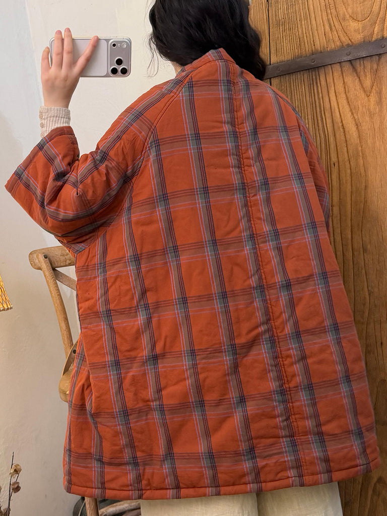 Women Winter Retro Plaid Stand Collar Padded Overcoat
