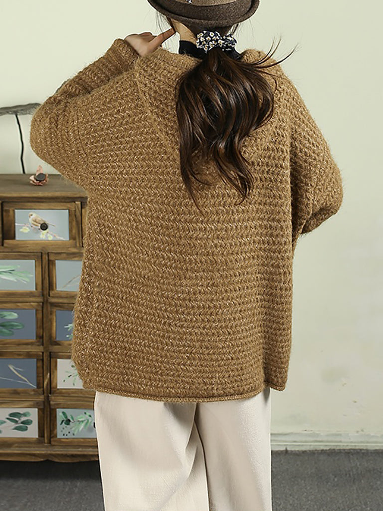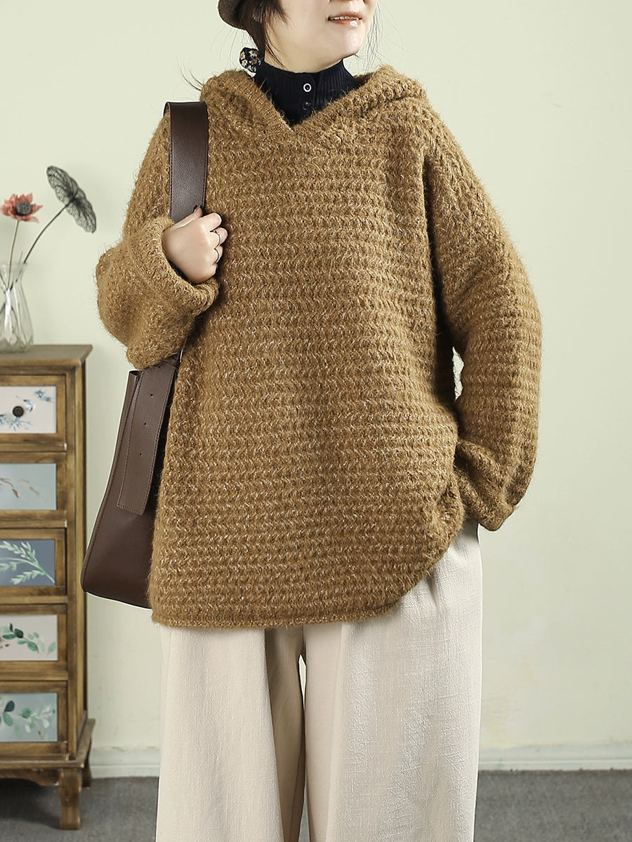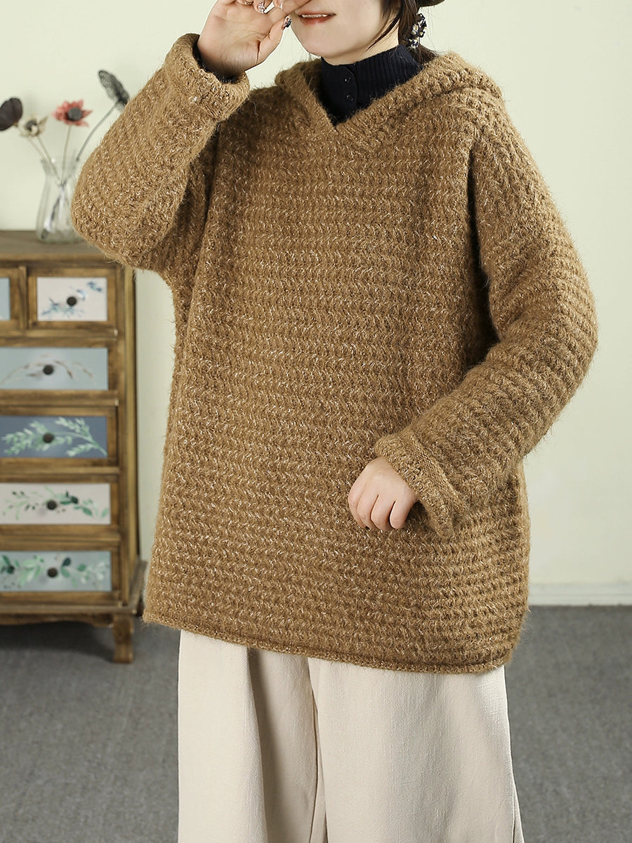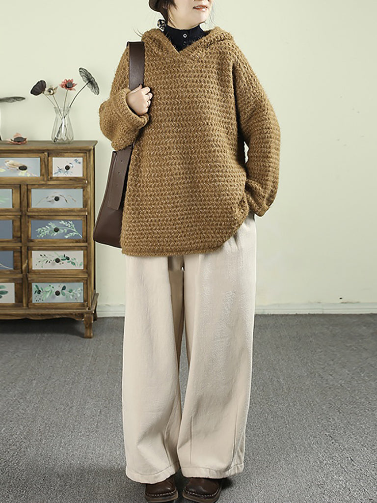Women Winter Retro Pure Color Knitted Hooded Coat