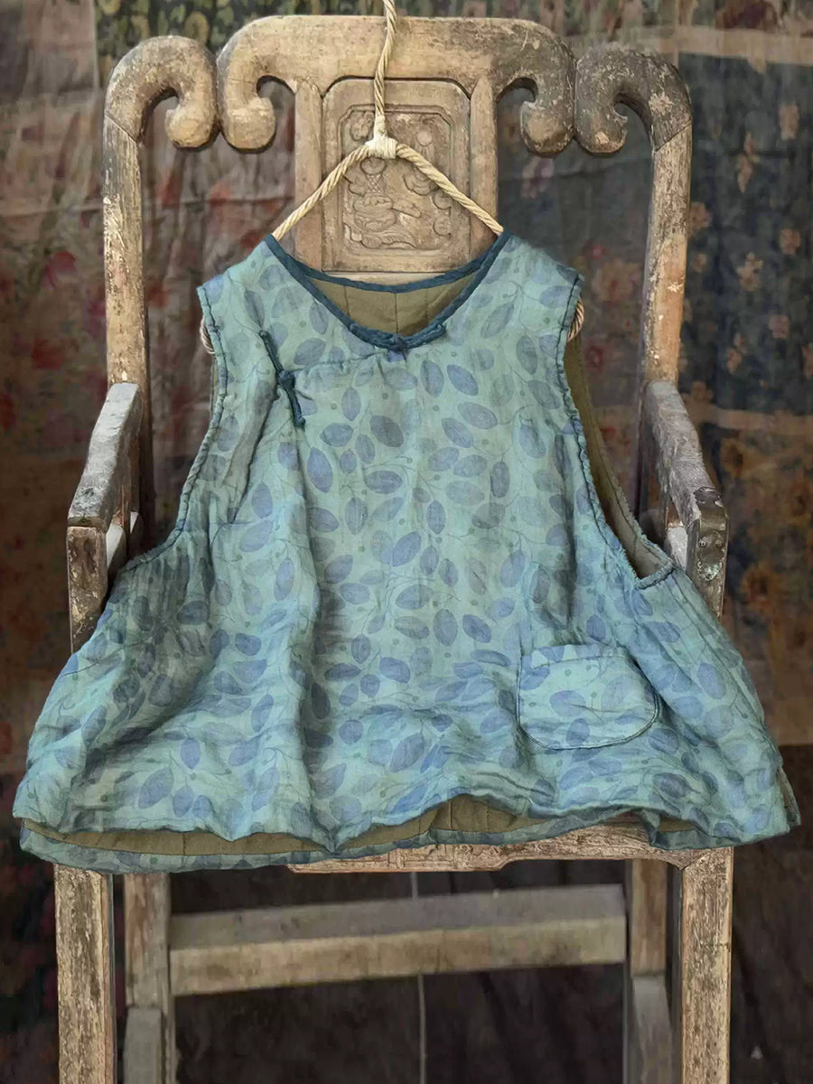 Women Winter Retro Flower O-Neck Ramie Padded Vest