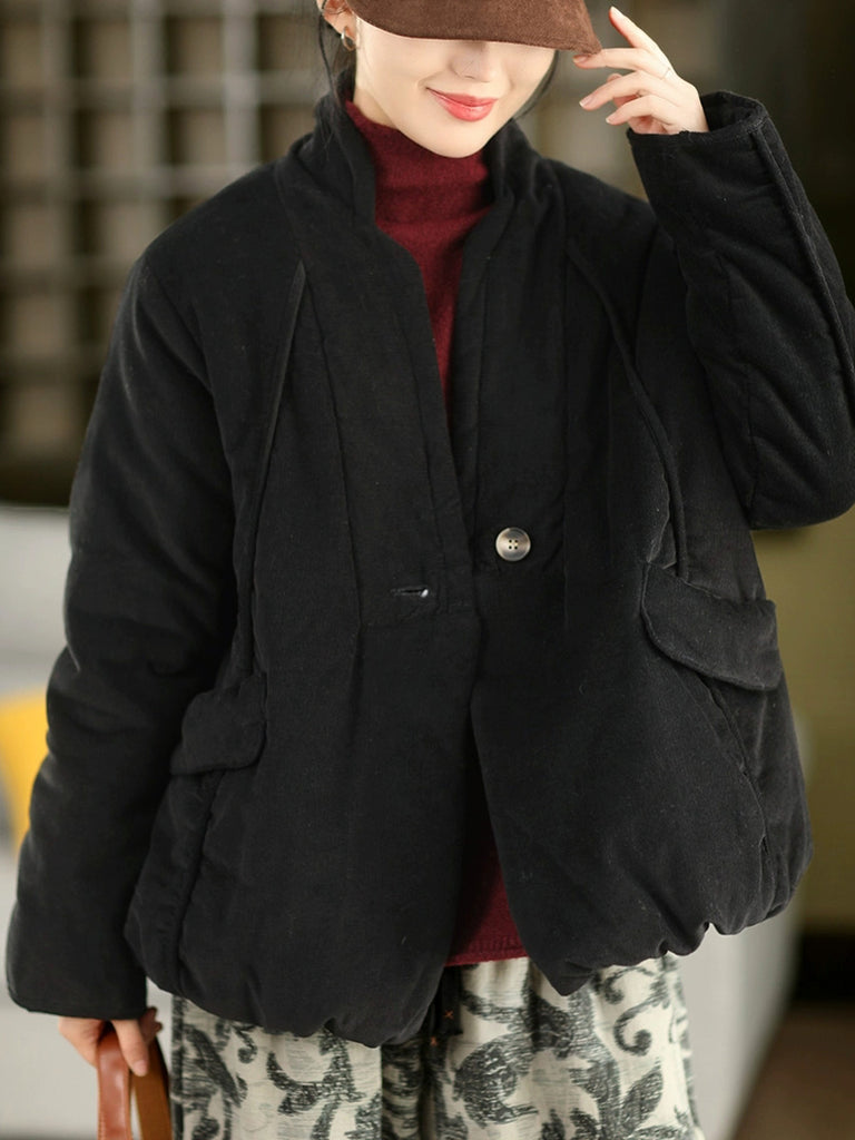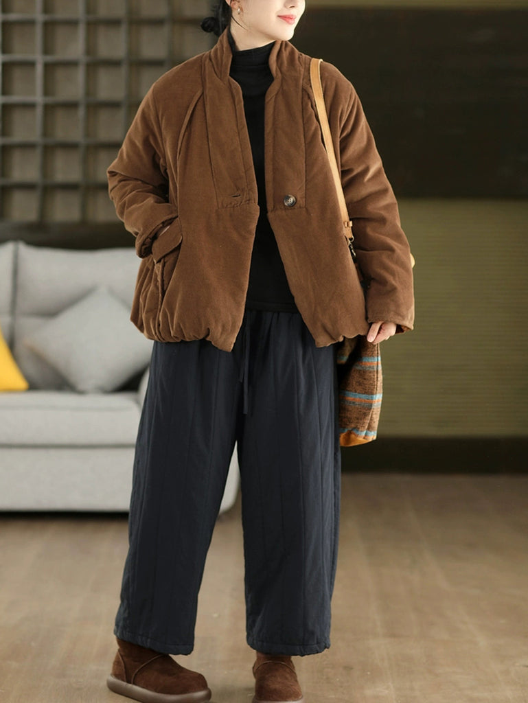 Women Winter Retro Pure Color Padded Stand Collar Coat