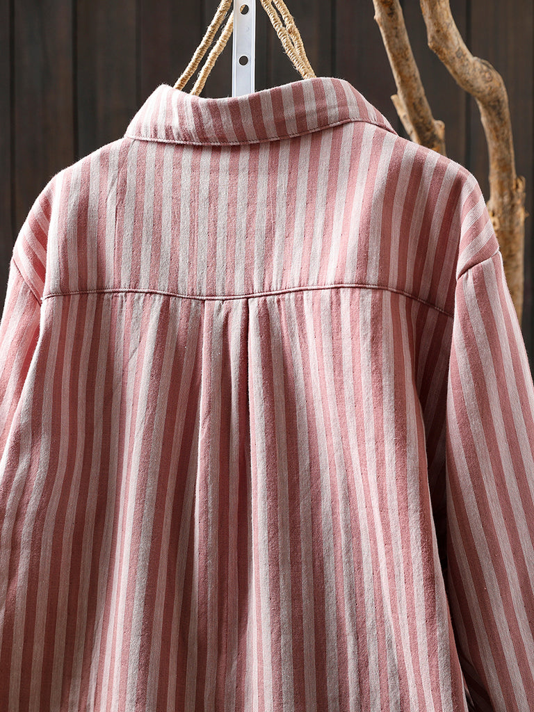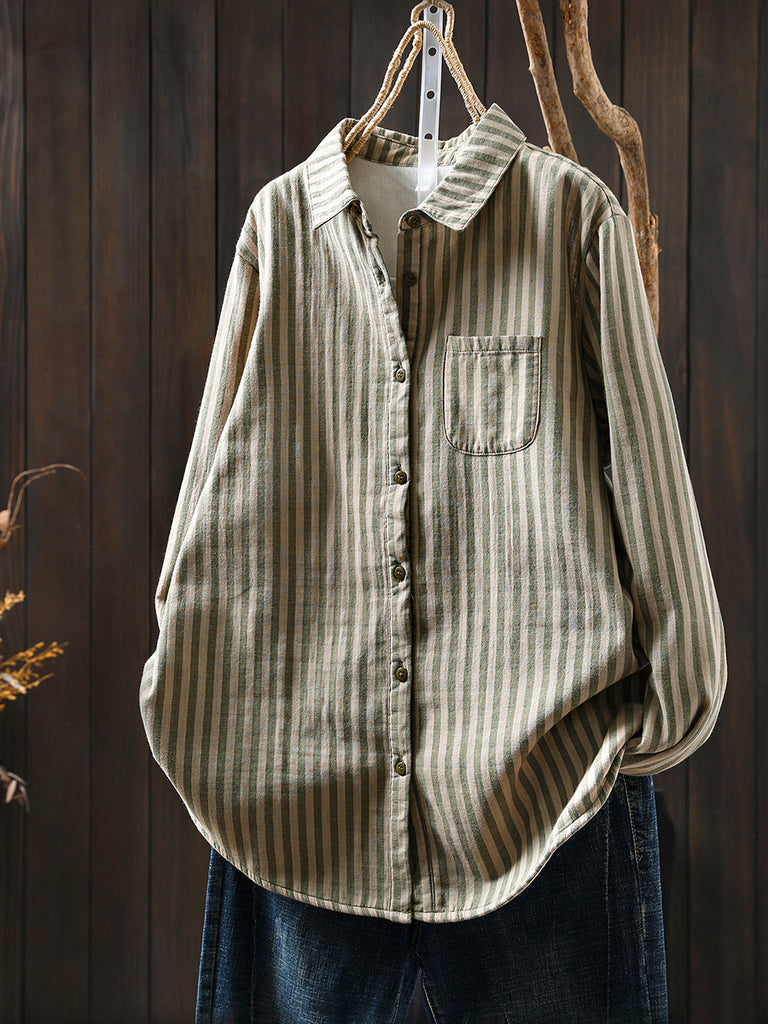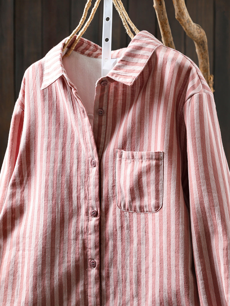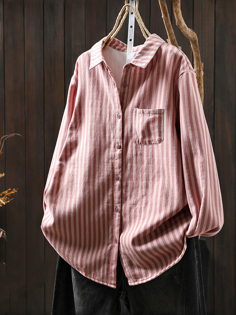 Women Winter Stripe Turn-down Collar 100%Cotton Blouse