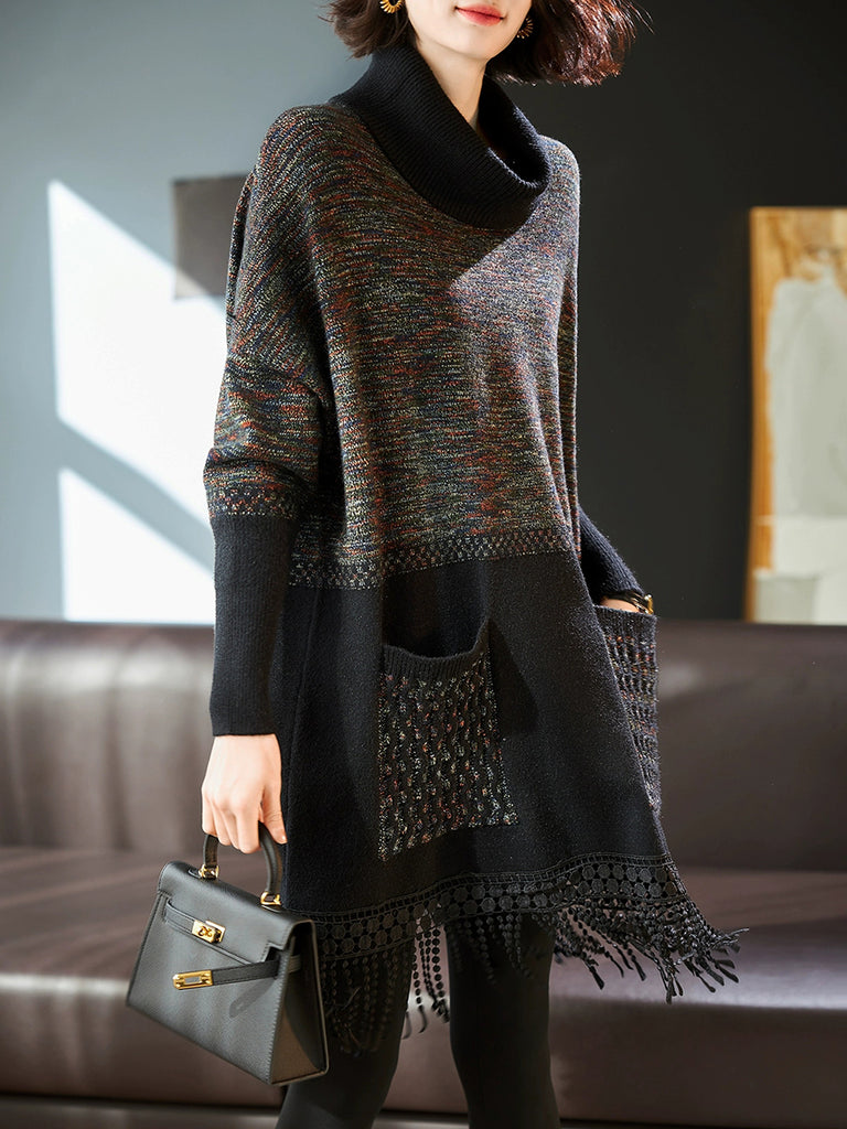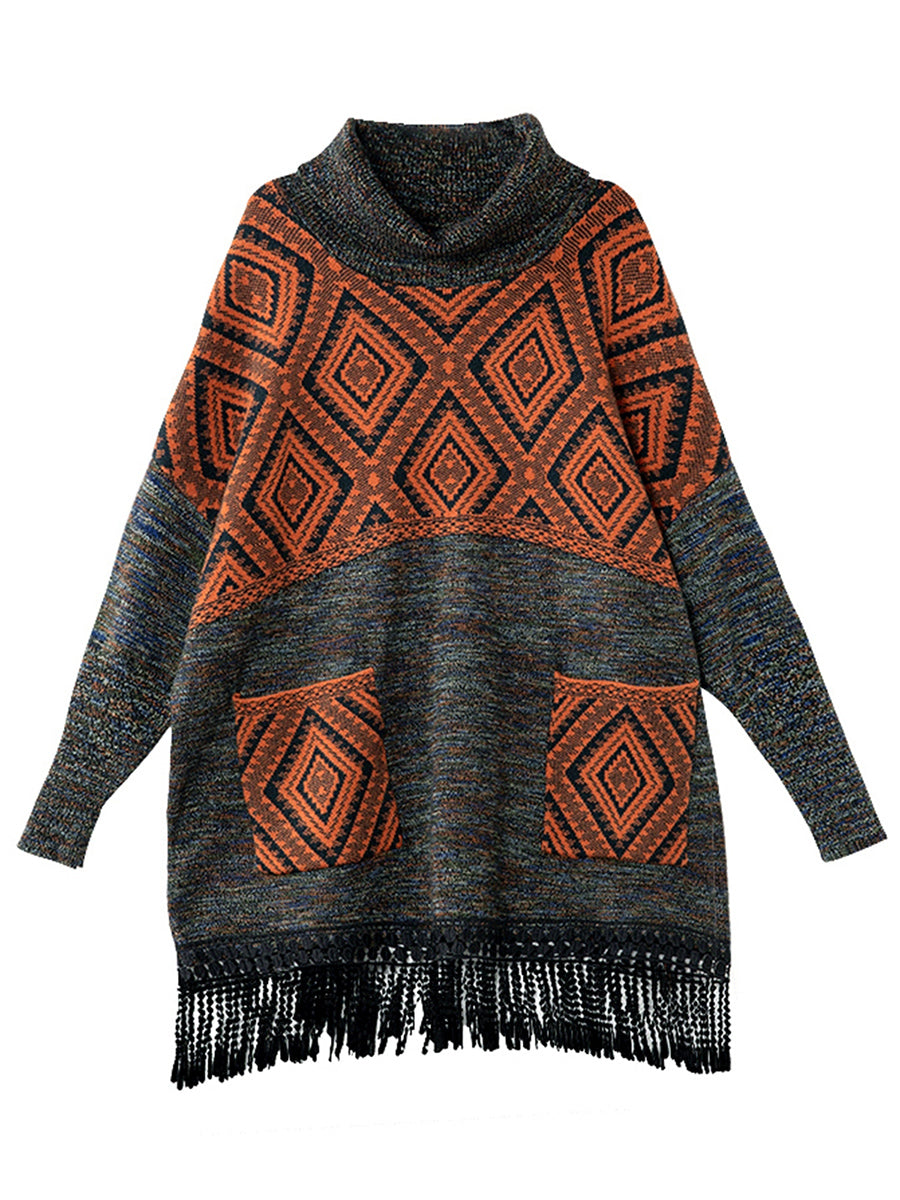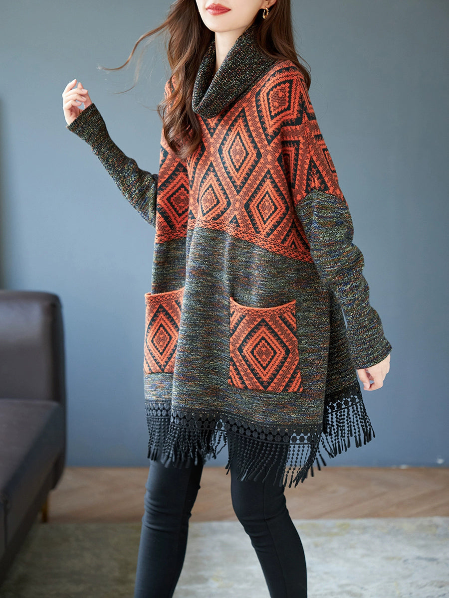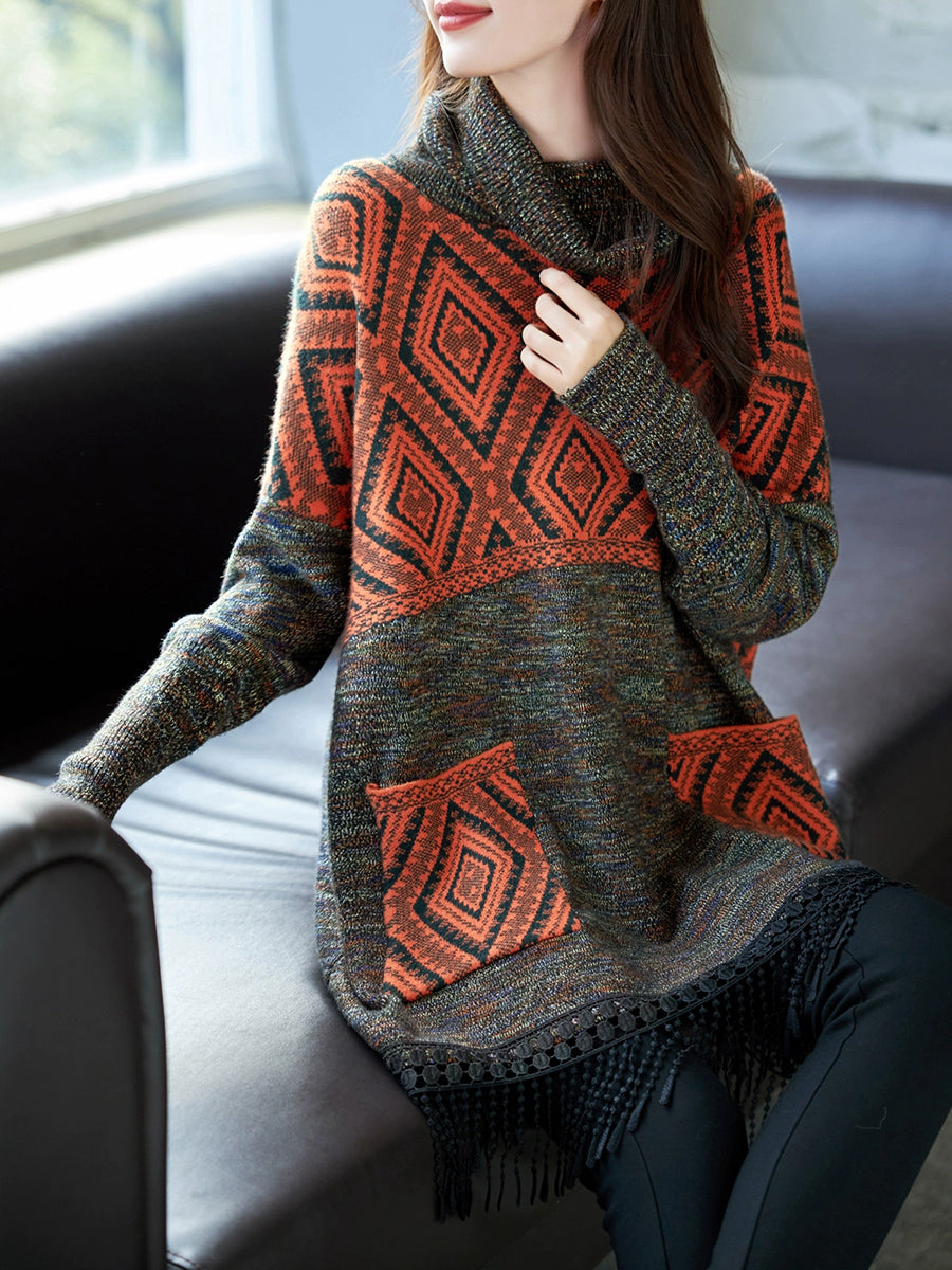 Women Winter Vintage Rhomboids Spliced Turtleneck Tassel Sweater