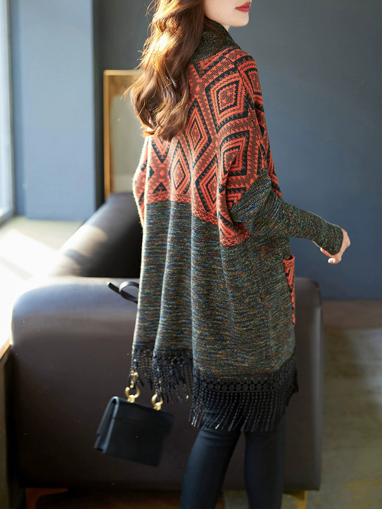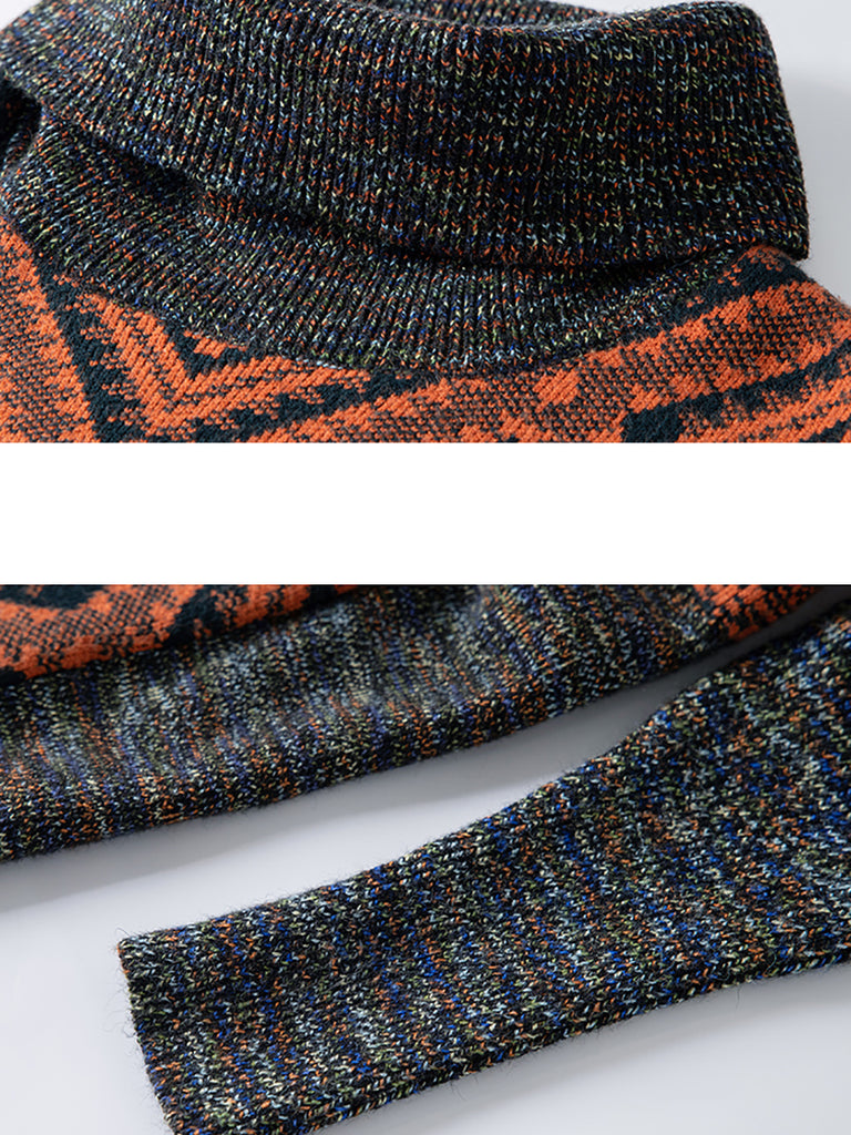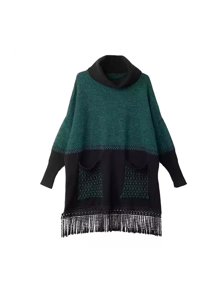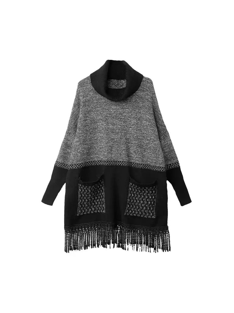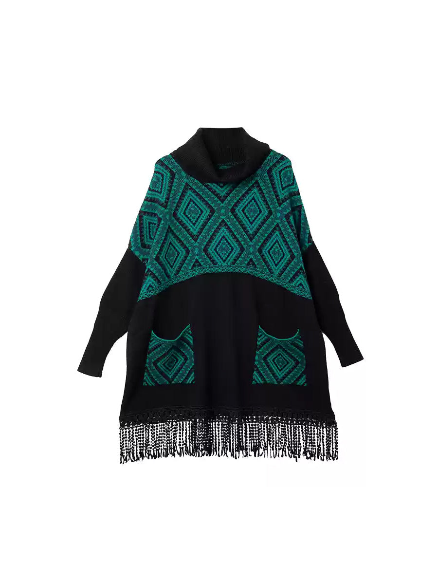 Women Winter Vintage Rhomboids Spliced Turtleneck Tassel Sweater