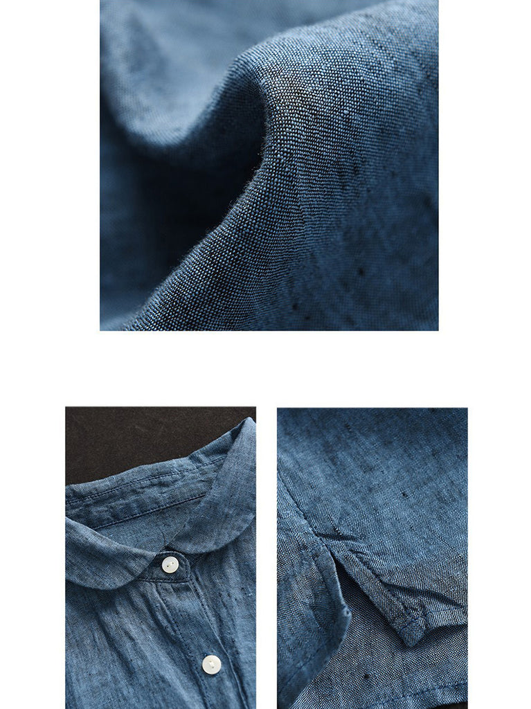 The printed description for the Plus Size Women Vintage Solid 100%Cotton Button-up Shirt contains information on its material, a 100% cotton fabric, and its features such as the turn-down collar and short raglan sleeves. Perfect for the seasons of spring and summer, this shirt is a great addition to any wardrobe.