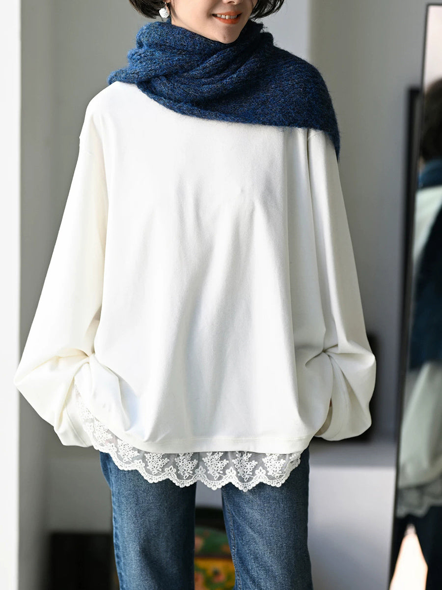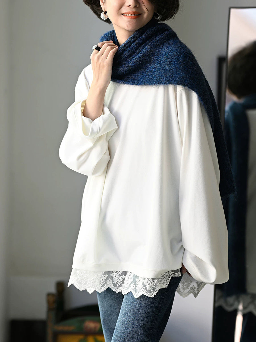 レディース アーティスティック 秋 レースヘム Oネック 100%コットン ブラウス