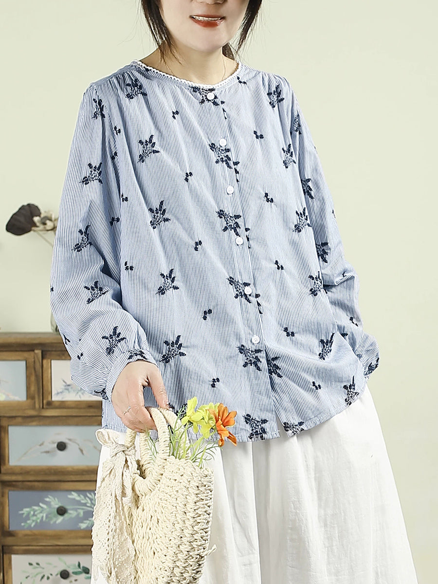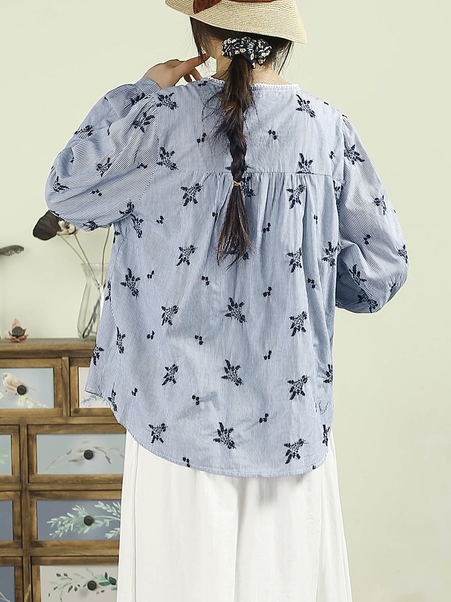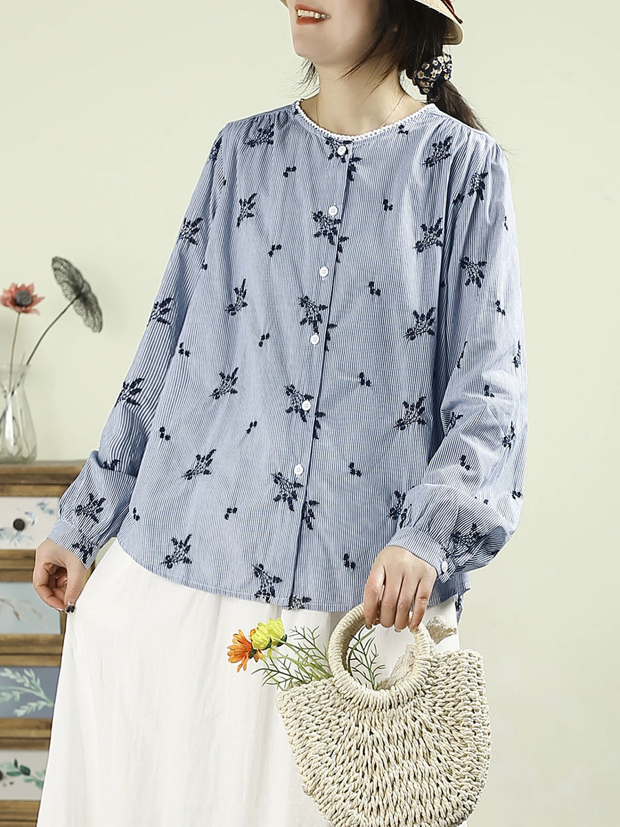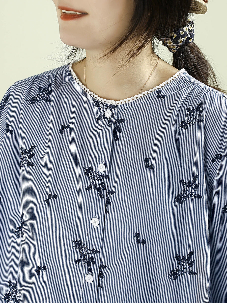 レディース アーティスティック スプリング 刺繍 Oネック 100%コットンシャツ
