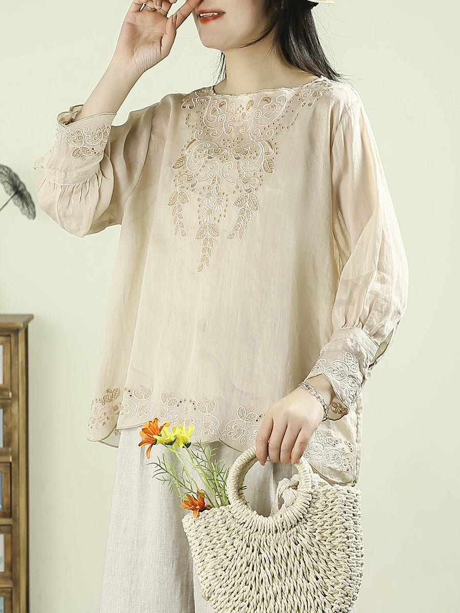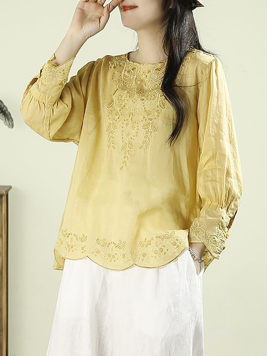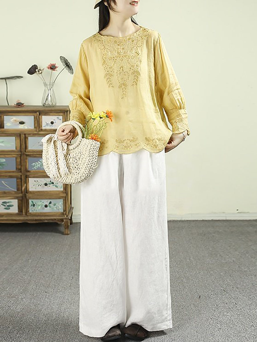 レディース アーティスティック スプリング 刺繍 Oネック 100%ラミー ブラウス