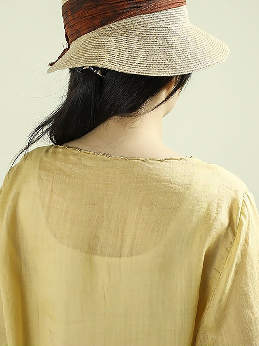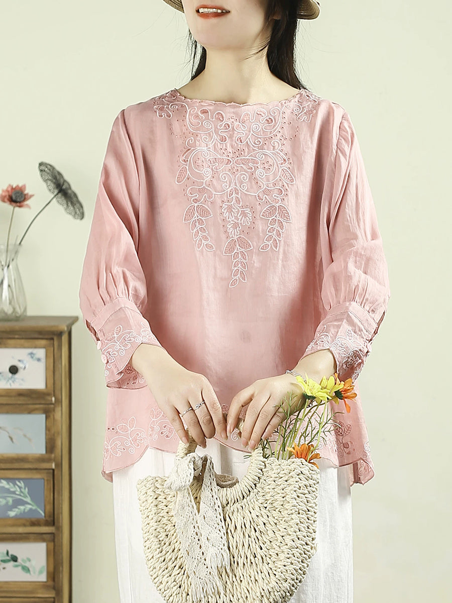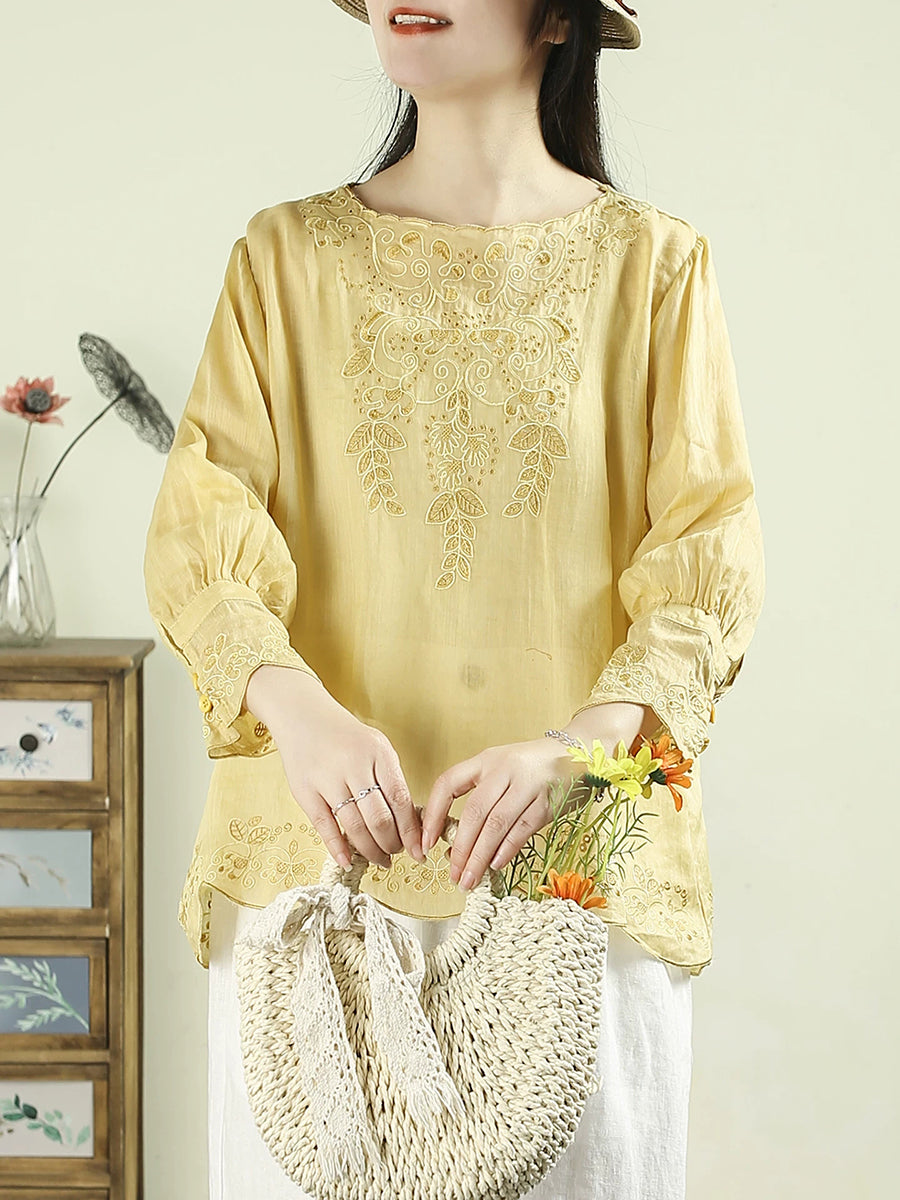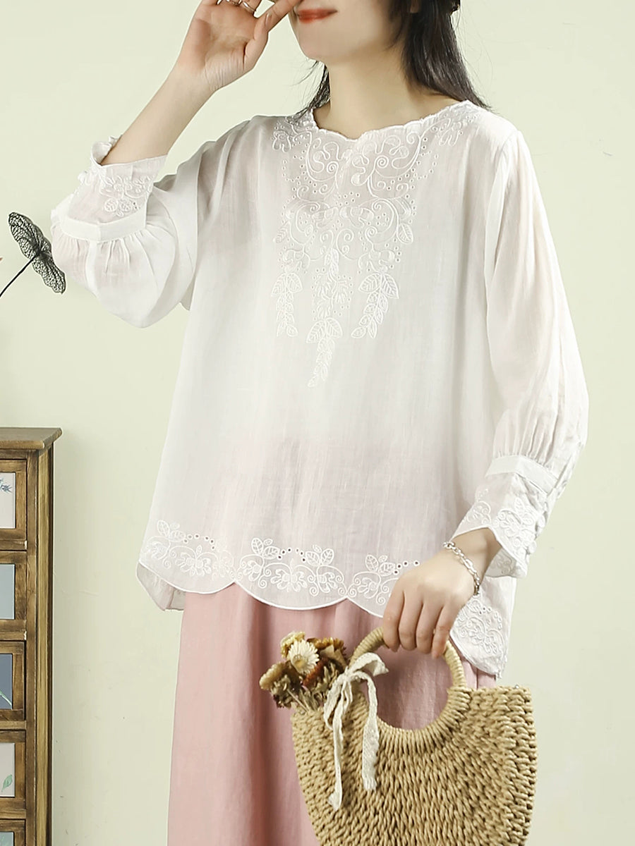 レディース アーティスティック スプリング 刺繍 Oネック 100%ラミー ブラウス