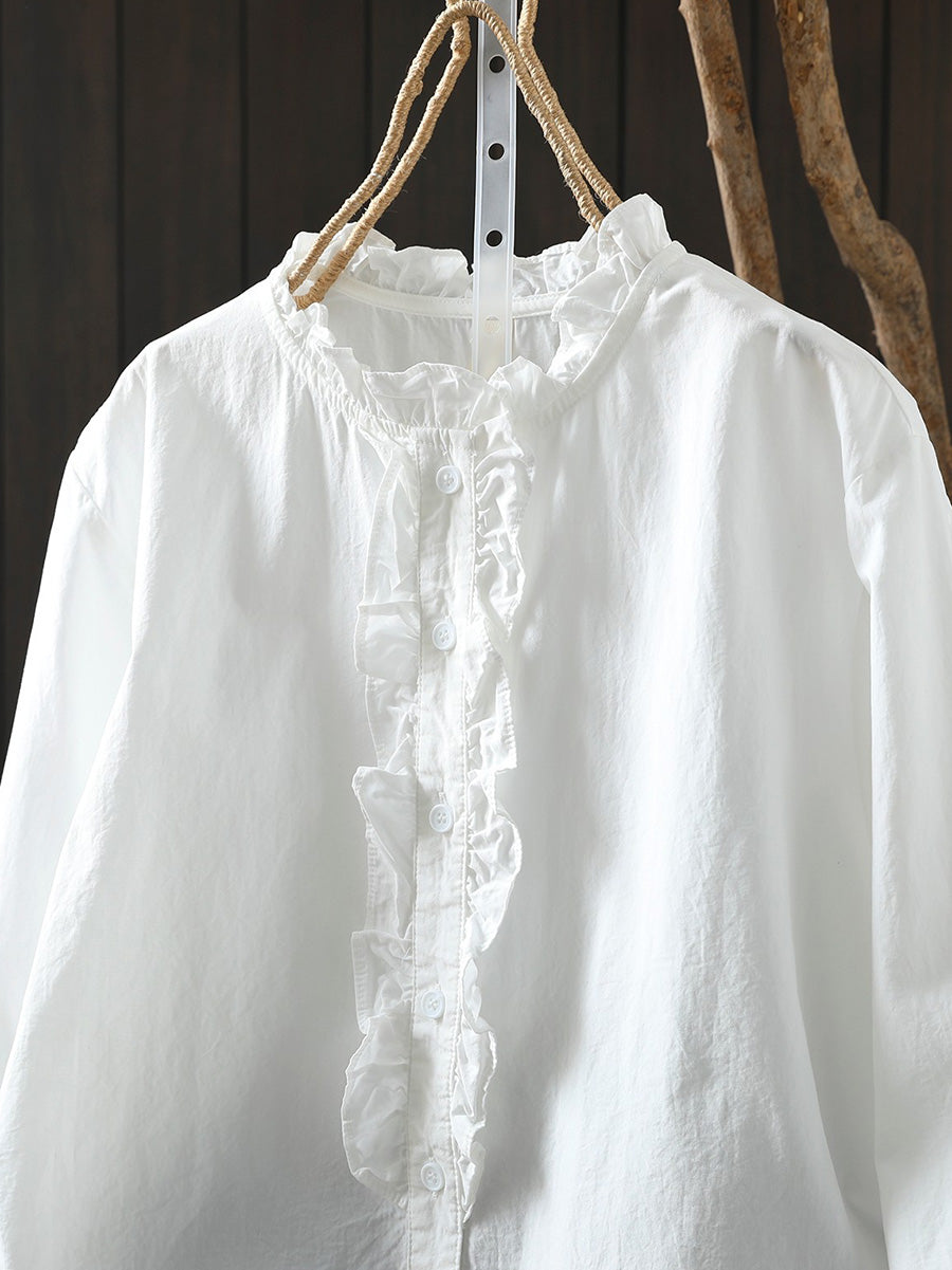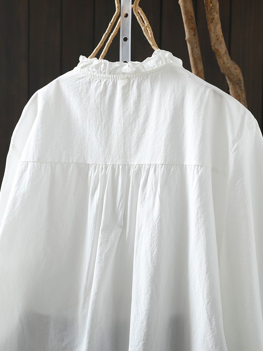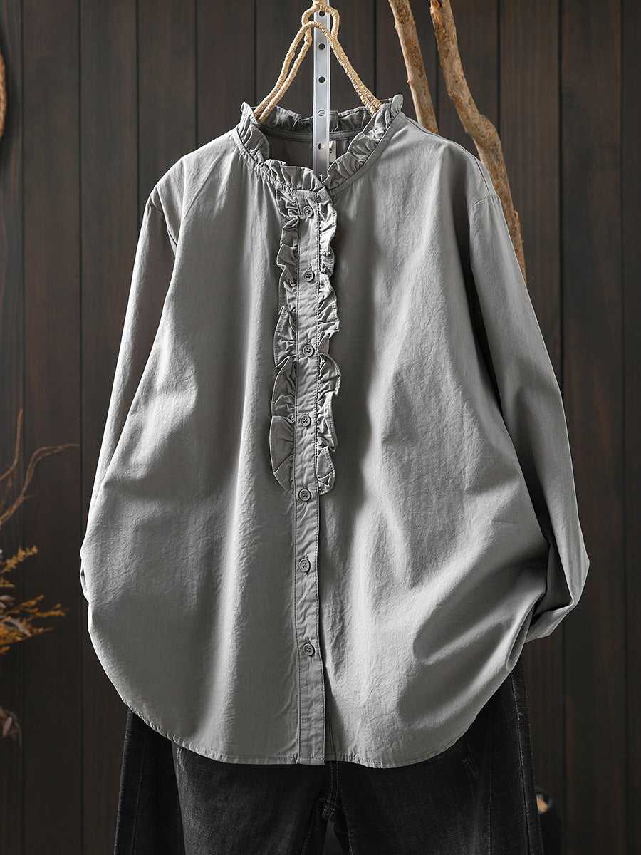 レディース アーティスティック スプリング スタンドカラー 100%コットンシャツ