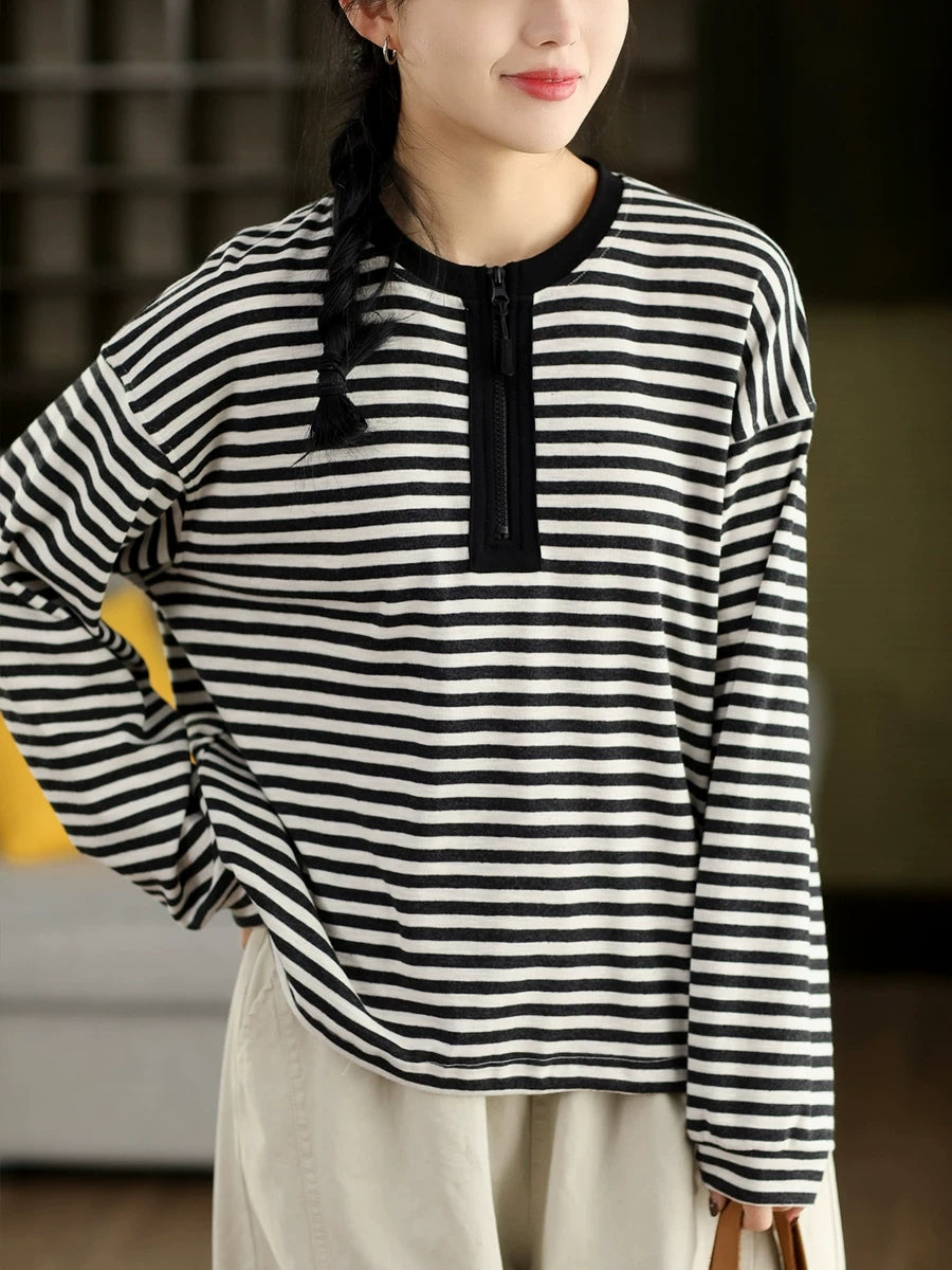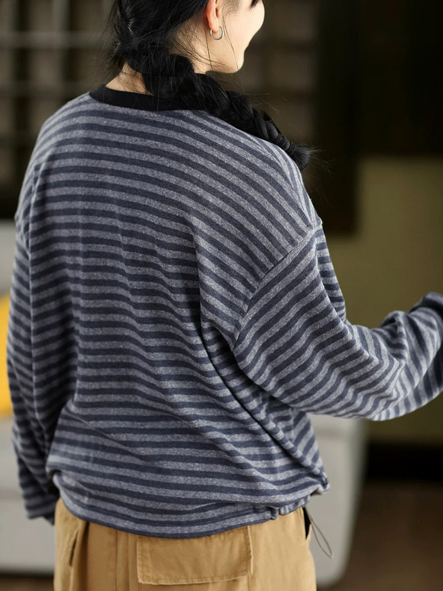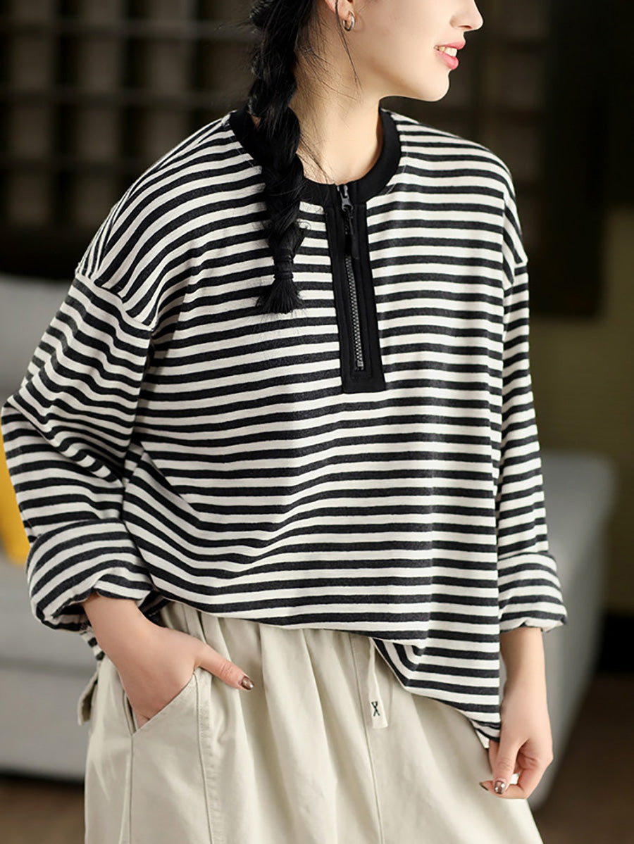 レディース アーティスティック スプリング ストライプ Oネック コットン ブラウス