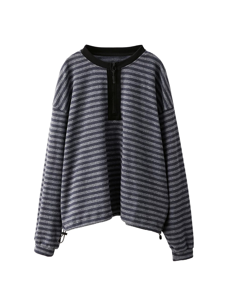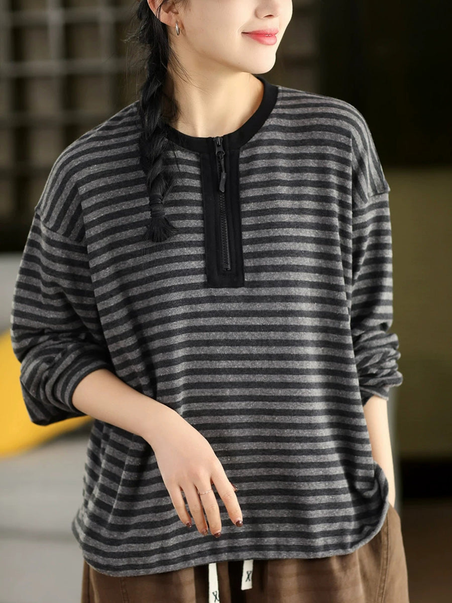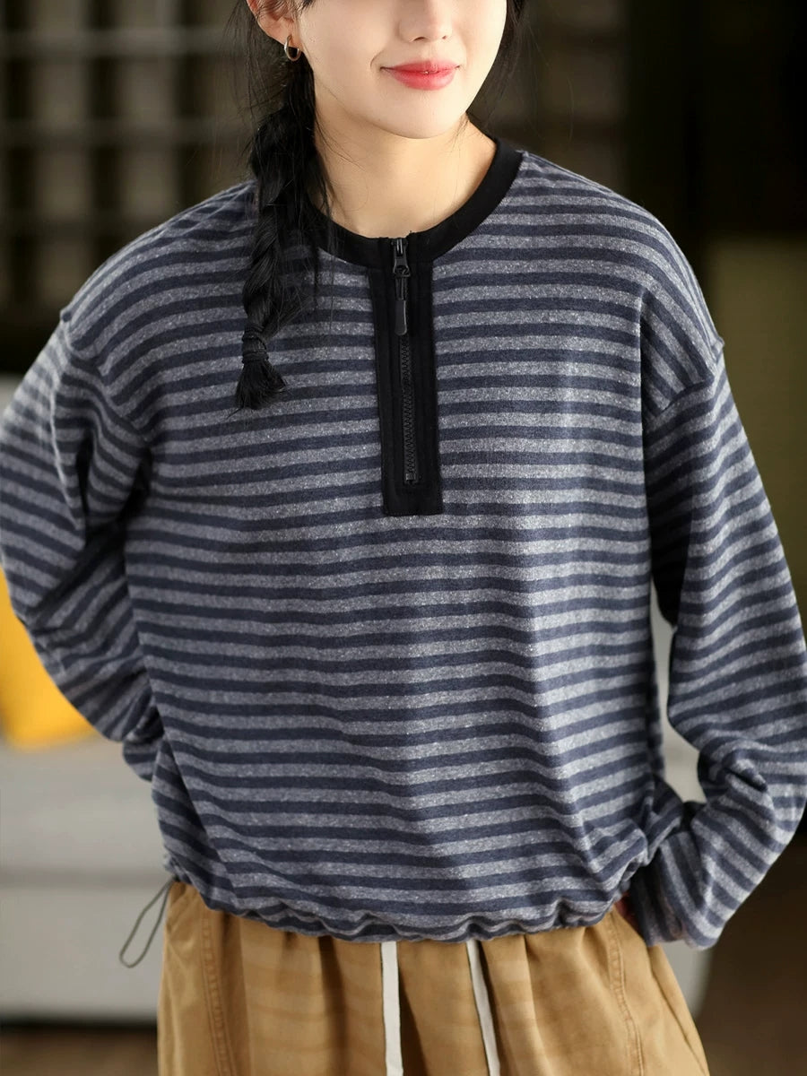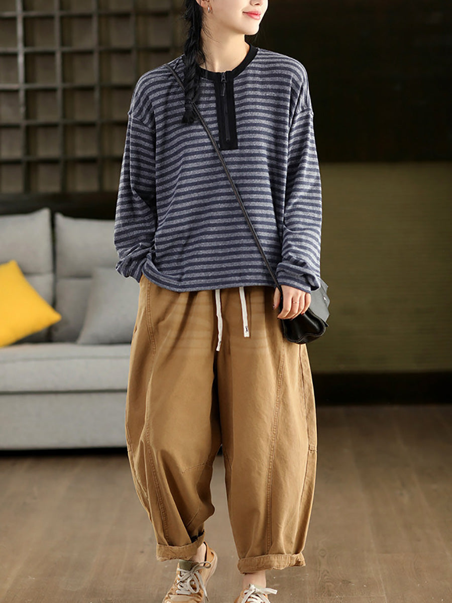 レディース アーティスティック スプリング ストライプ Oネック コットン ブラウス