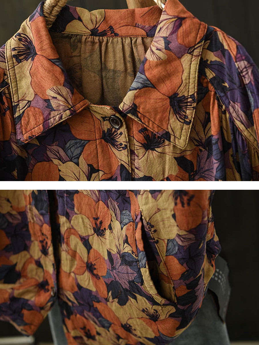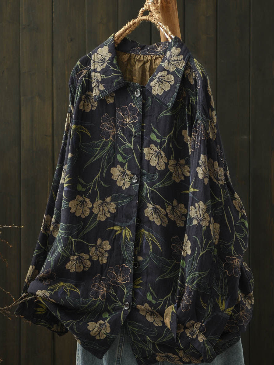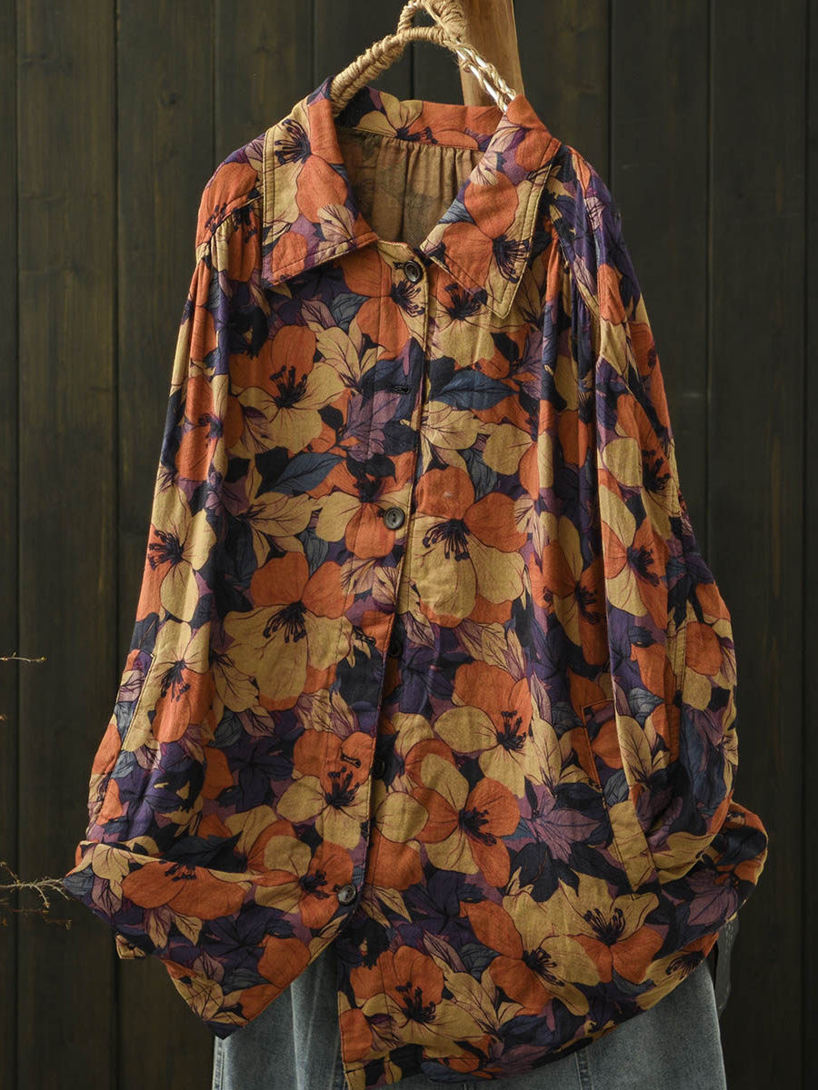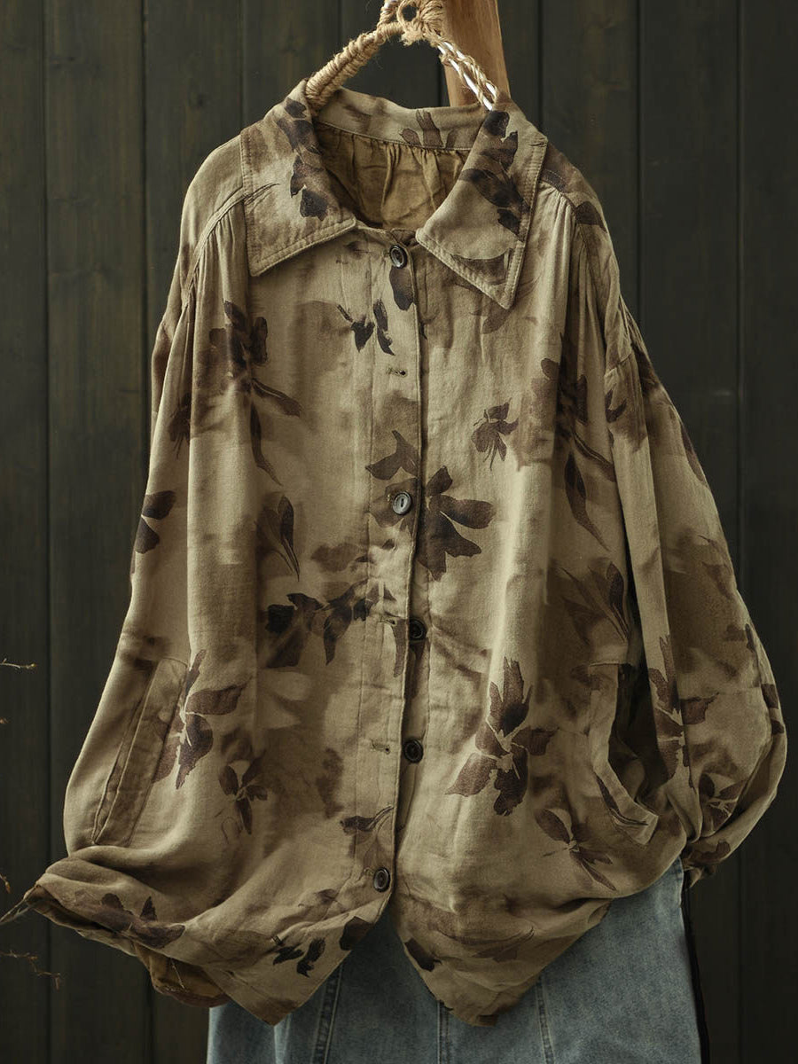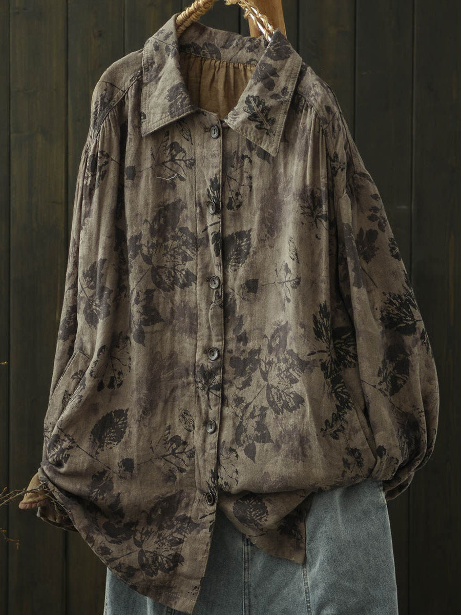 レディース 秋 アーティスティックフラワー ターンダウンカラー コットンシャツ