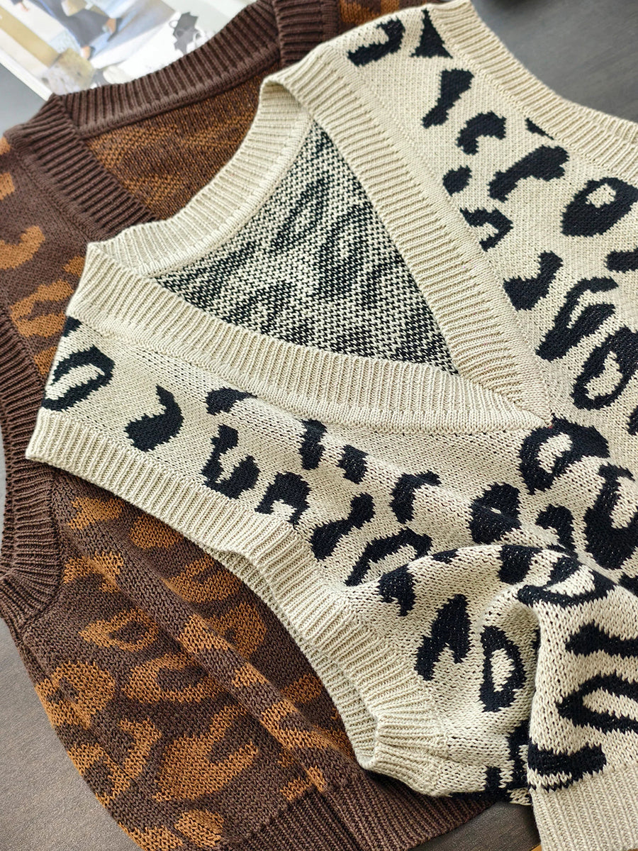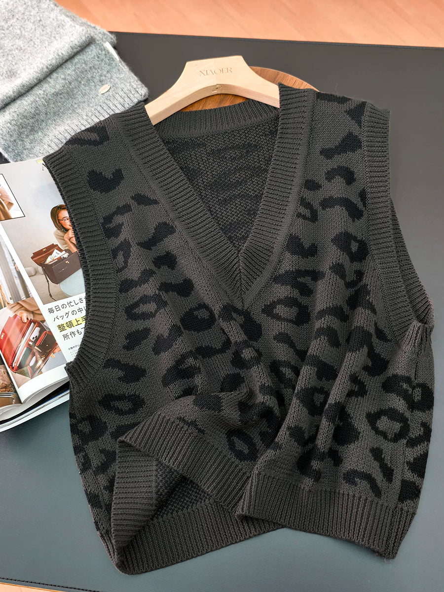 レディース 秋 アーティスティック レオパード Vネック ニットベスト