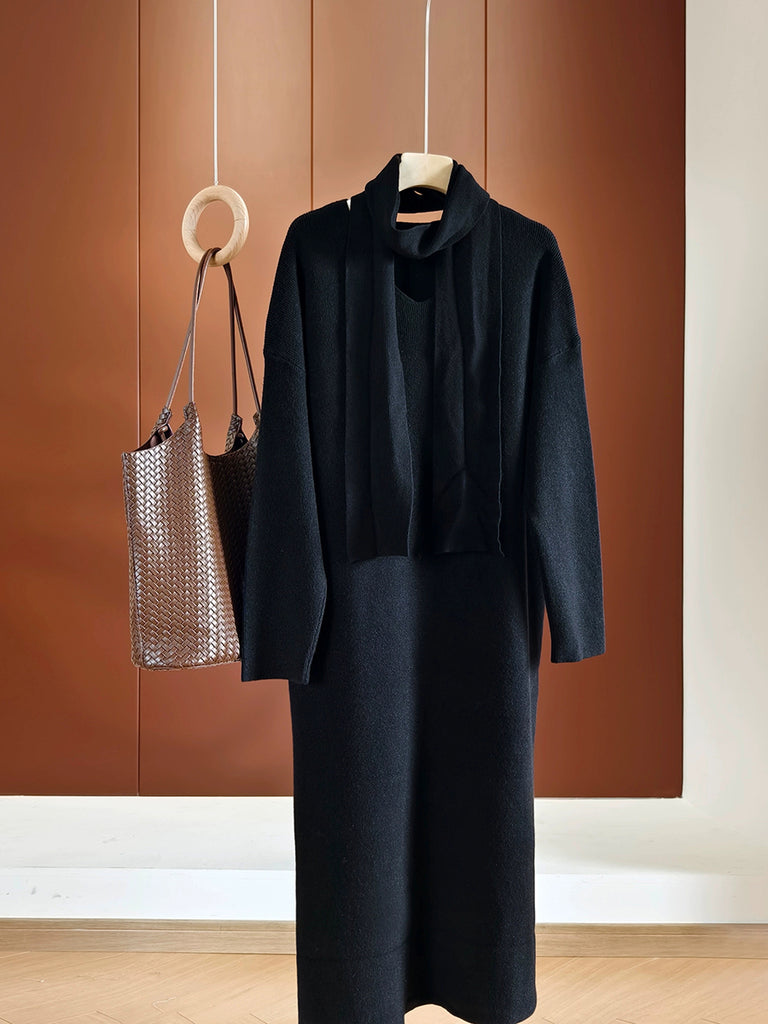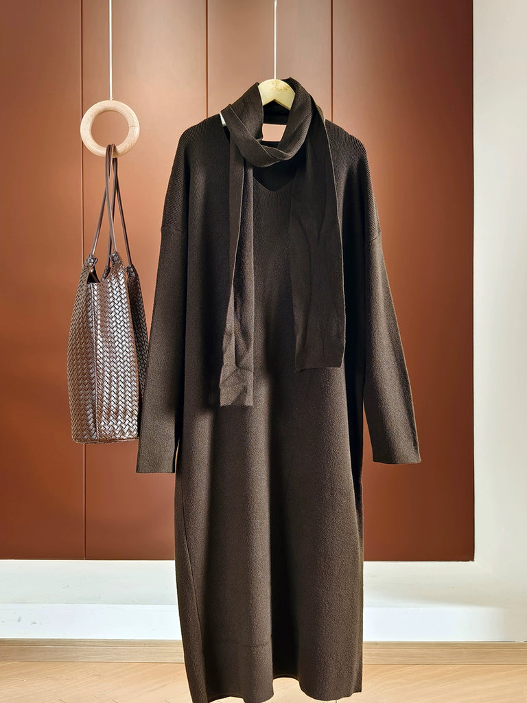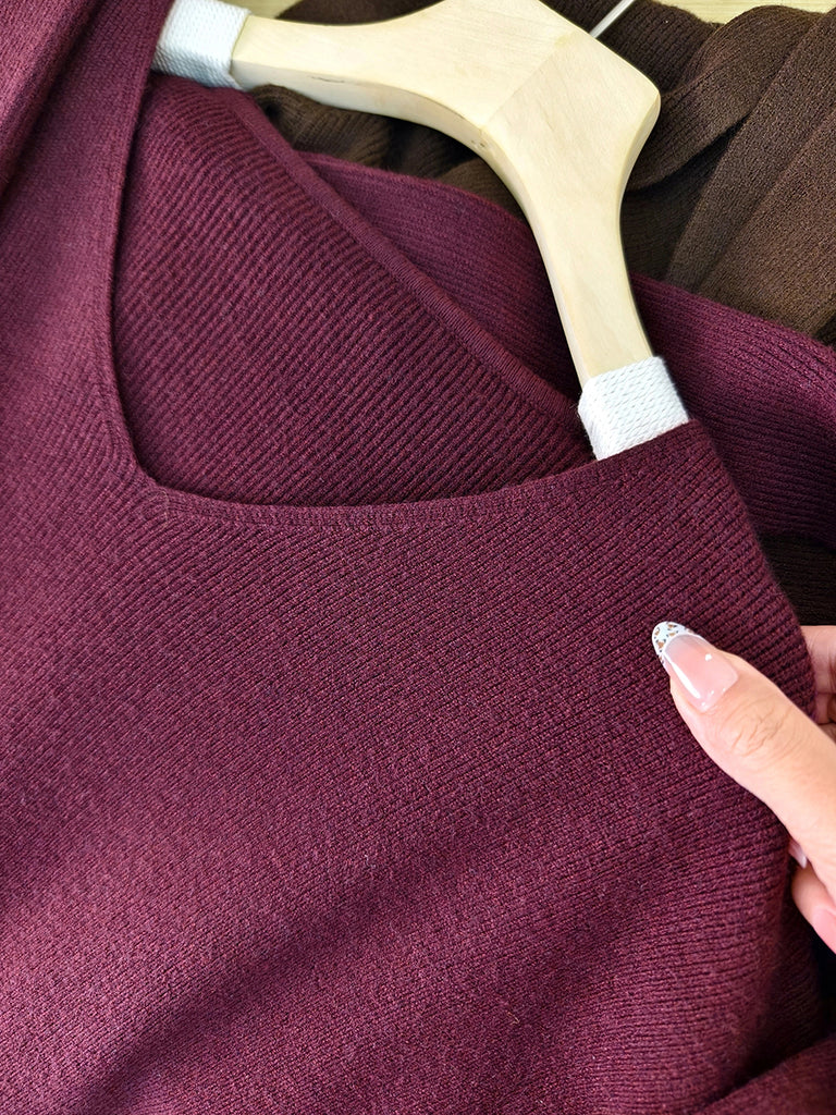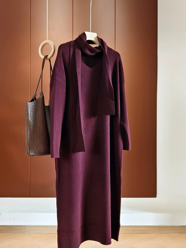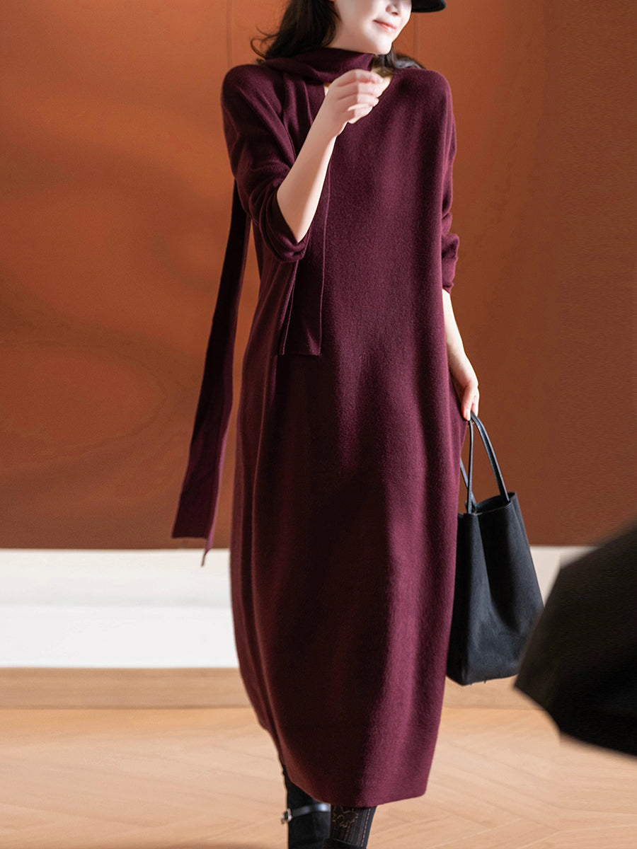 レディース 秋 カジュアル ピュアカラー ニット Vネック ドレス