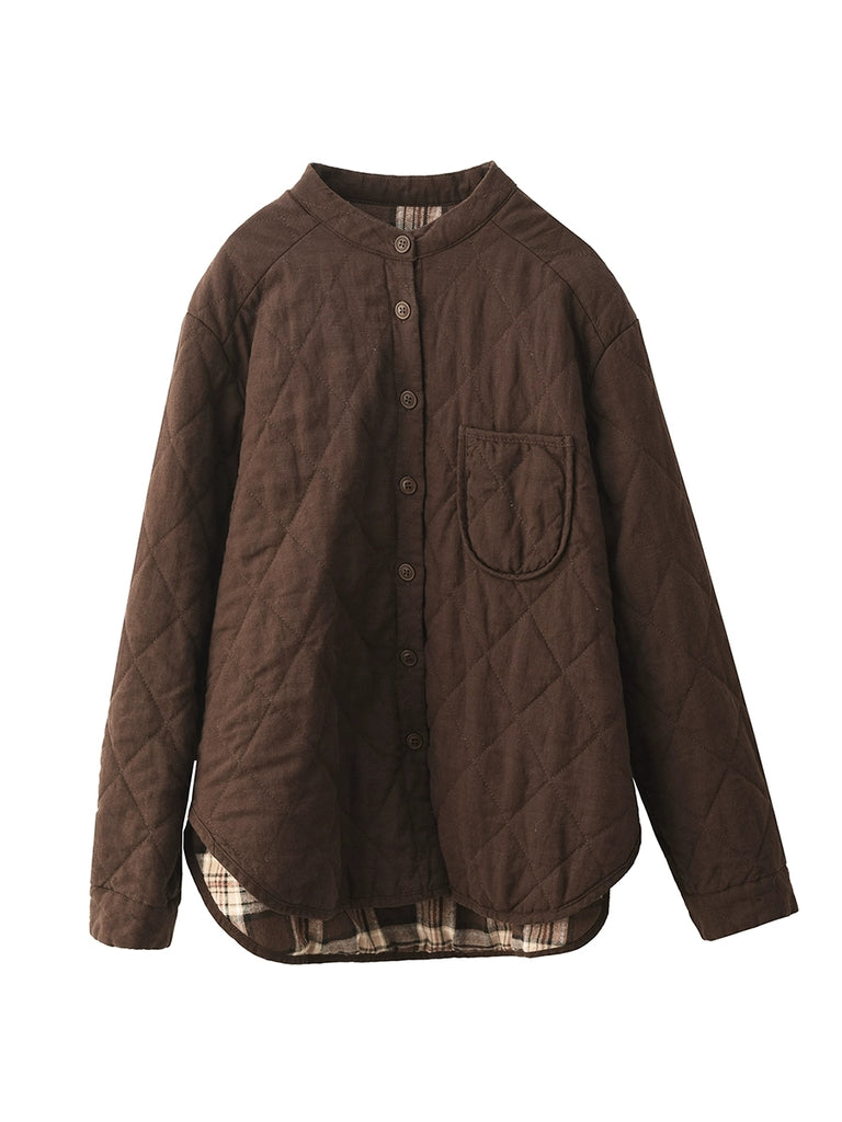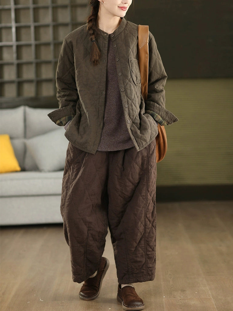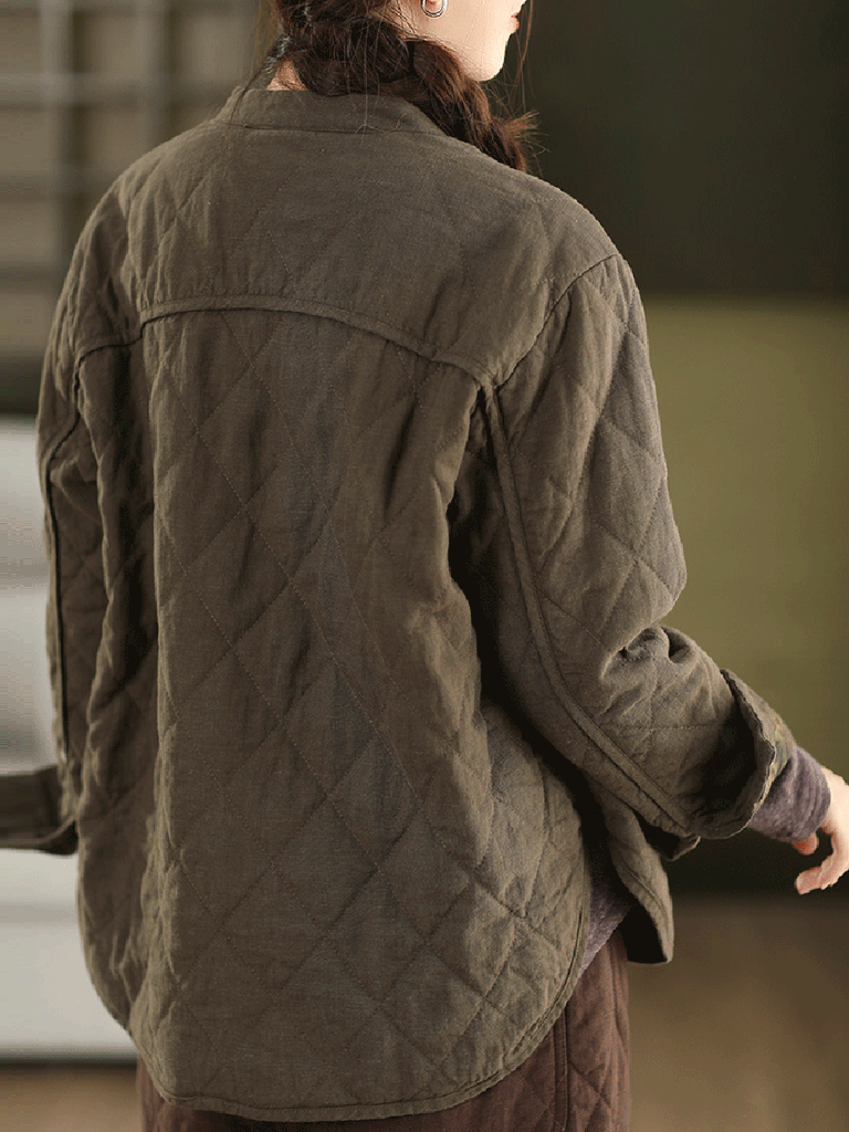 レディース 秋 ピュアカラー 100%リネン スタンドカラー 中綿ジャケット