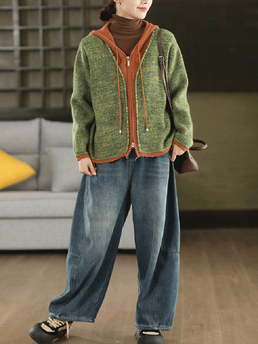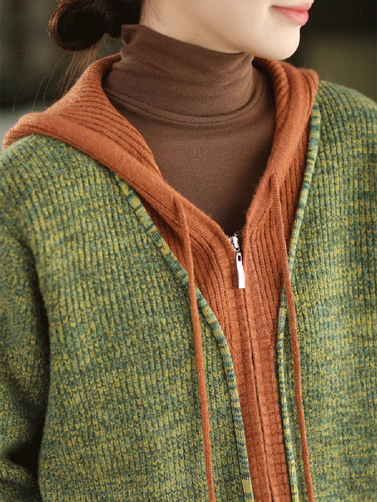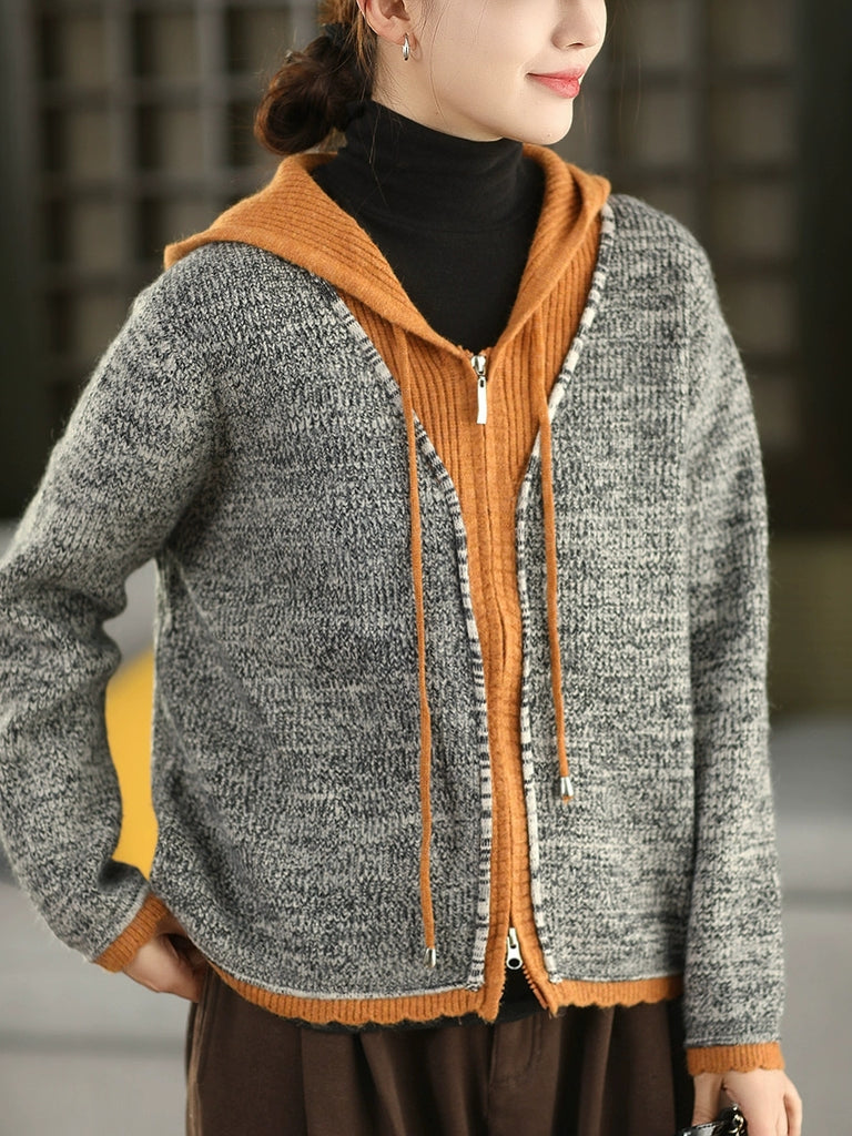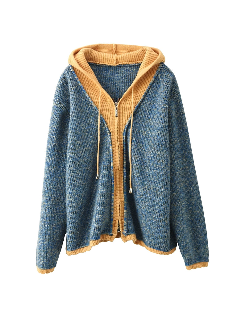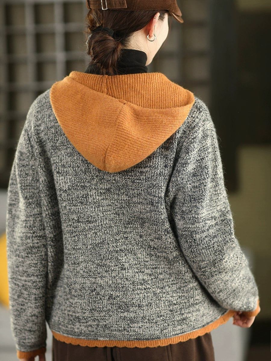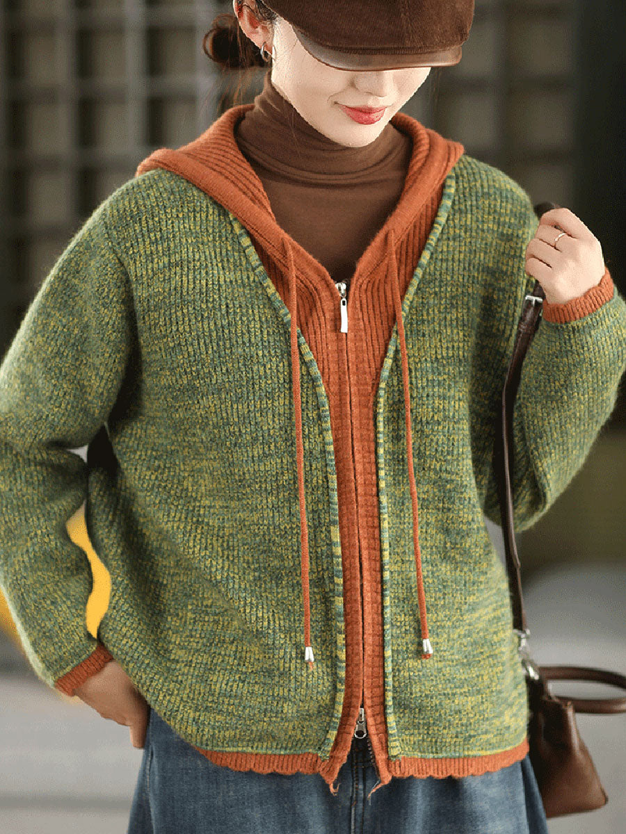 レディース 秋 レトロ カラーブロック フード付き セーターコート