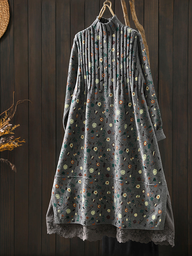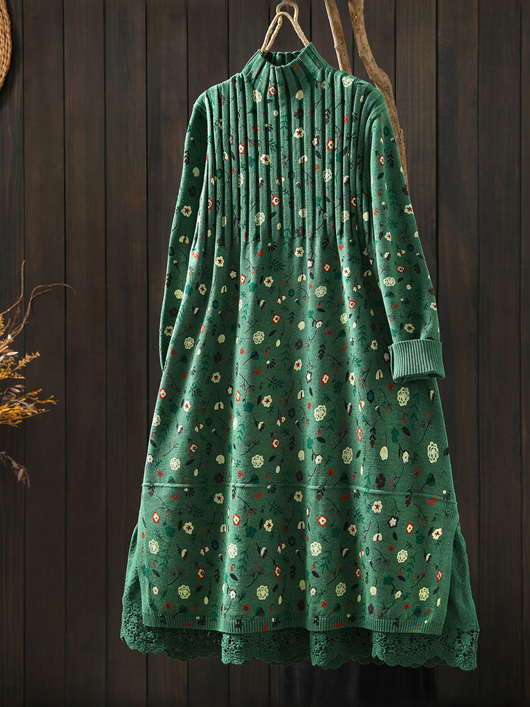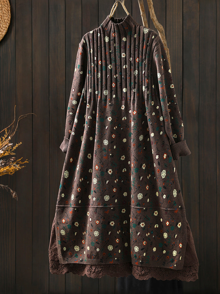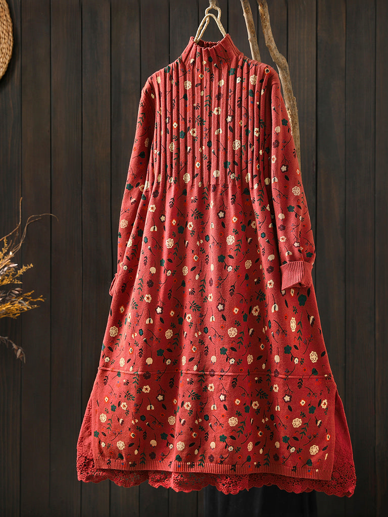 レディース 秋 ヴィンテージ フローラル ハーフタートルネック ニットドレス