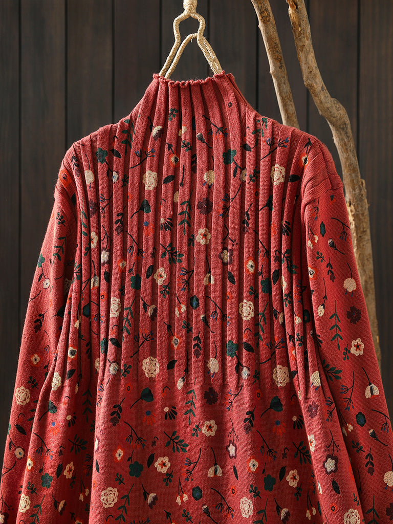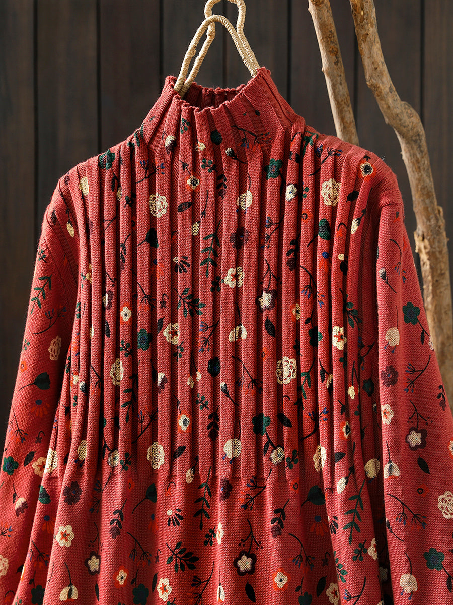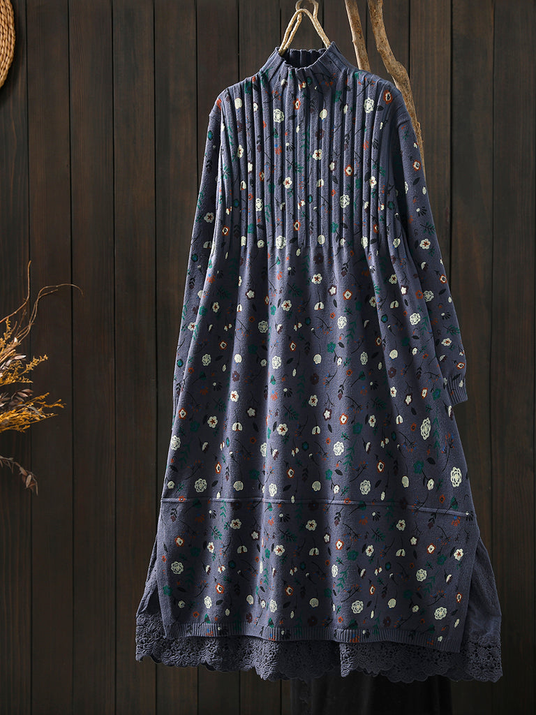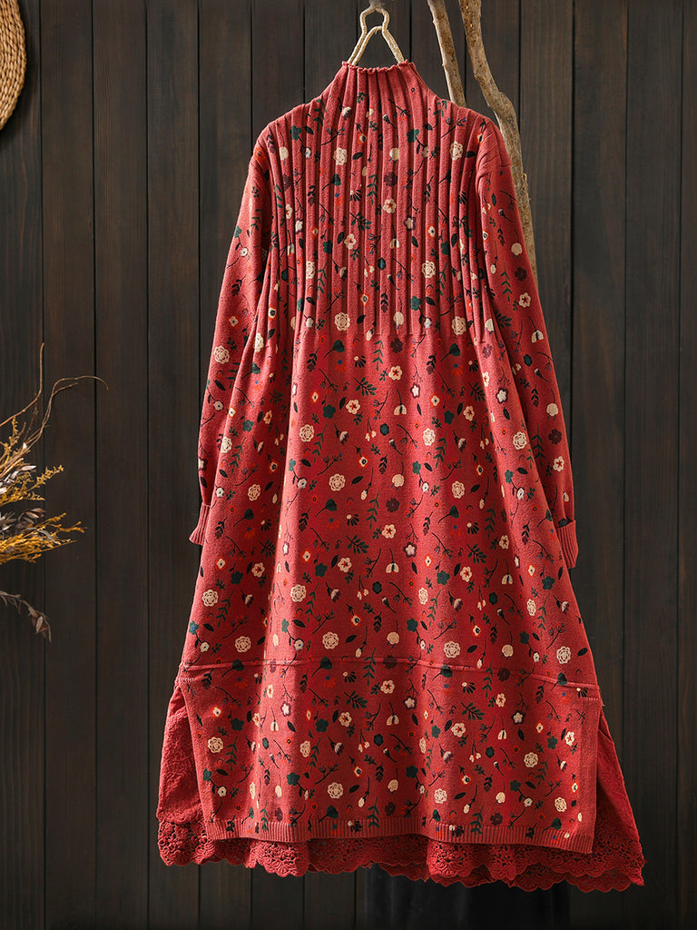 レディース 秋 ヴィンテージ フローラル ハーフタートルネック ニットドレス