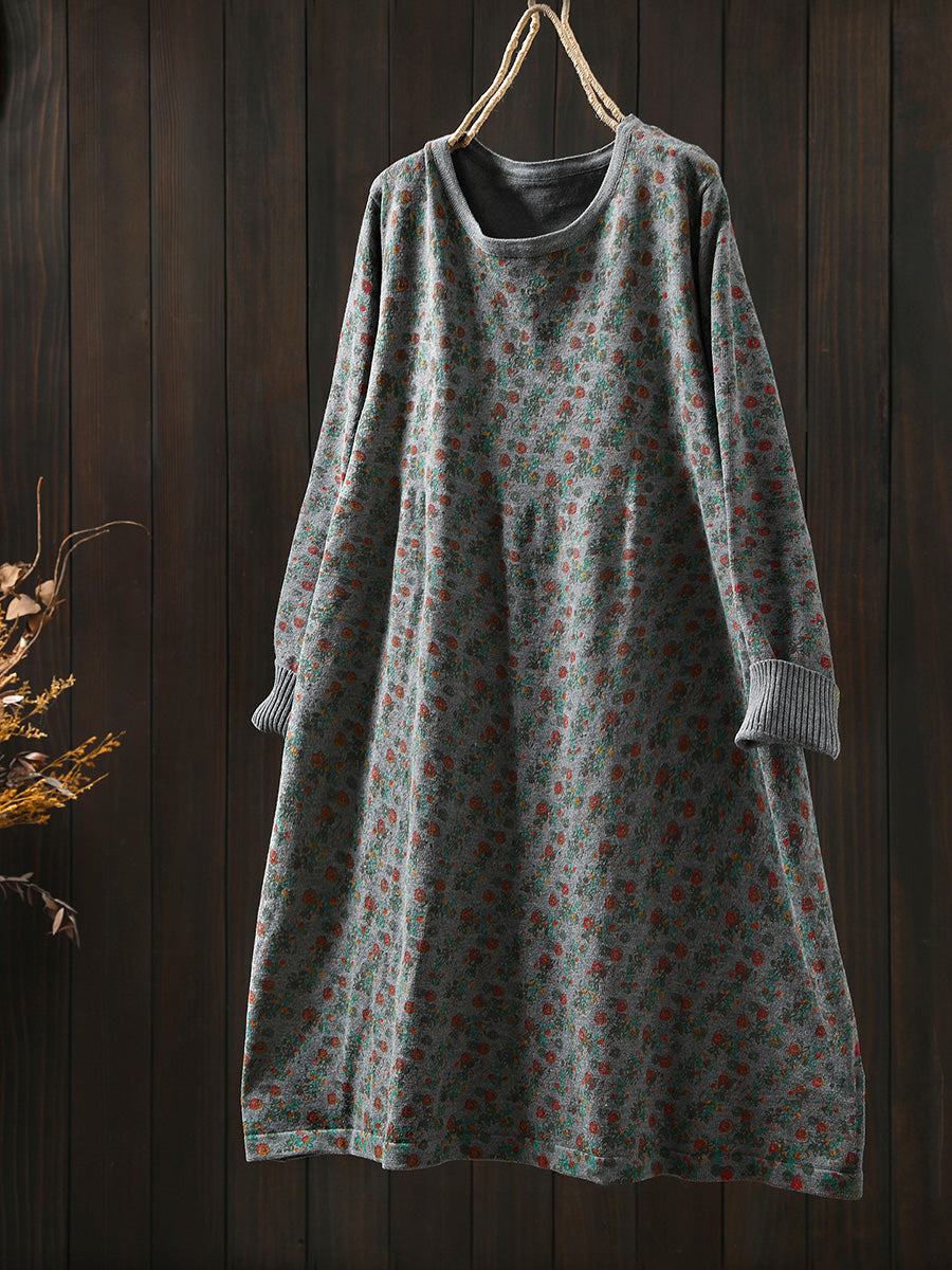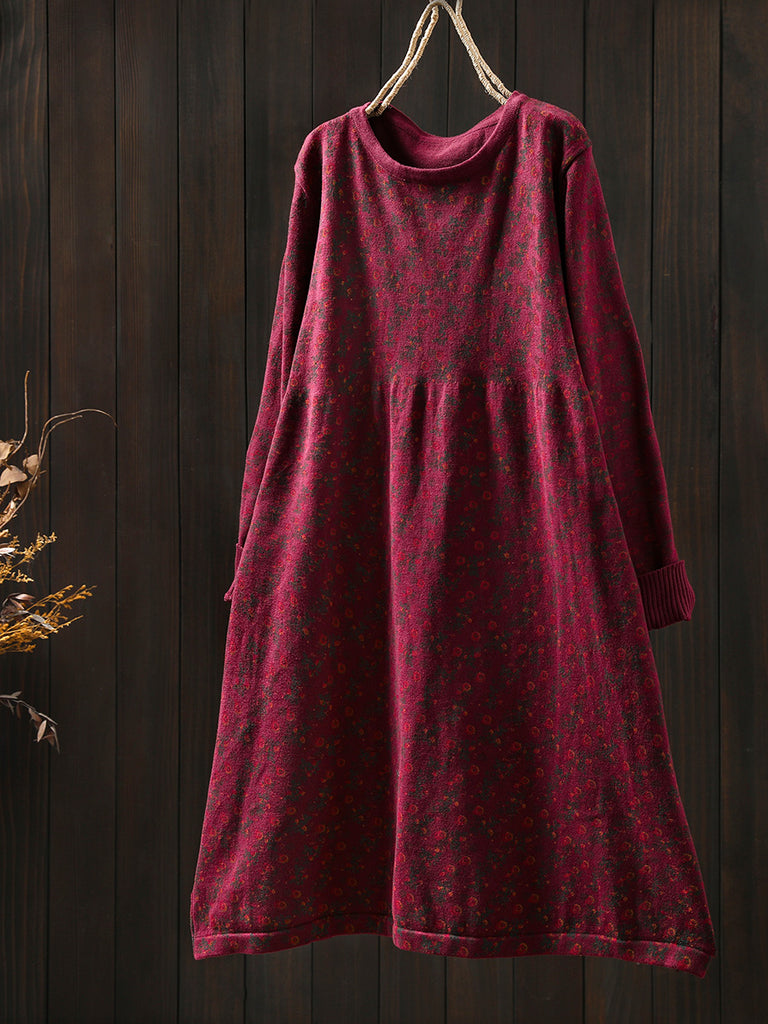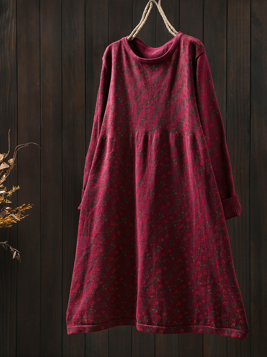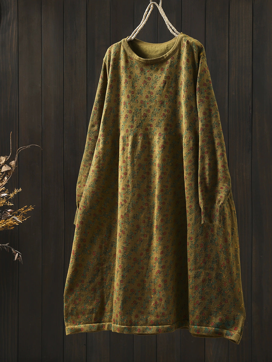 レディース 秋 ヴィンテージ フローラル Oネック ニットドレス