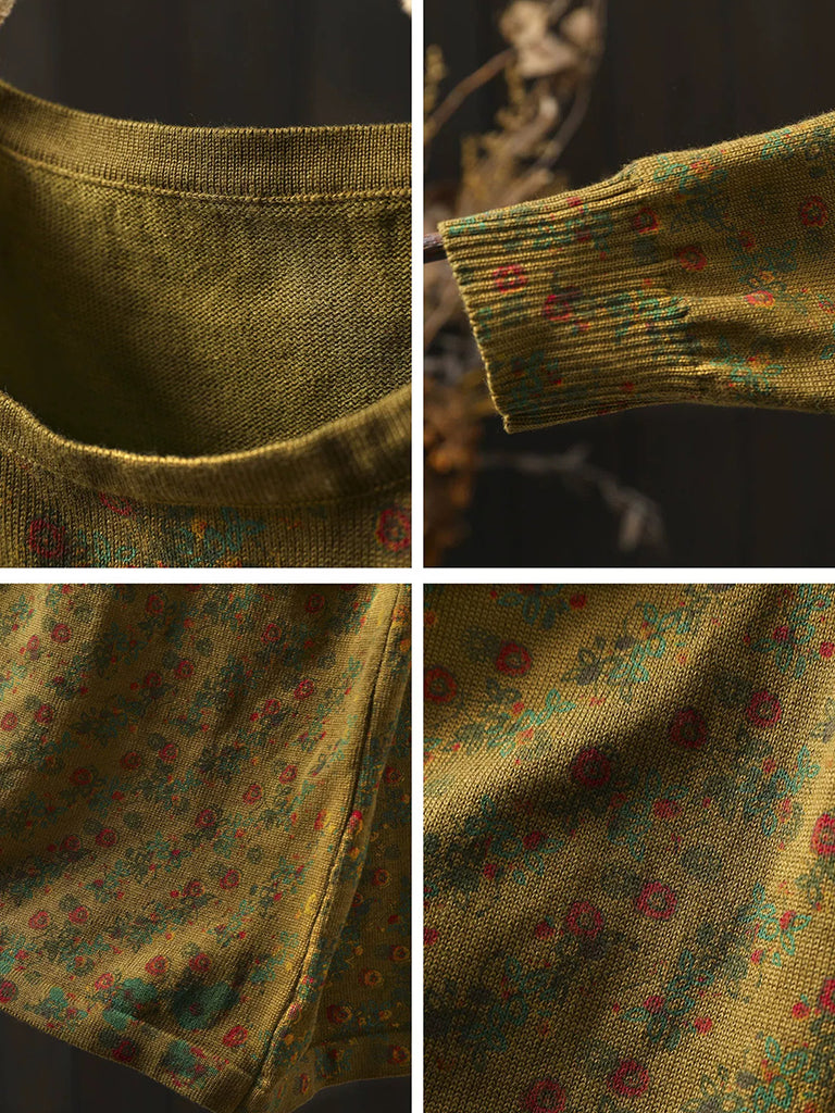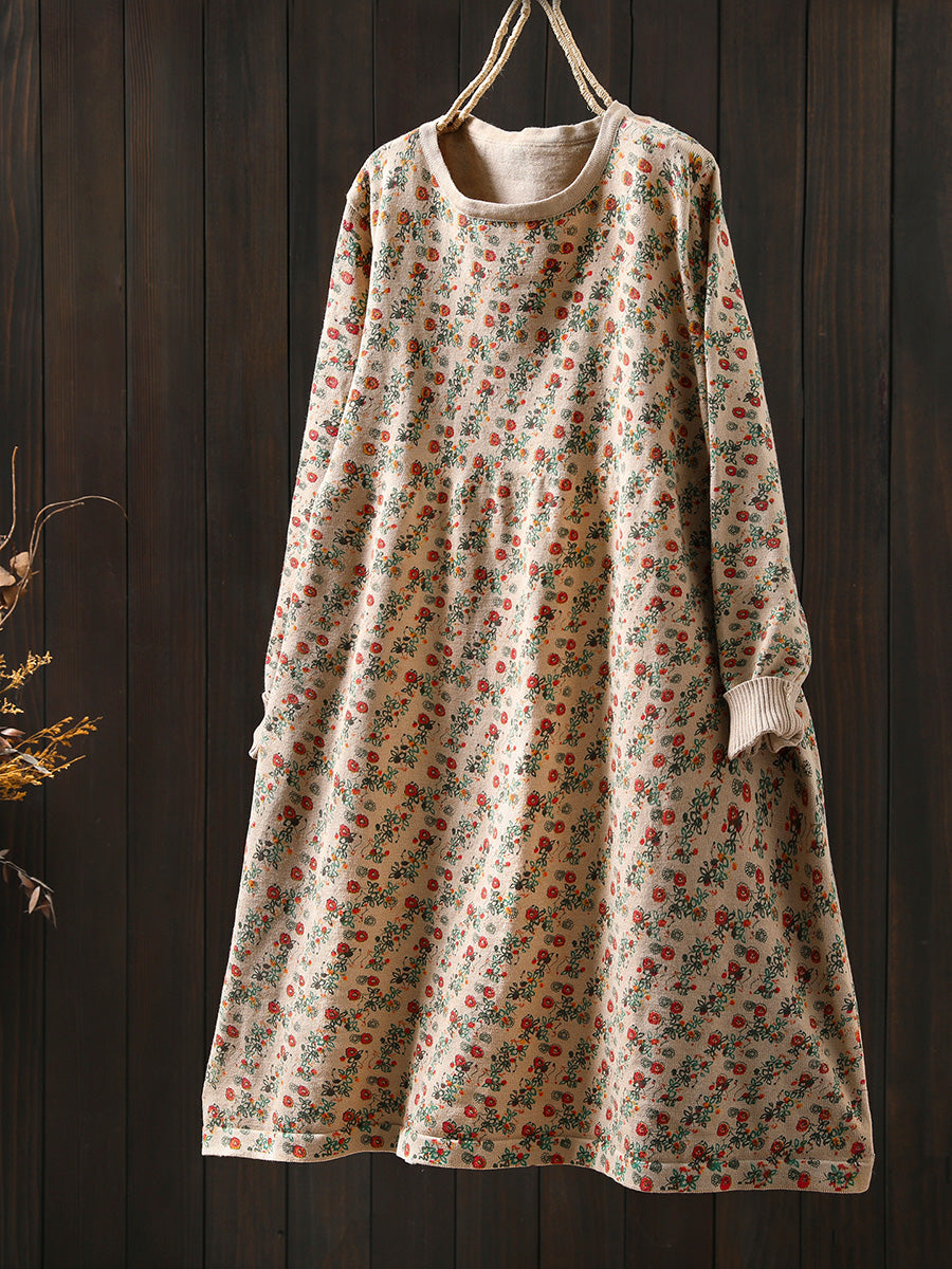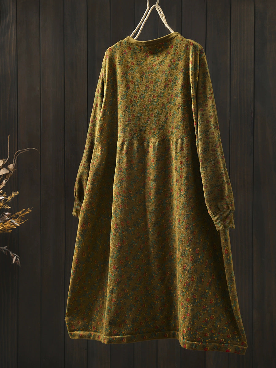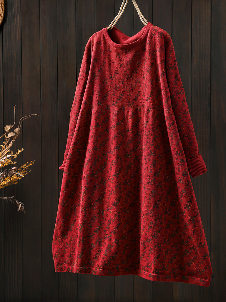 レディース 秋 ヴィンテージ フローラル Oネック ニットドレス