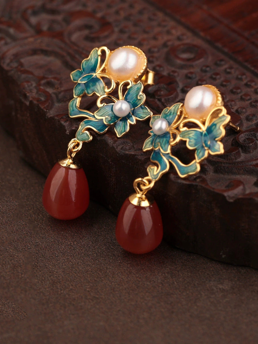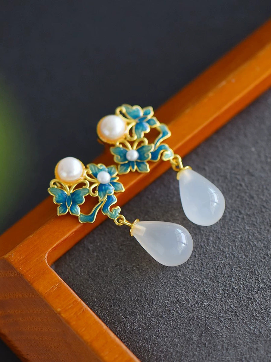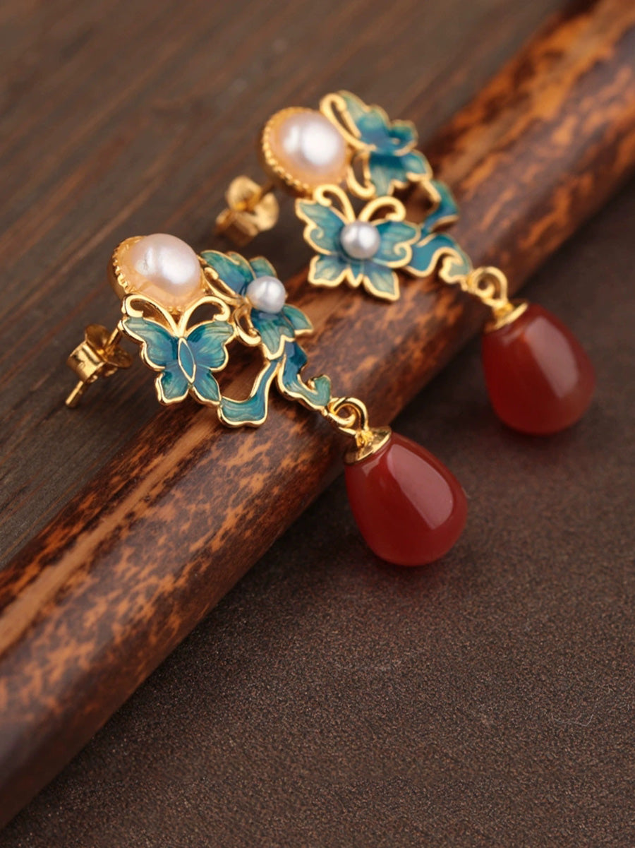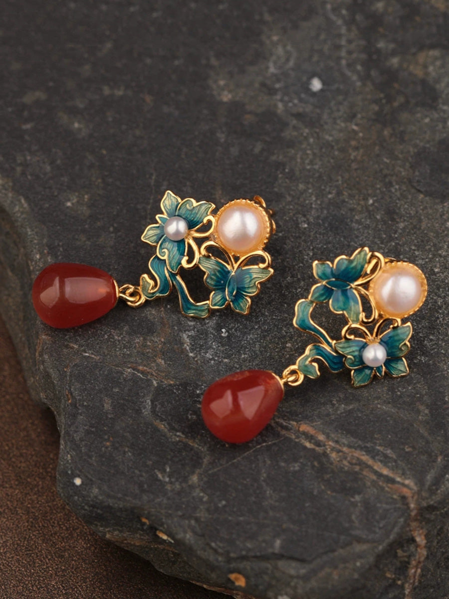 女性用エスニックエナメルバタフライS925シルバーパールアゲートイヤリング