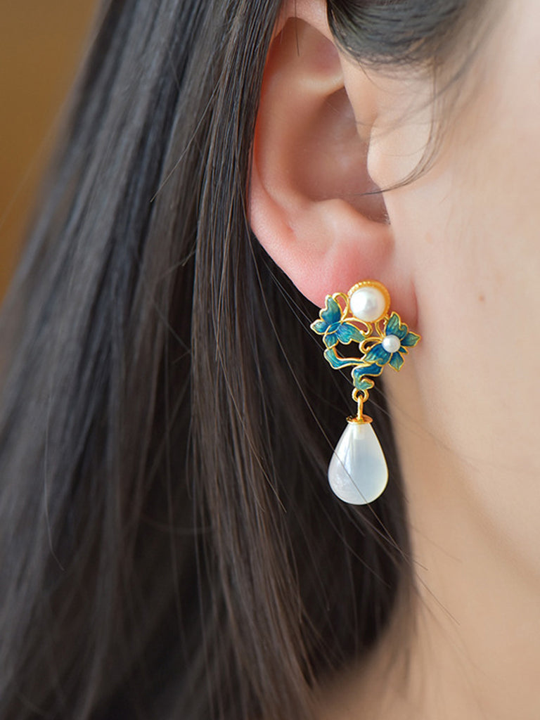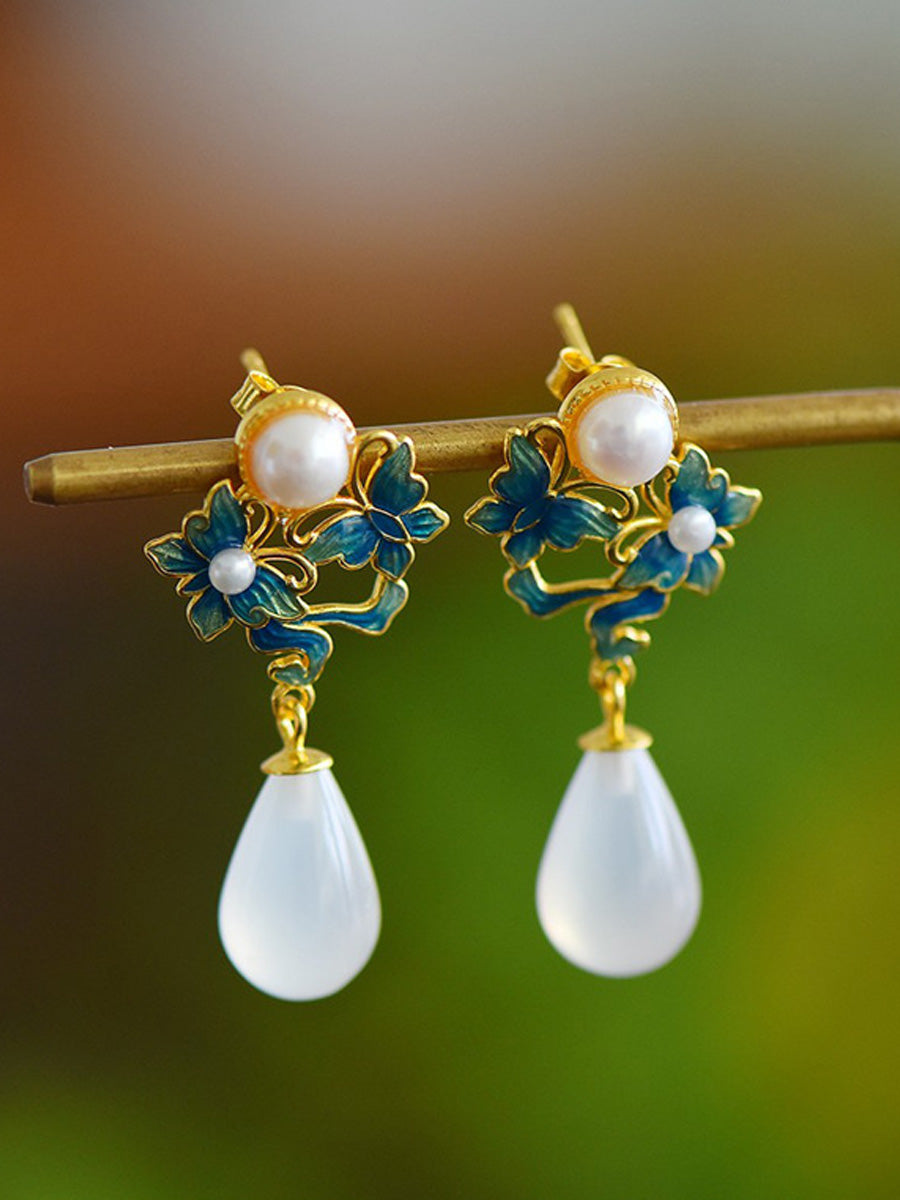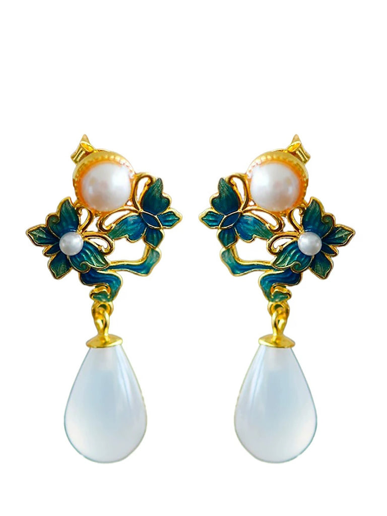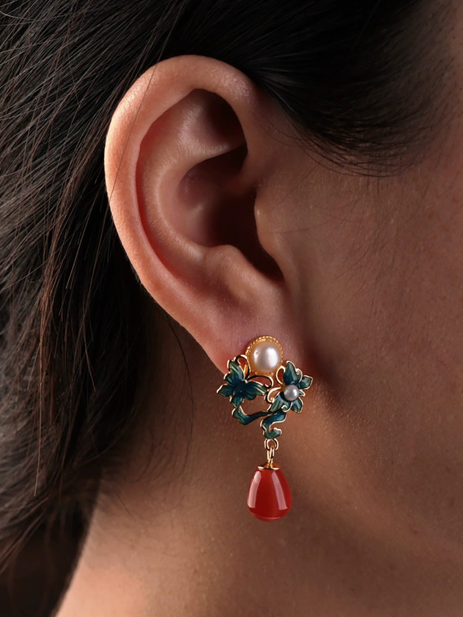 女性用エスニックエナメルバタフライS925シルバーパールアゲートイヤリング