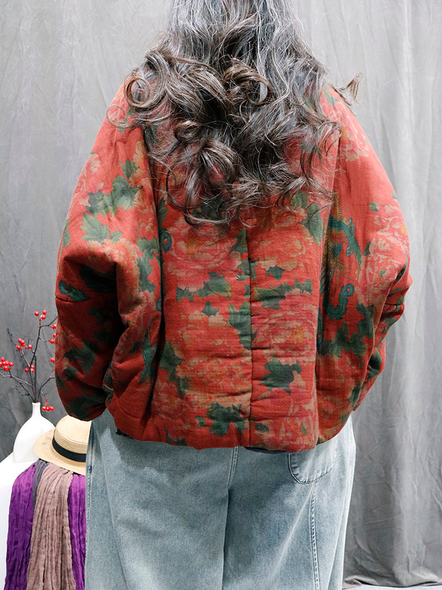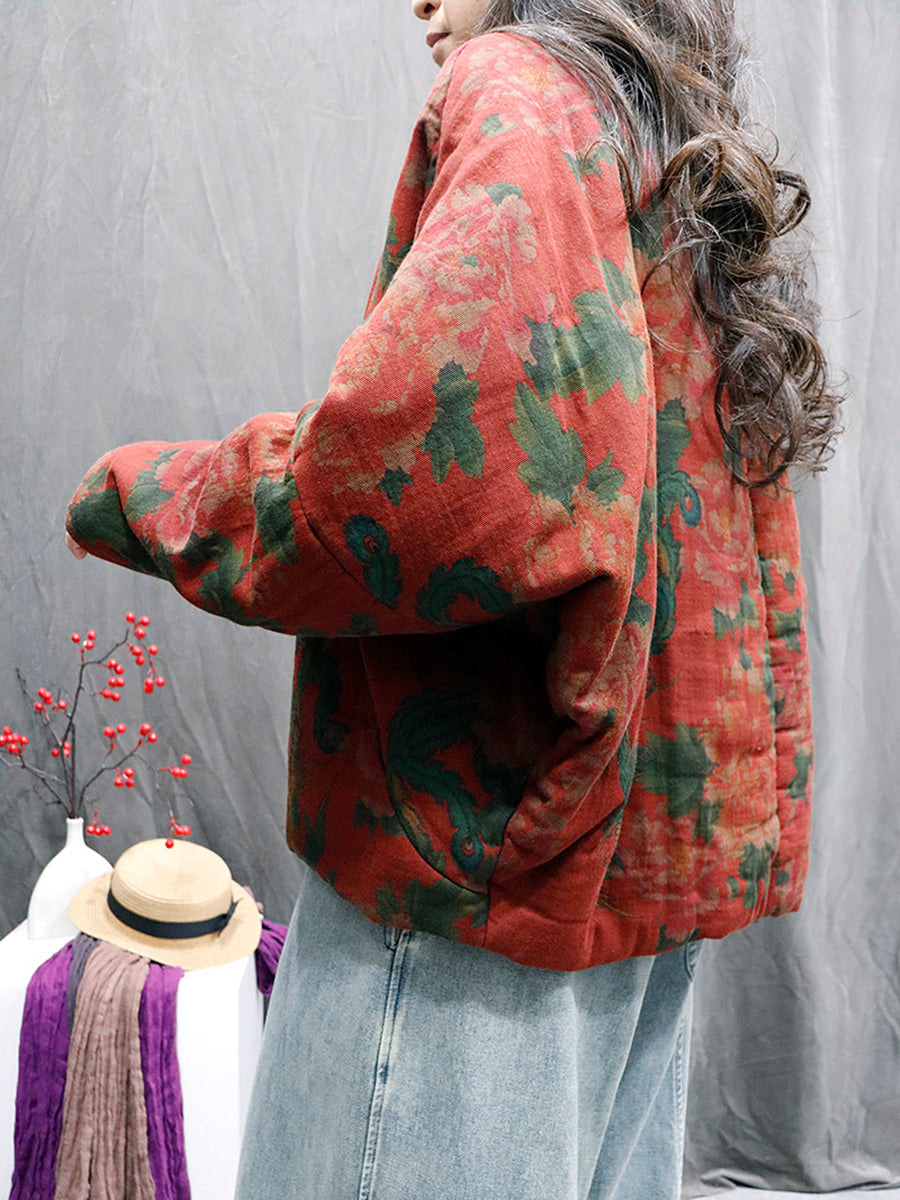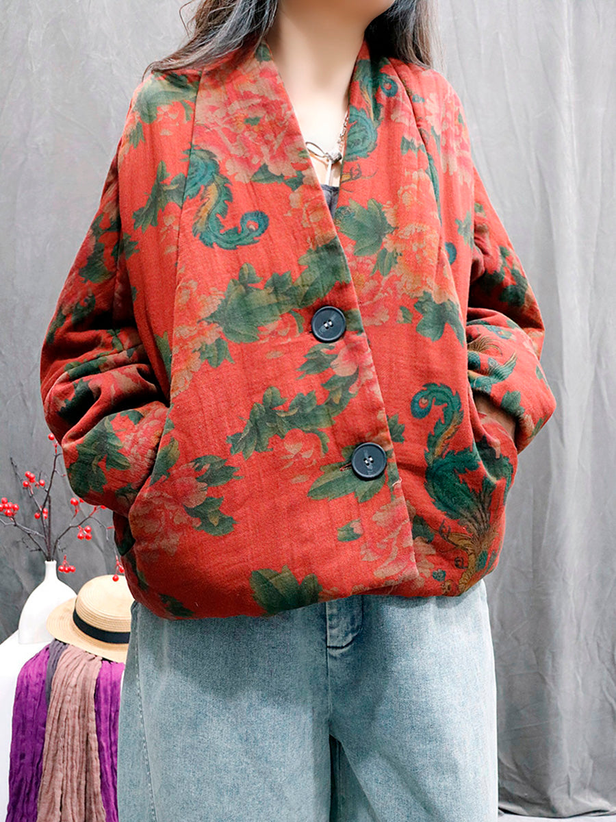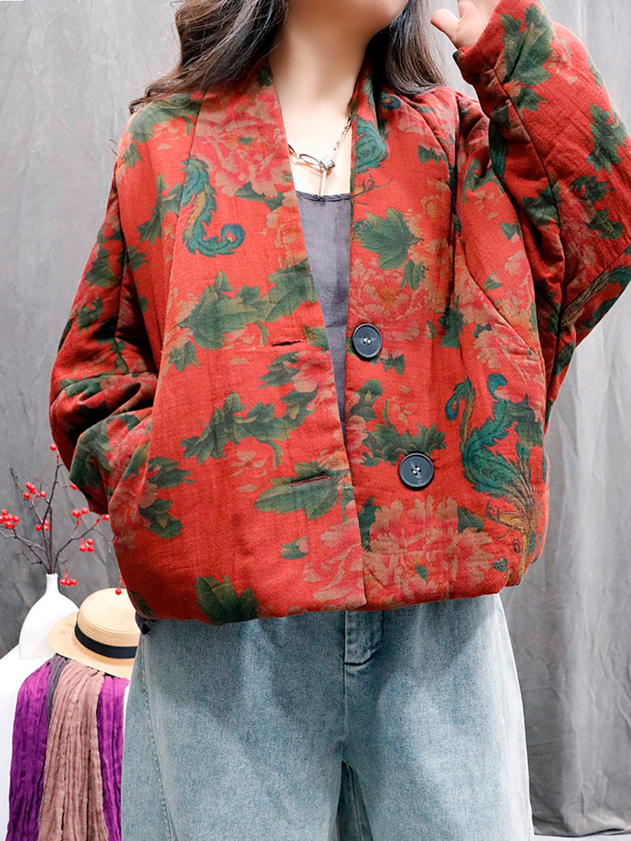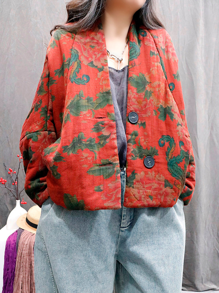 レディース レトロフラワー 100%コットン Vネック パッド入りコート
