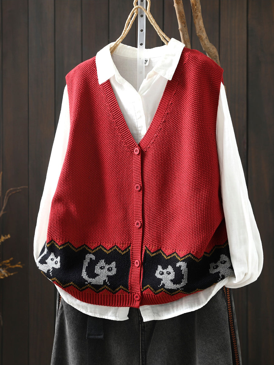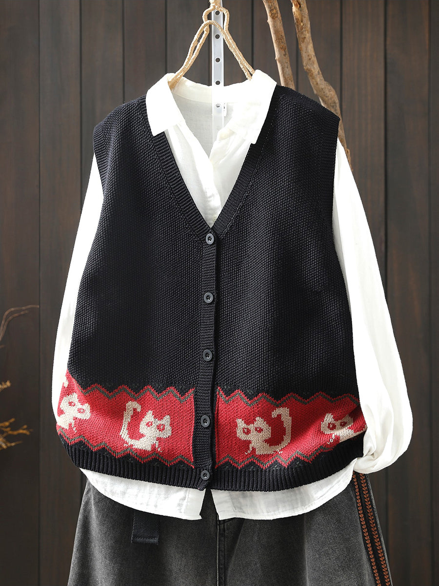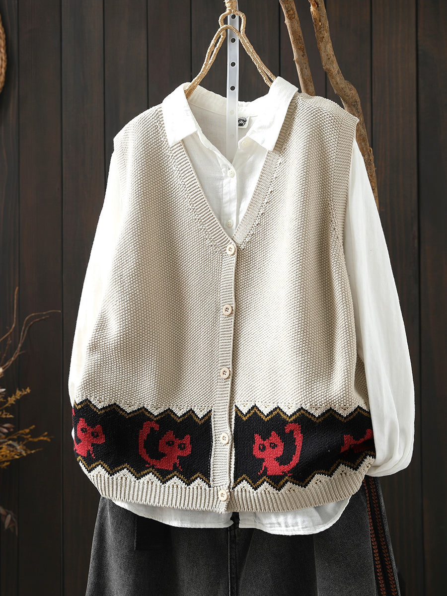 レディース 春 アーティスティック キャット ニット Vネック ベスト