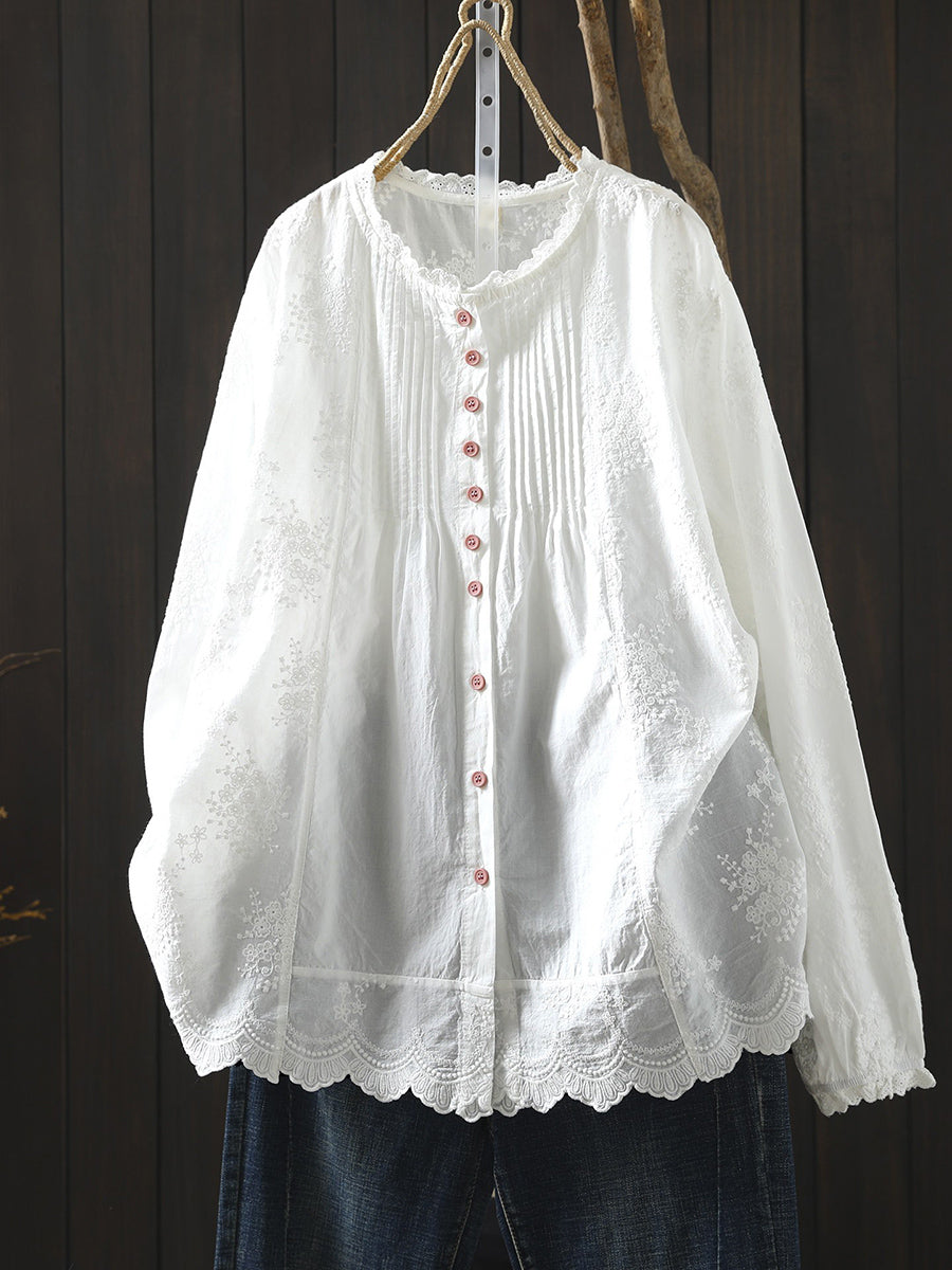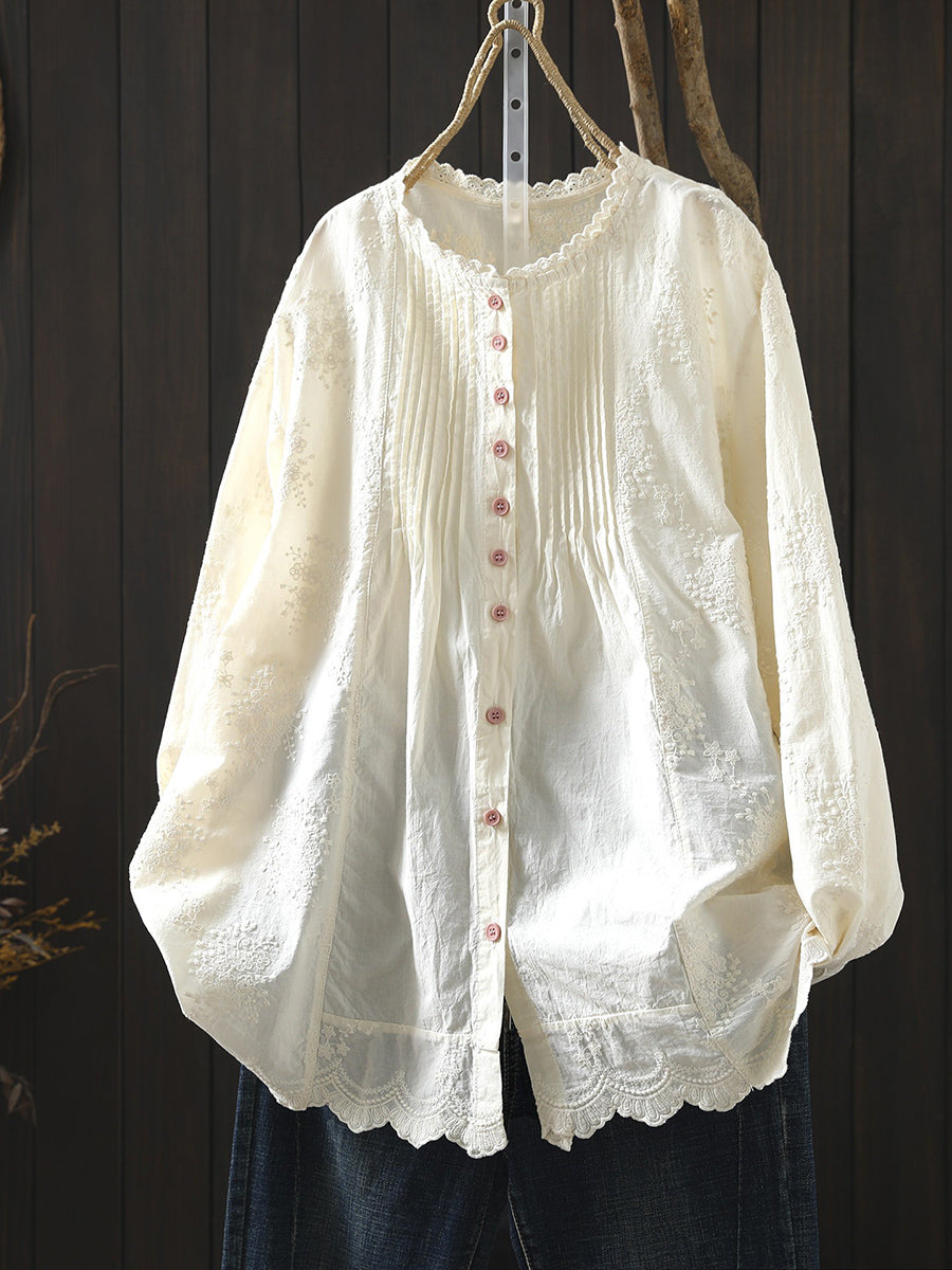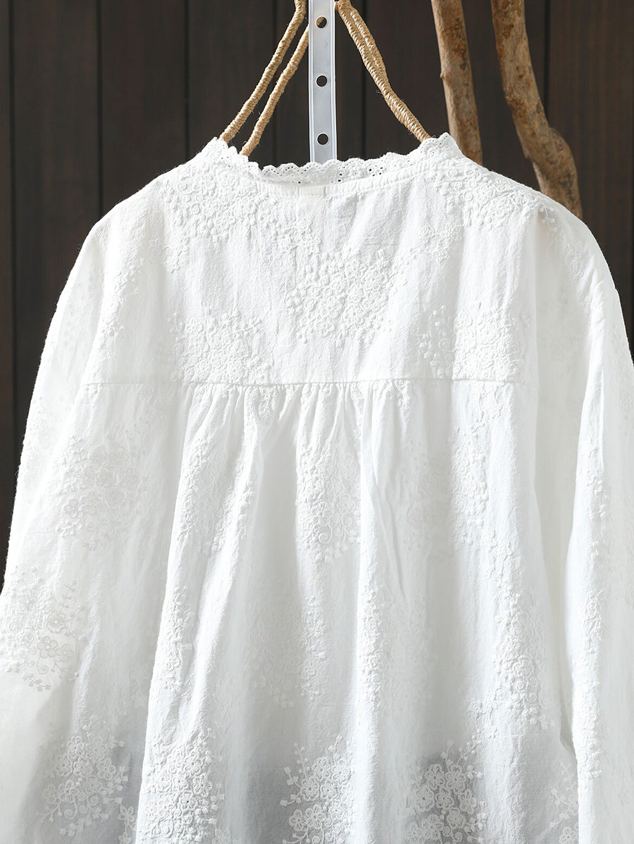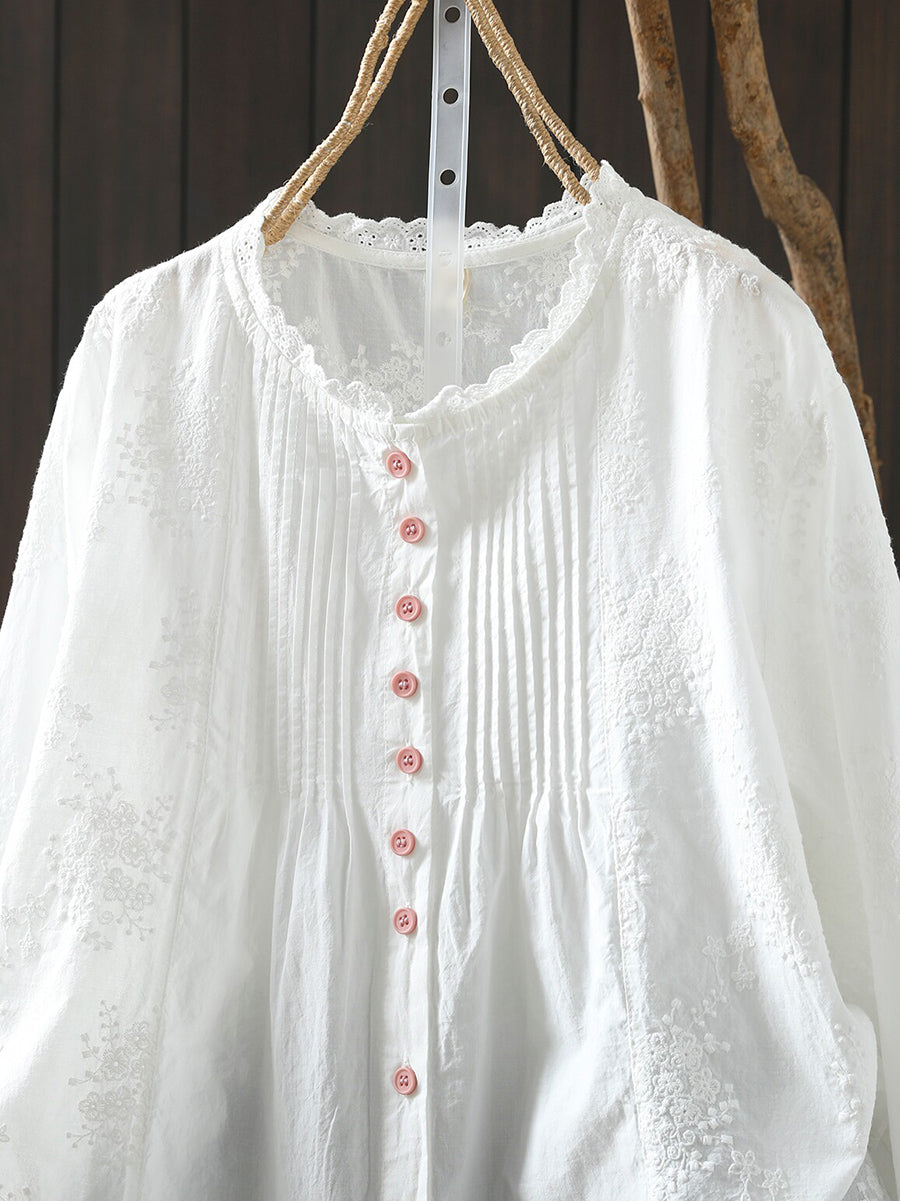 レディース 春 アーティスティック 刺繍 シャーリング 100%コットン シャツ