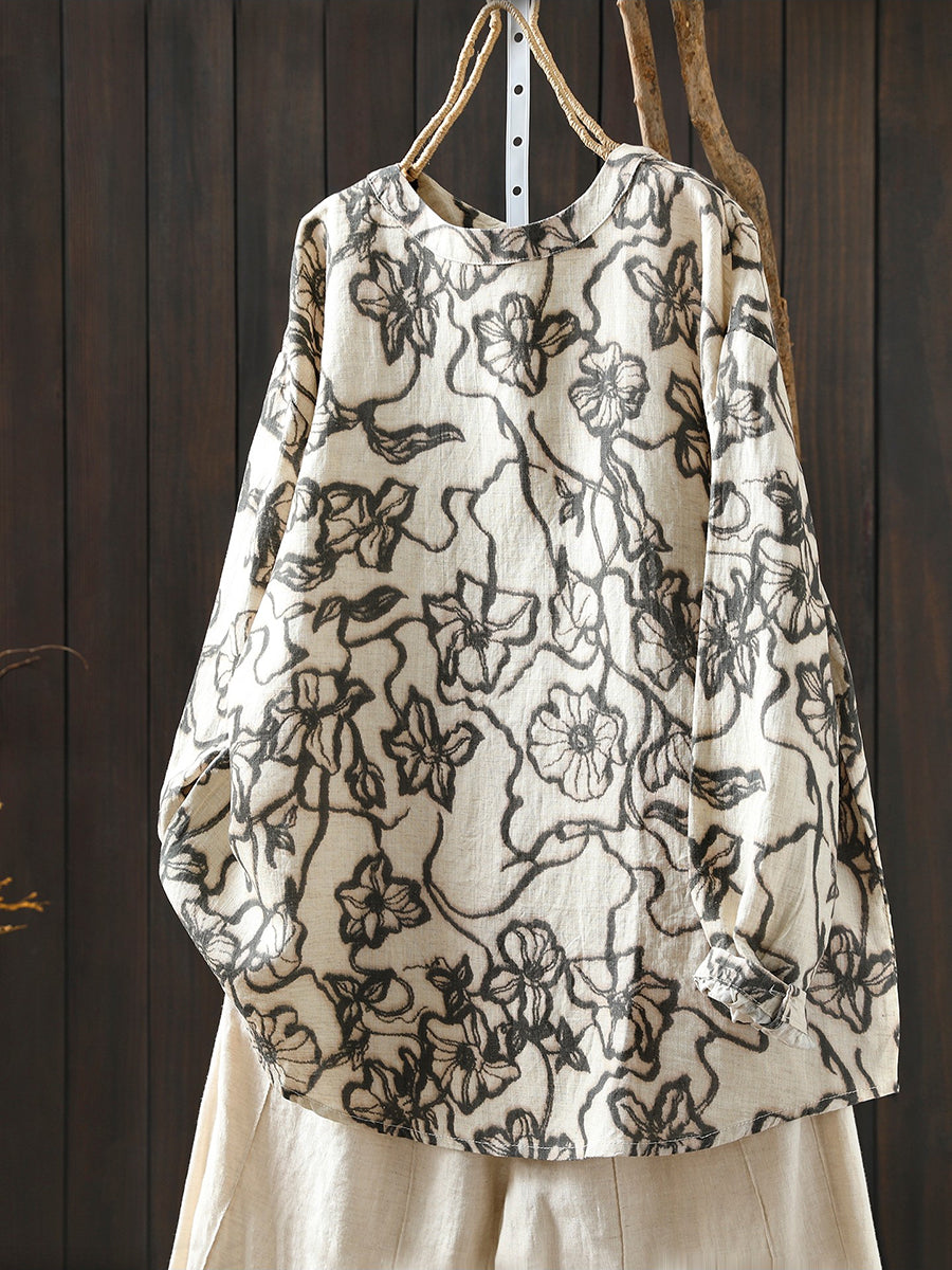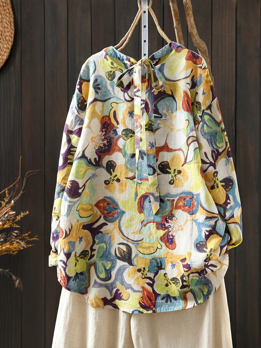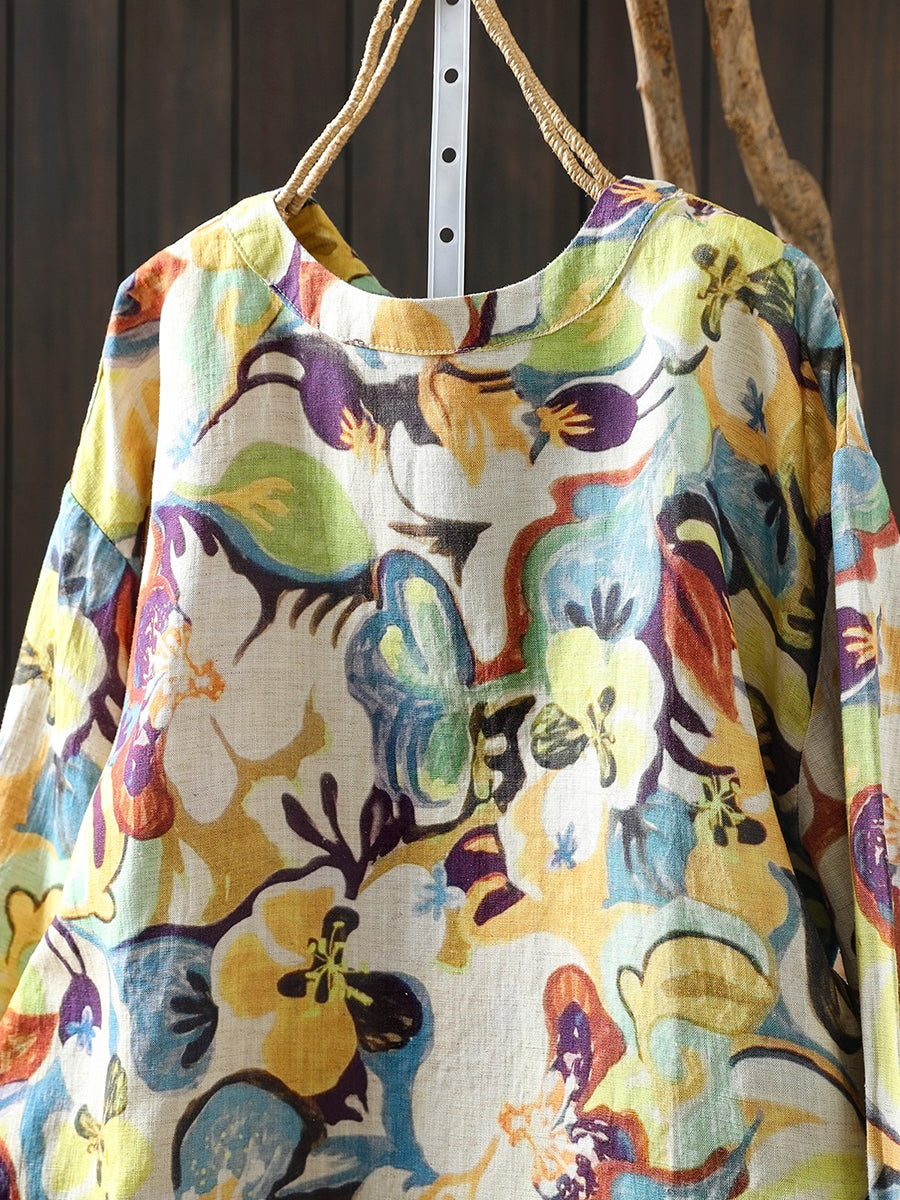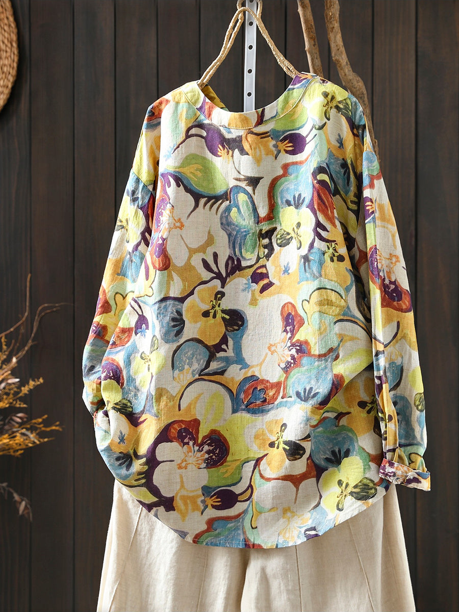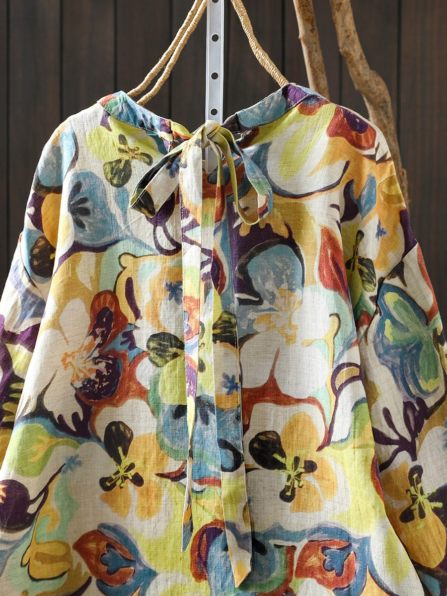レディース 春 アーティスティックフラワー 100%リネン ブラウス