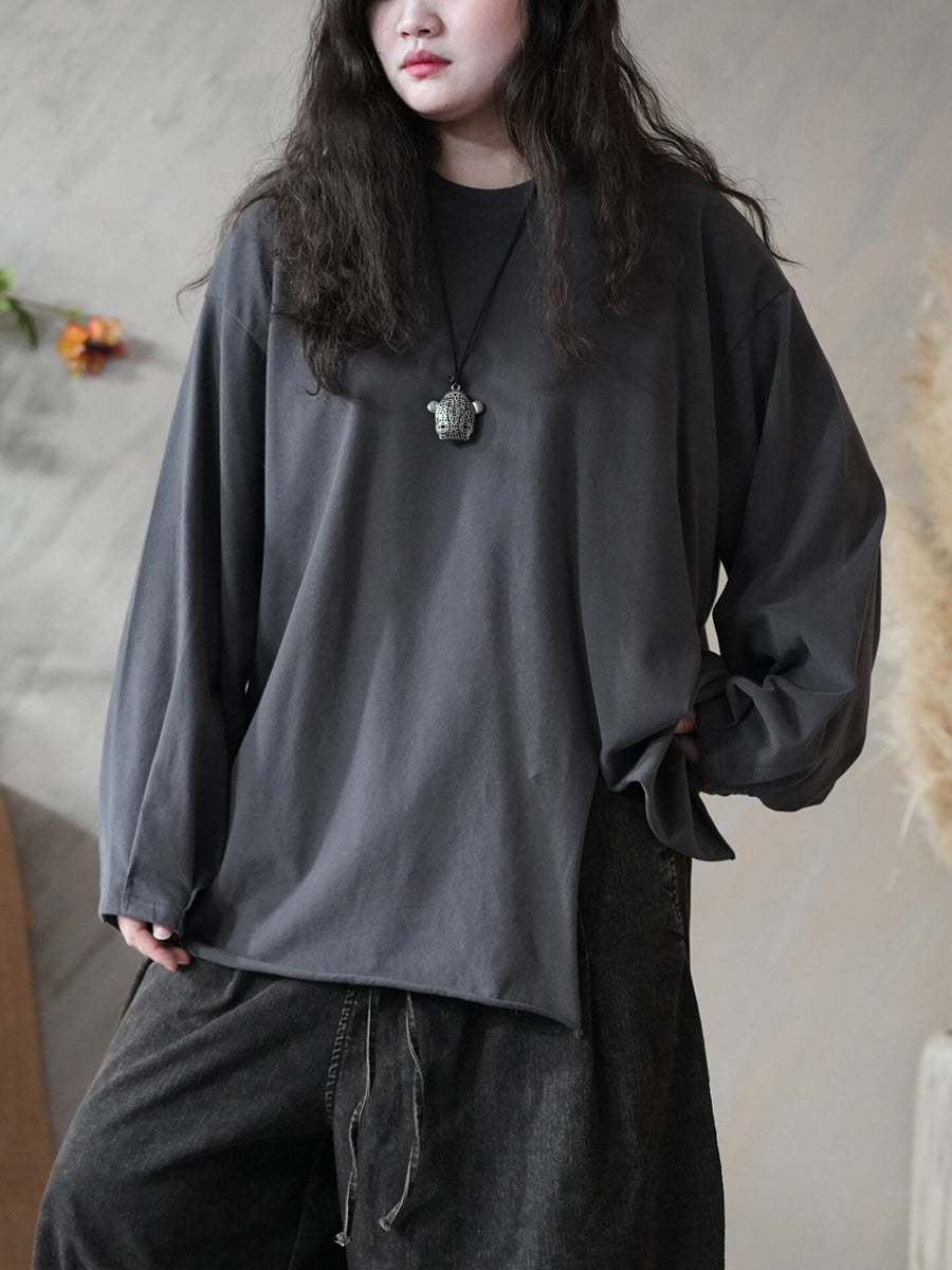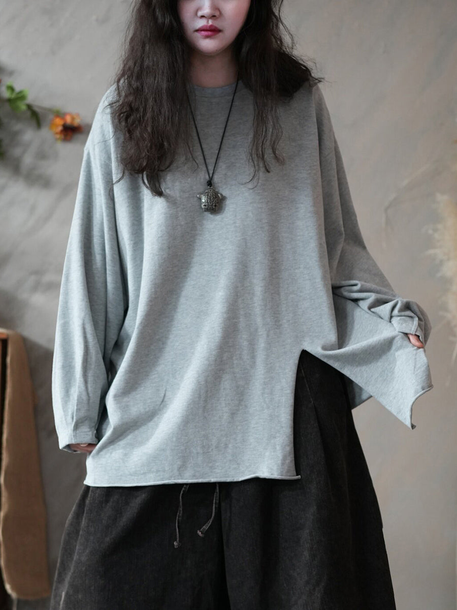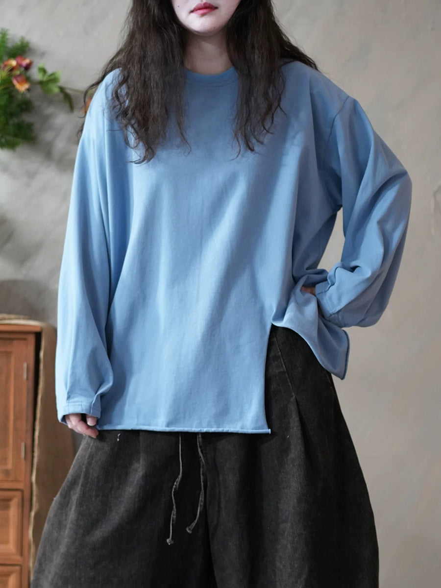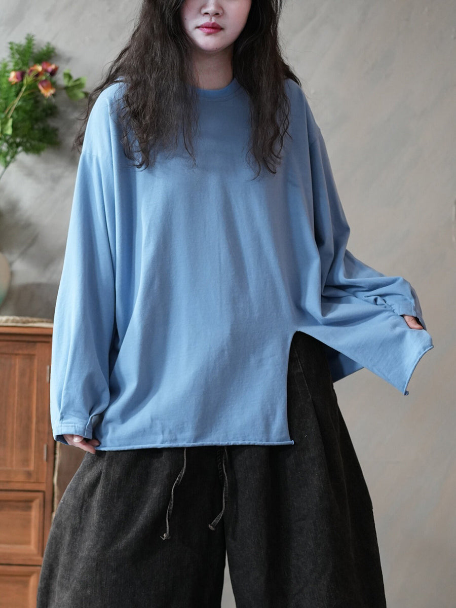 レディース 春 アーティスティック ピュアカラー スプリットヘム Oネック ブラウス