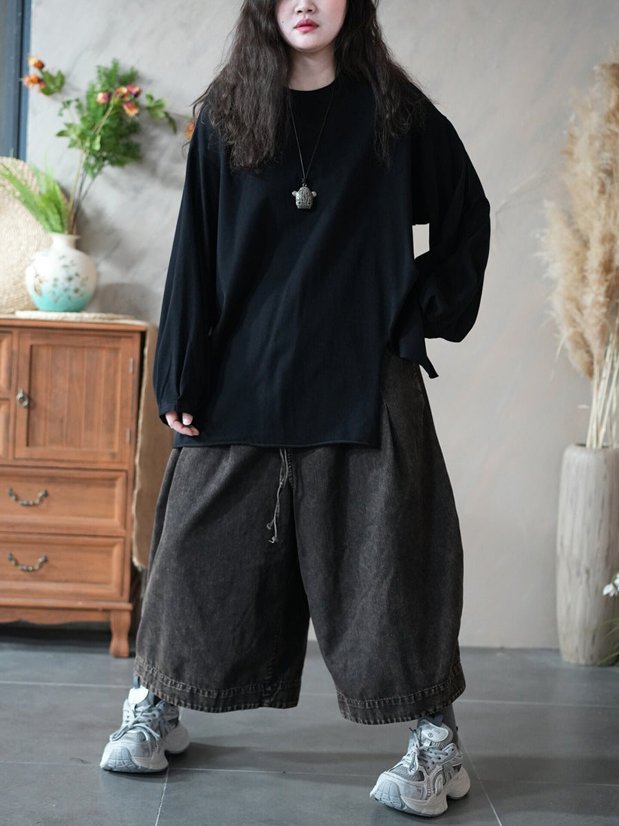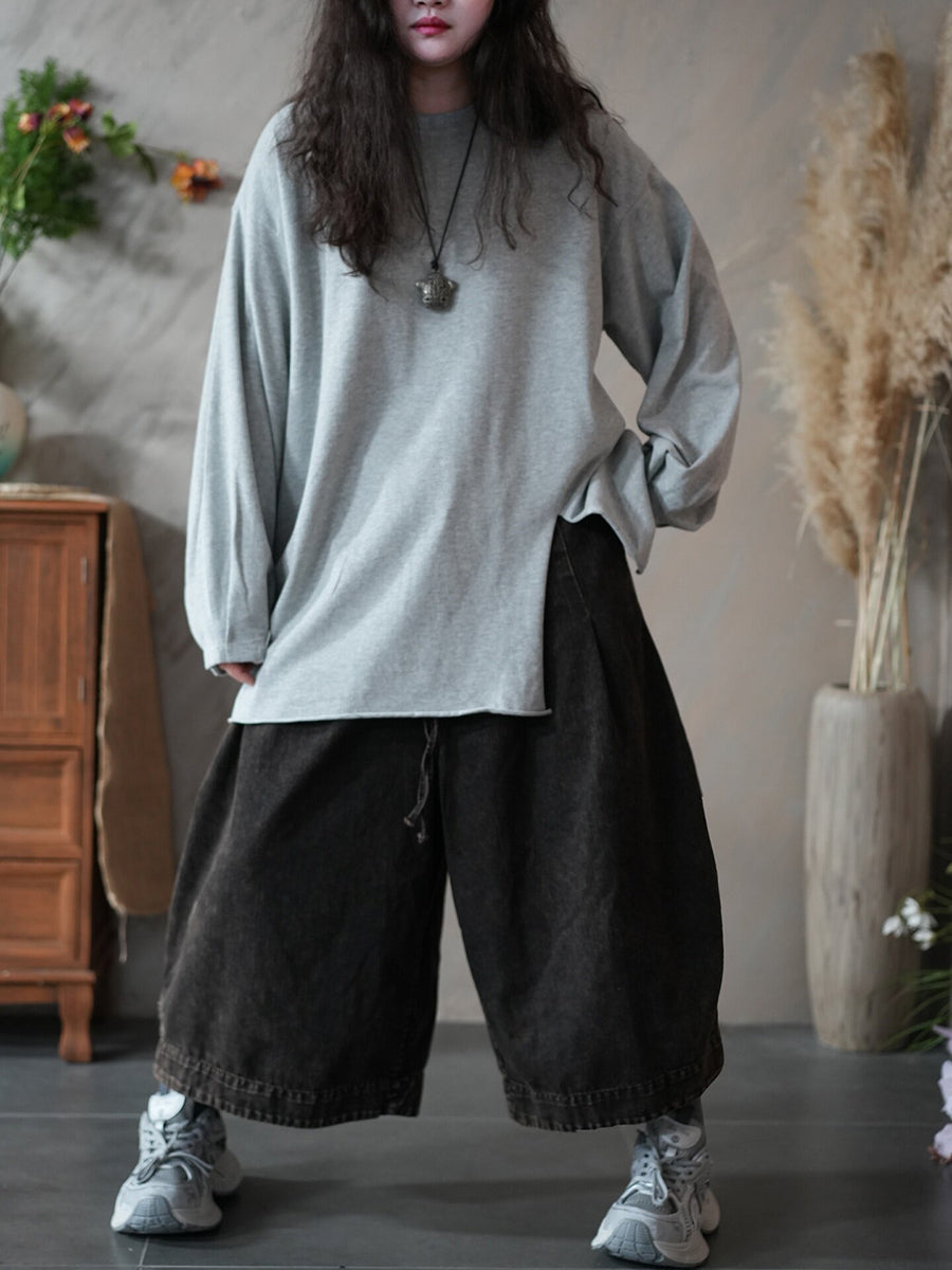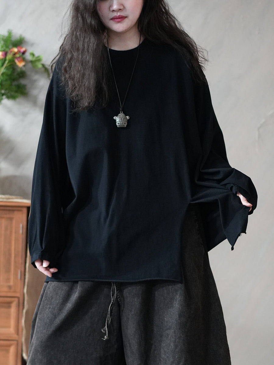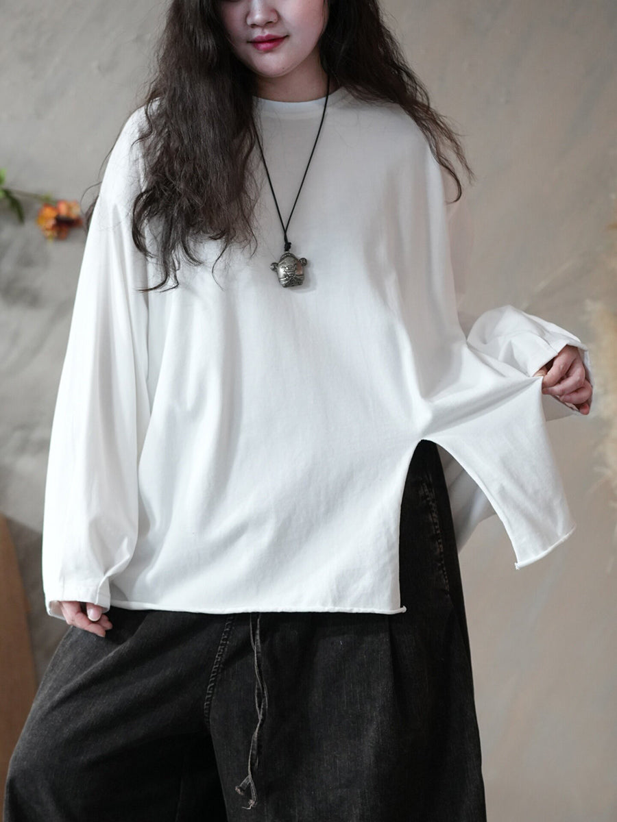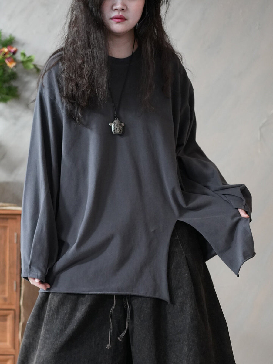 レディース 春 アーティスティック ピュアカラー スプリットヘム Oネック ブラウス