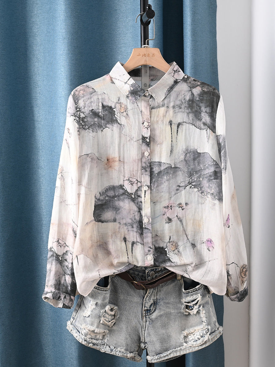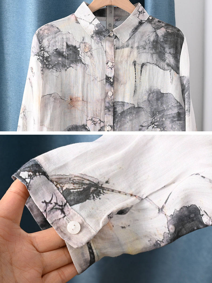 レディース 春 水墨画 100%ラミー シャツ