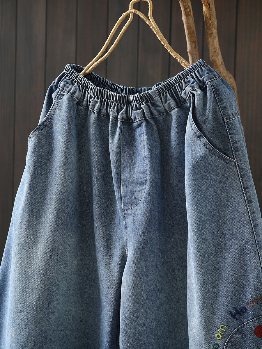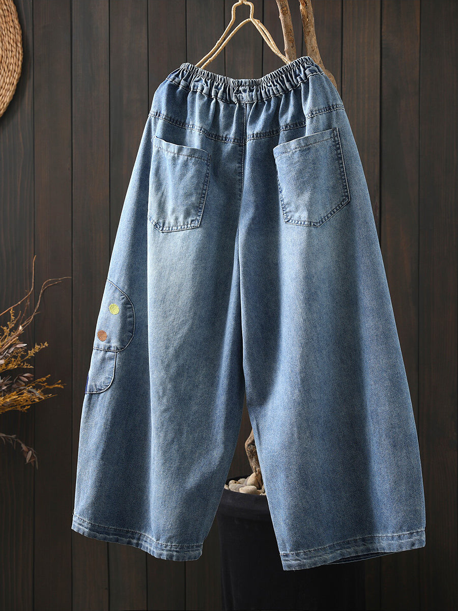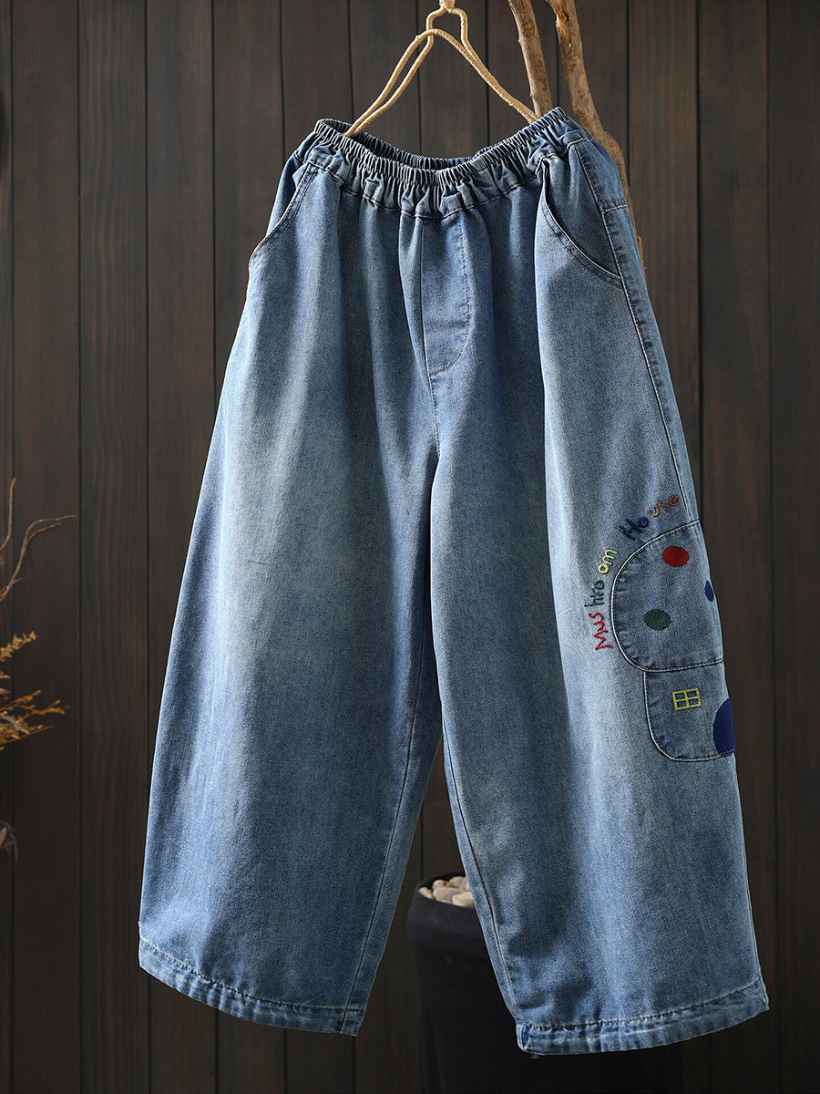 レディース 春 レトロ 刺繍 デニム ワイドレッグ パンツ