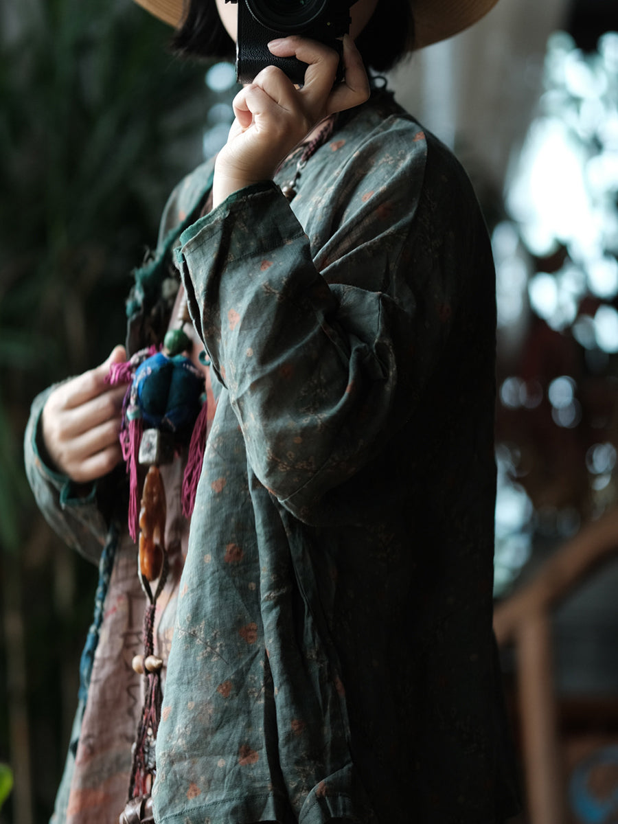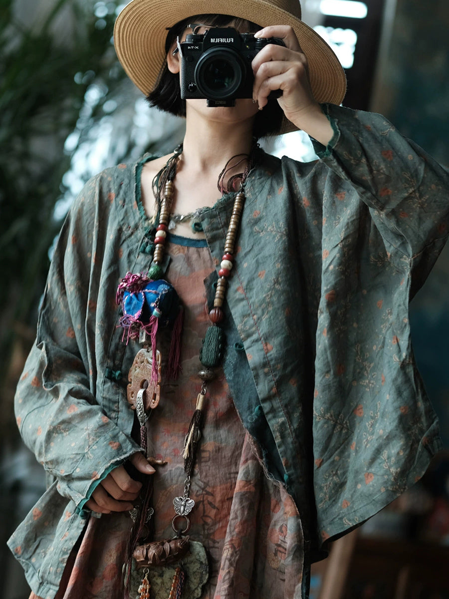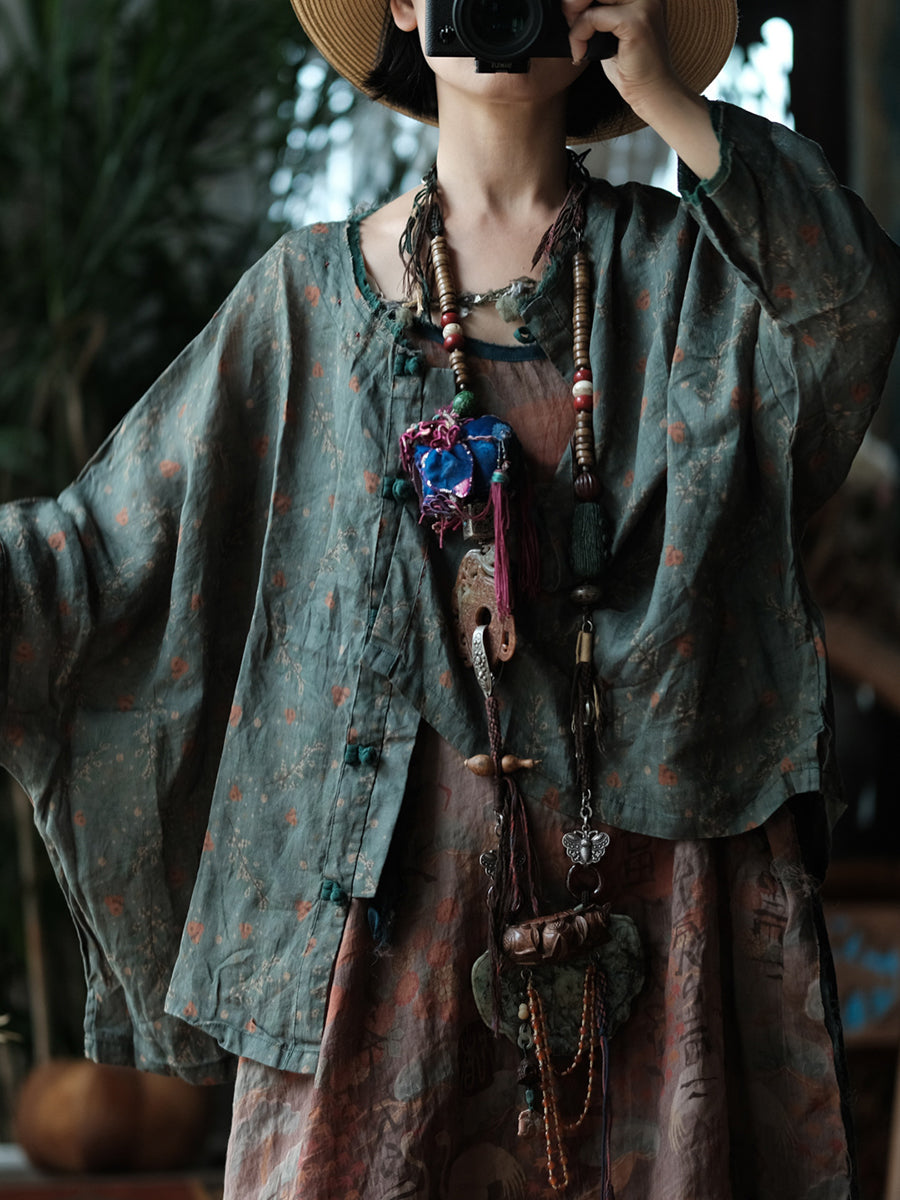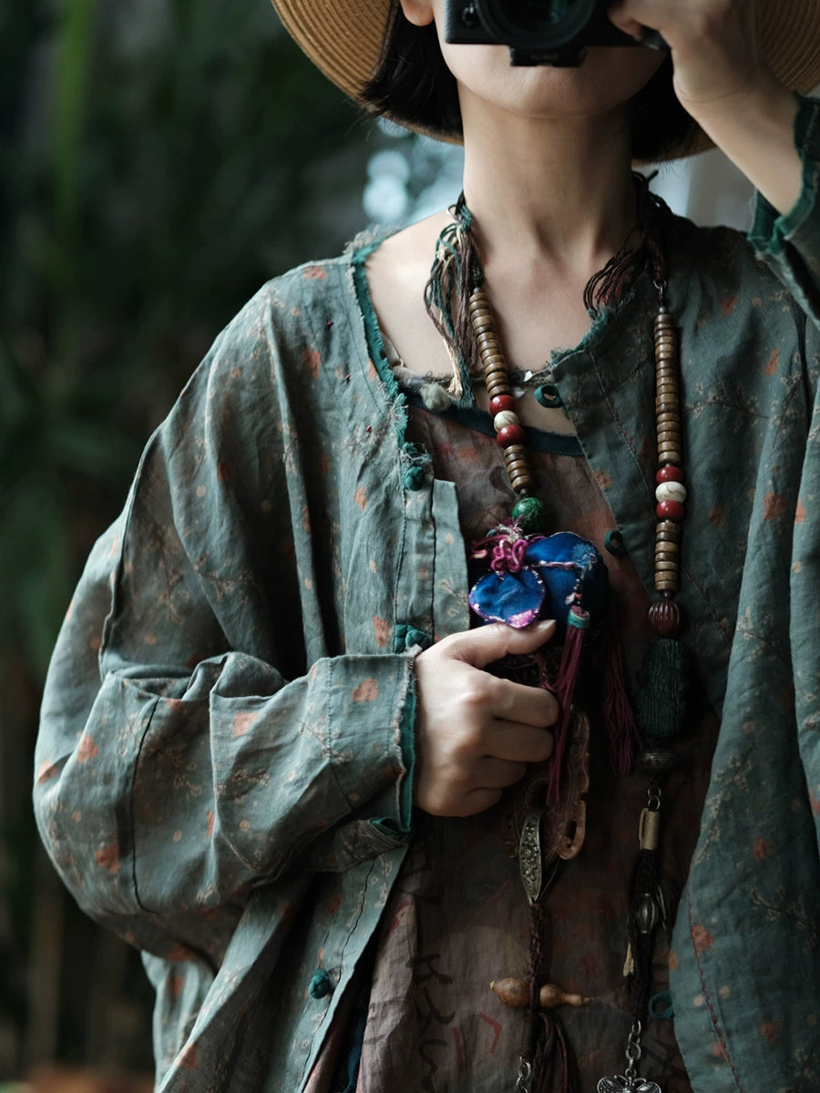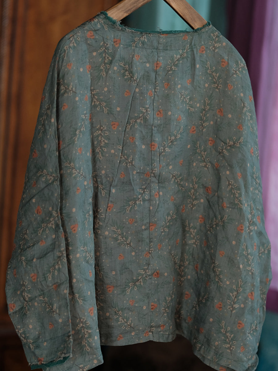 レディース 春 レトロ フローラル Oネック リネンシャツ