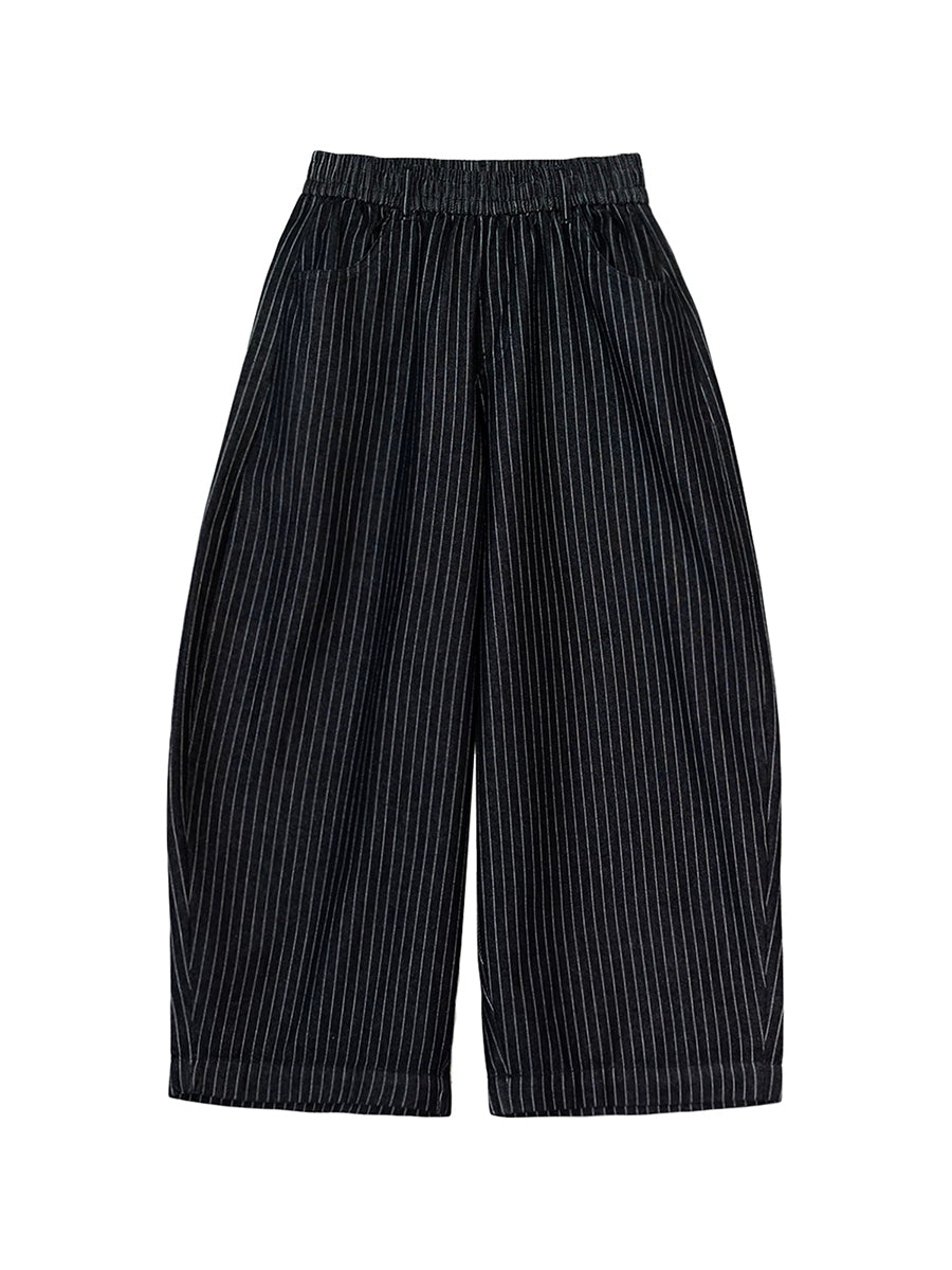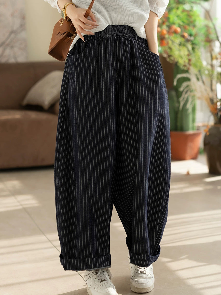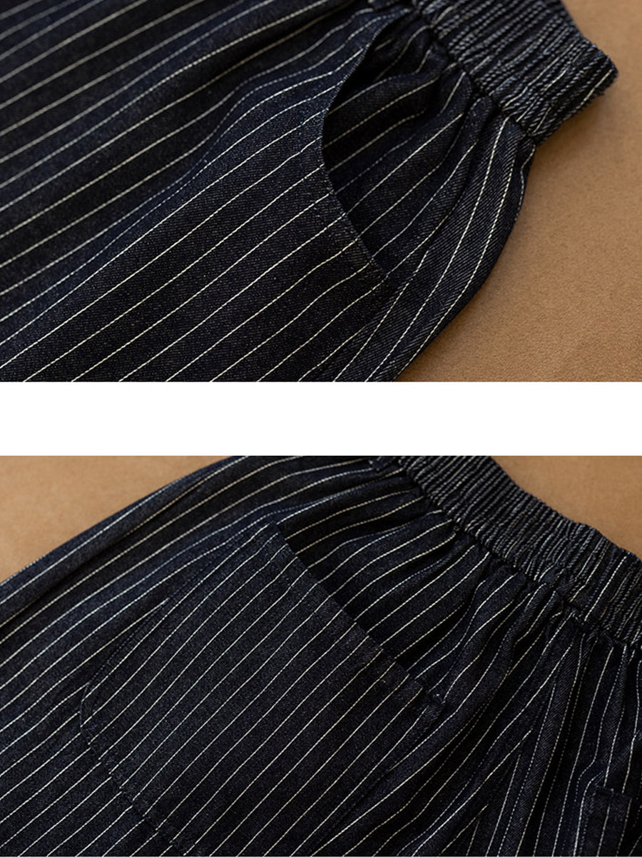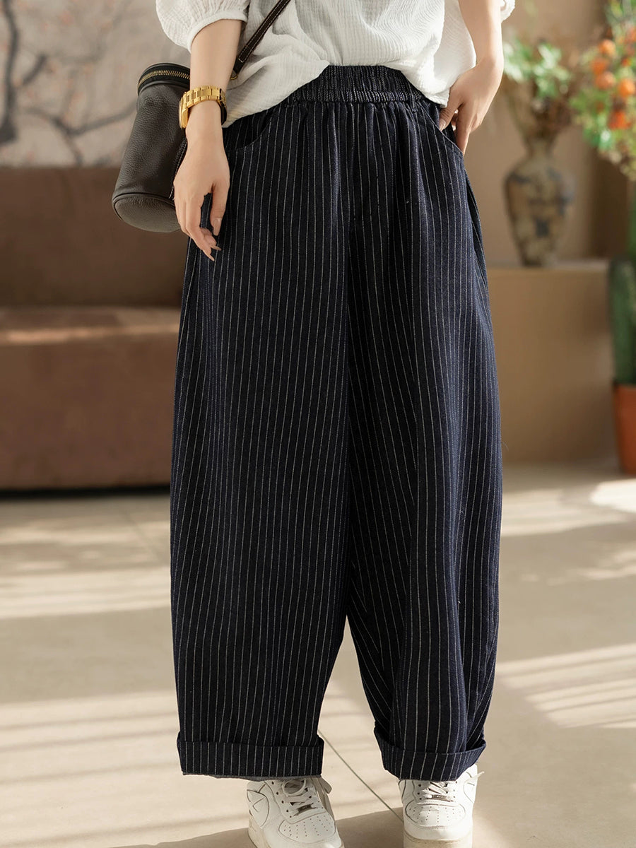 レディース 春 ヴィンテージ コットン ストライプ ワイドレッグパンツ